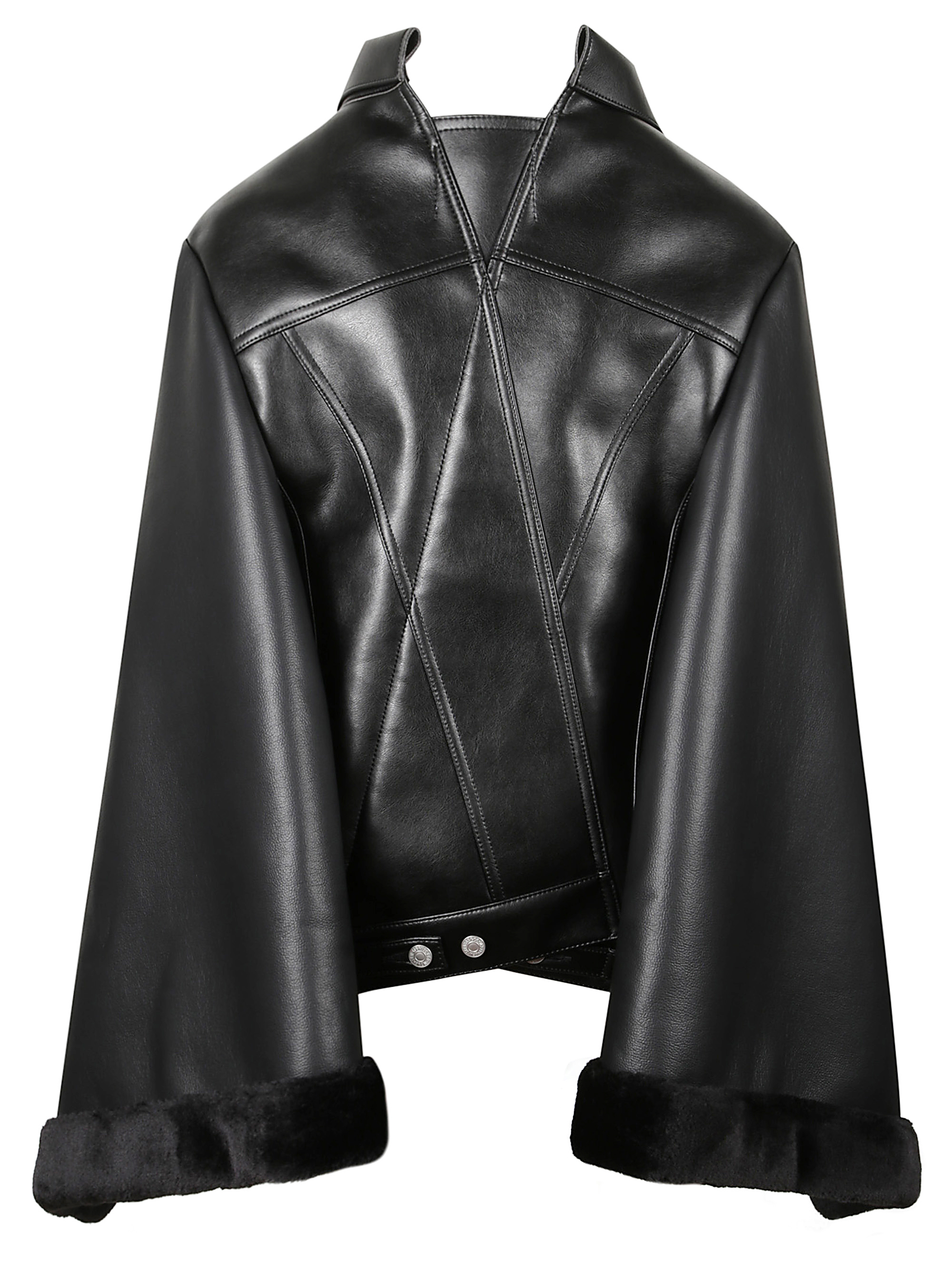 Black leather jacket by JUNYA WATANABE X LEVIS featuring a batwing style with faux fur details.