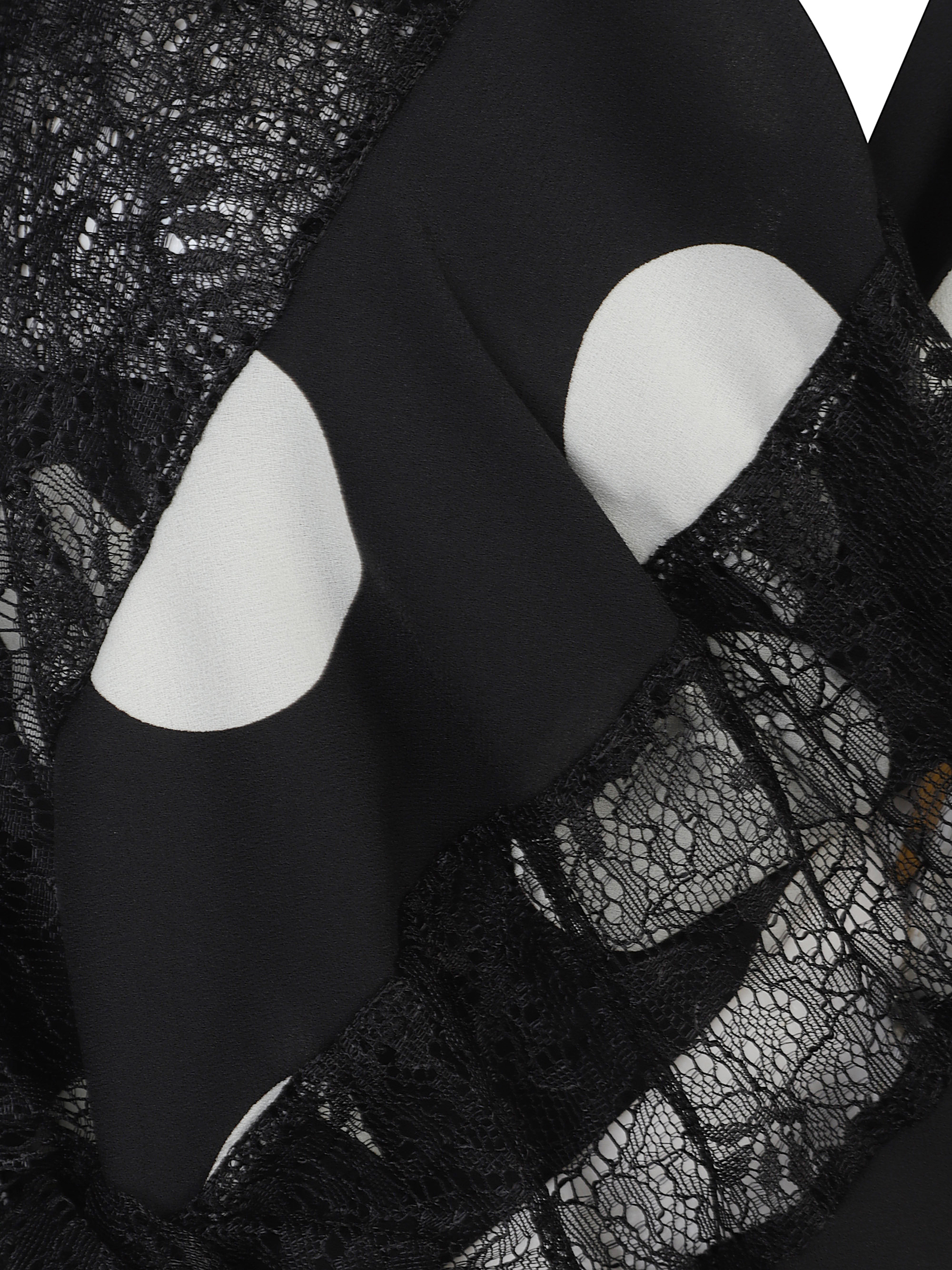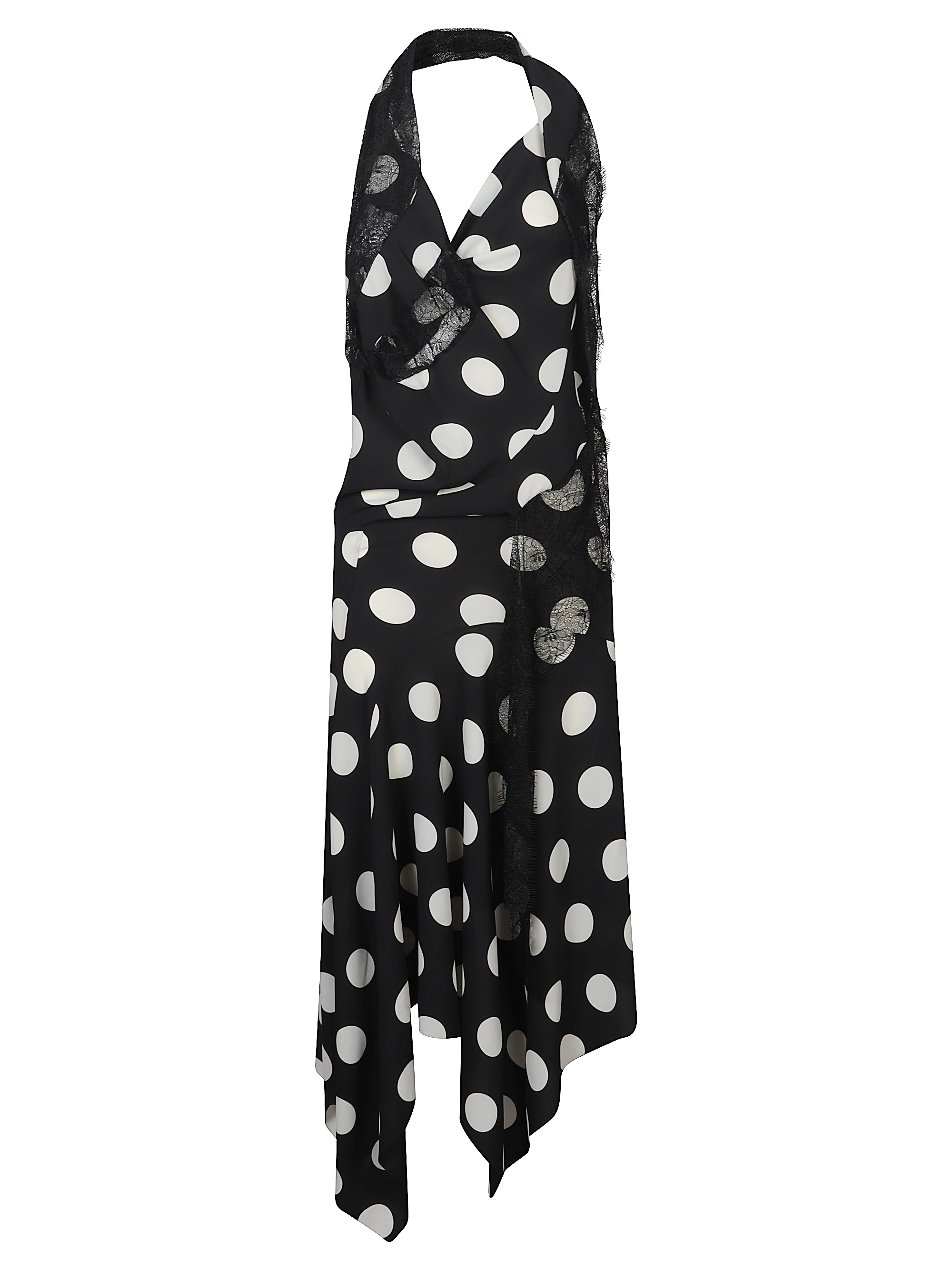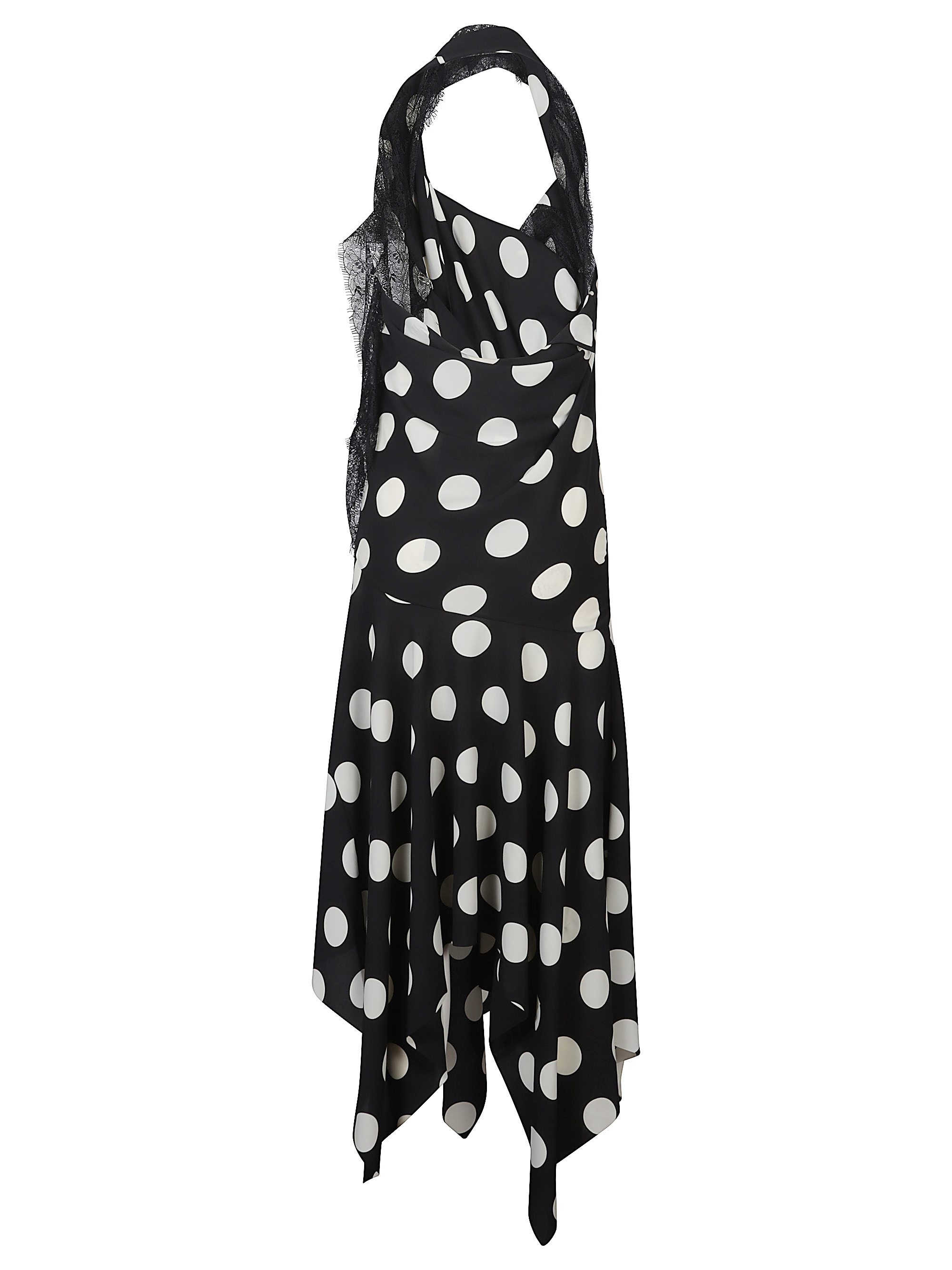 Black polka dot midi dress by JUNYA WATANABE in nylon and rayon, featuring an asymmetric hem, lace inserts and a polka dot motif.