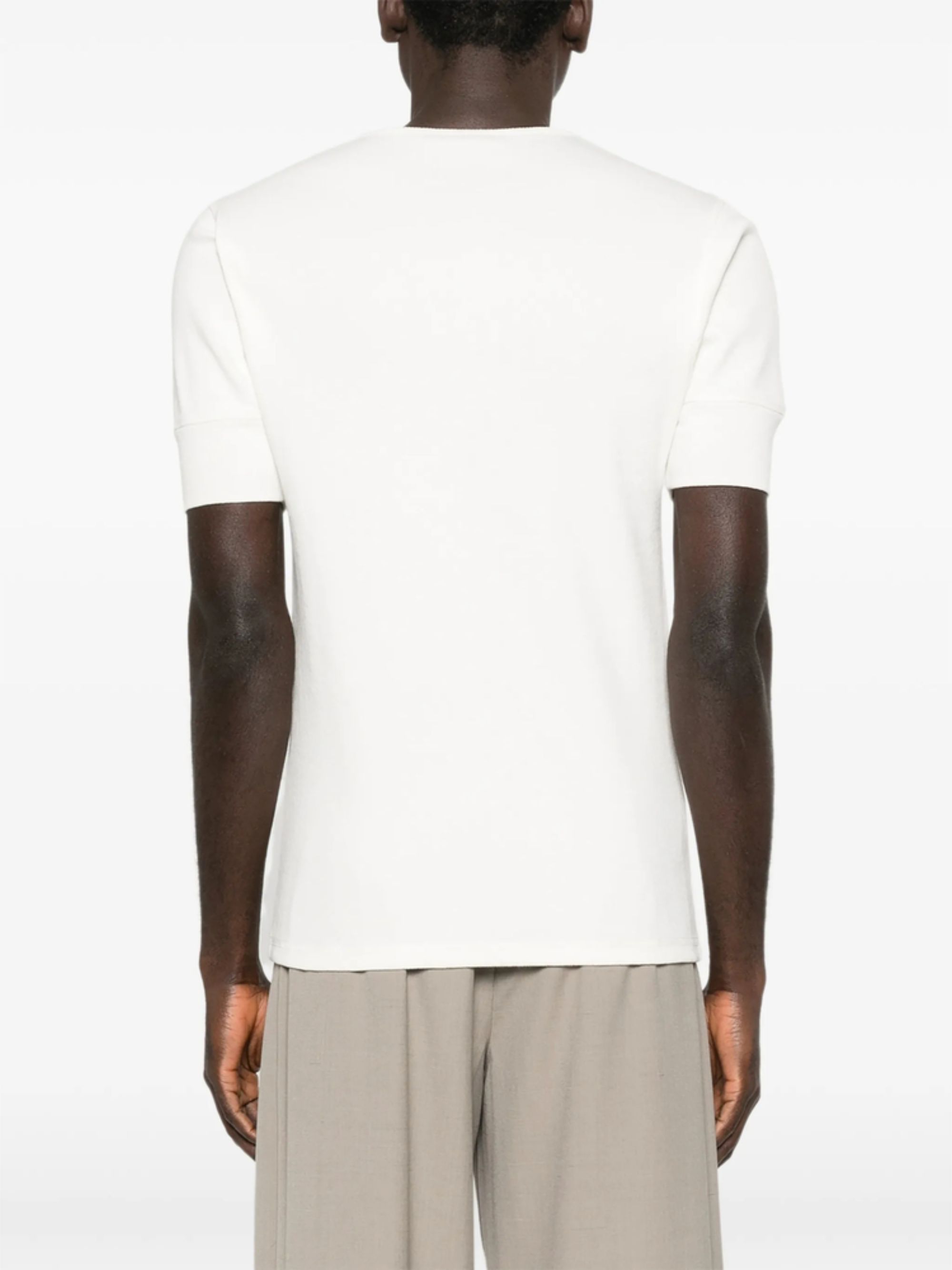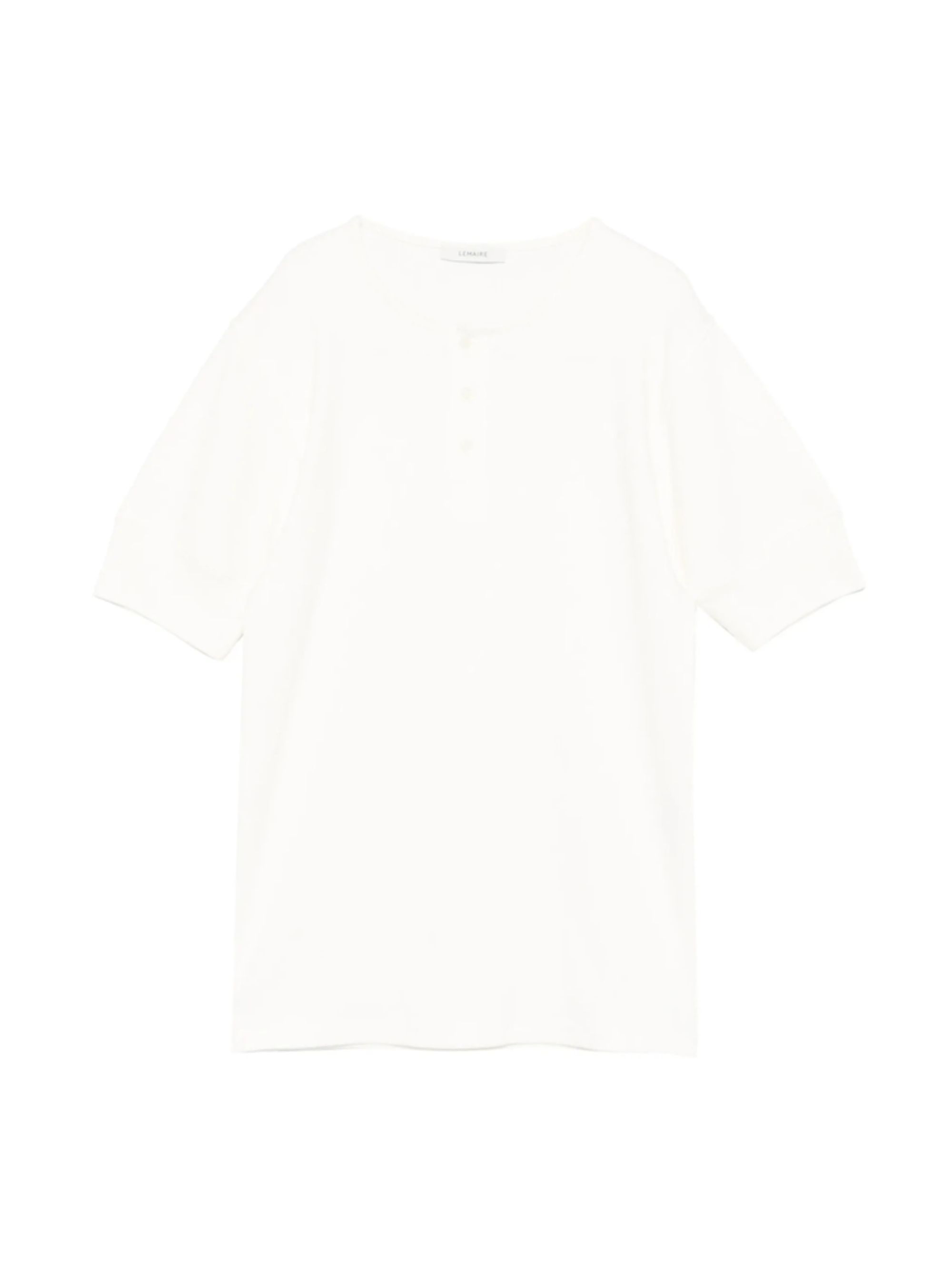 LEMAIRE white cotton and linen short-sleeved T-shirt, featuring short sleeves and a three-button polo fastening.