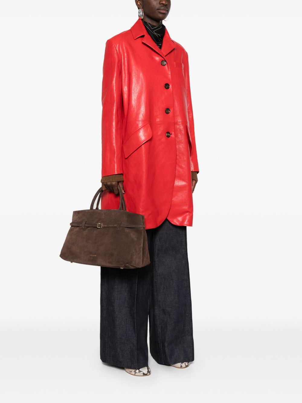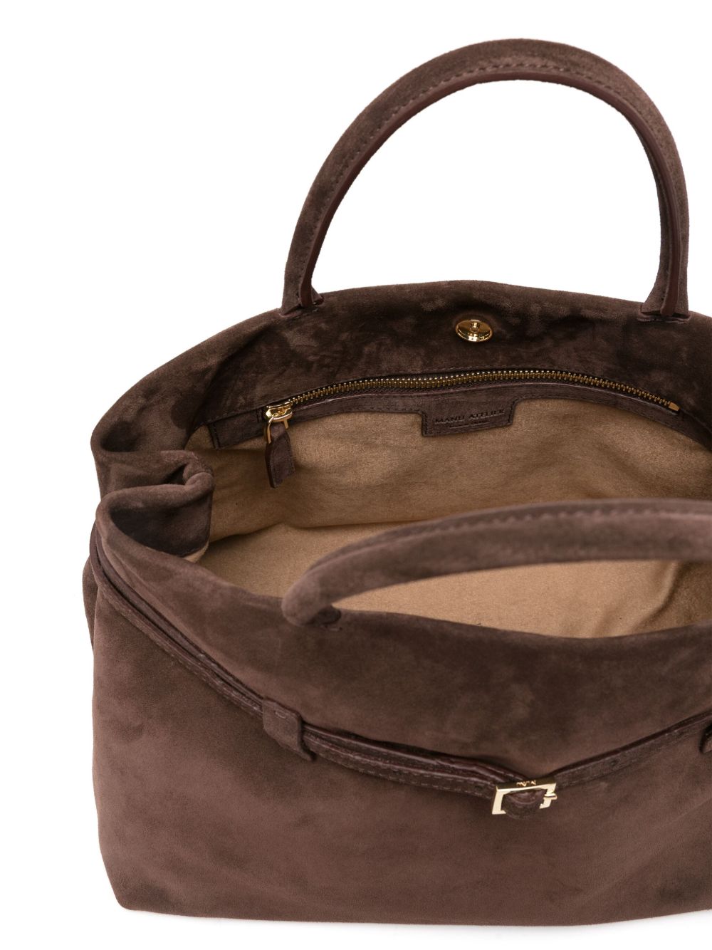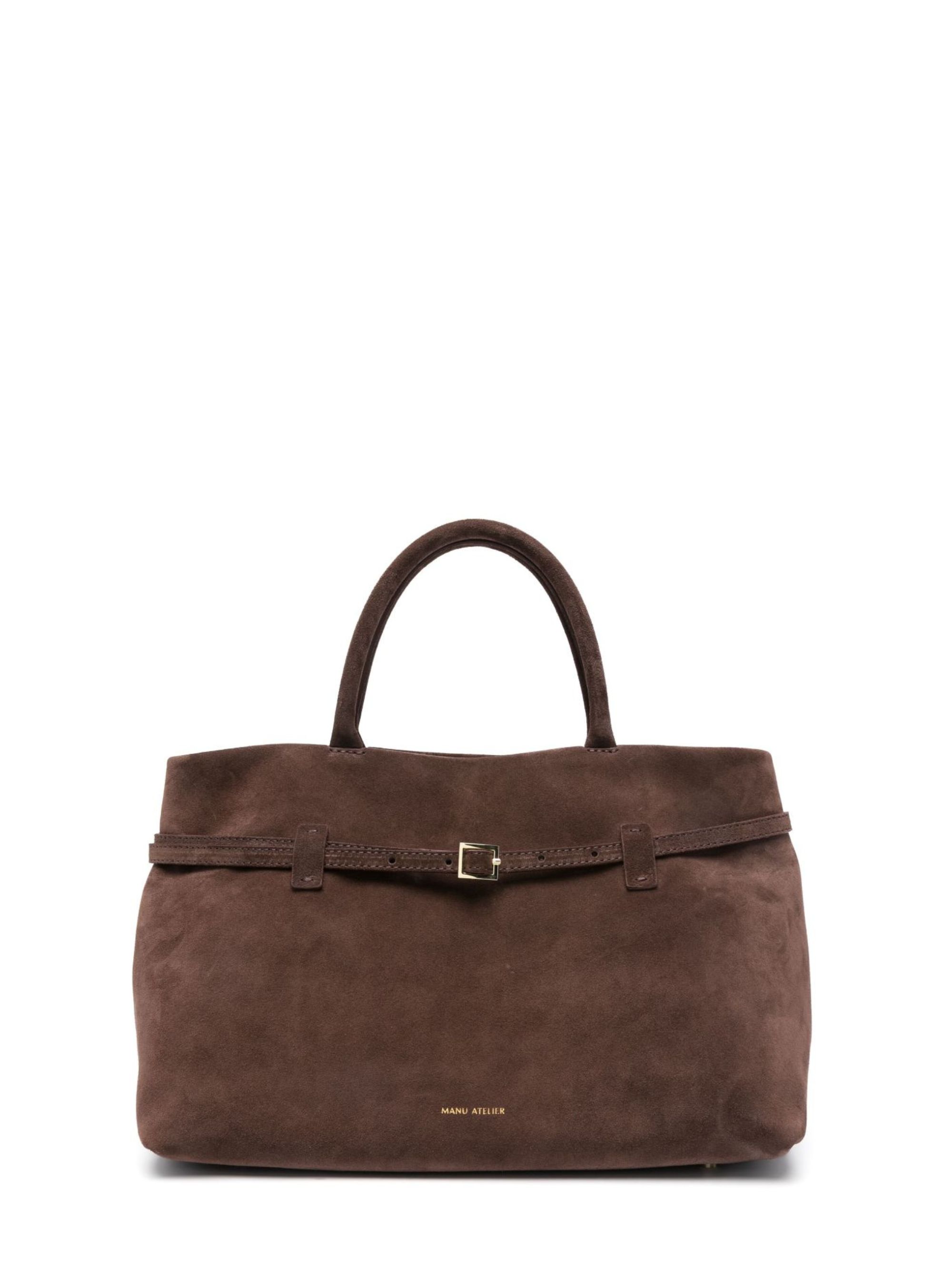 cedar brown calf suede concealed magnetic fastening two rolled top handles logo stamp to the front decorative buckle detail logo-engraved gold-tone hardware main compartment internal zip-fastening pocket internal logo tag suede lining This piece comes complete with a protective dust bag.