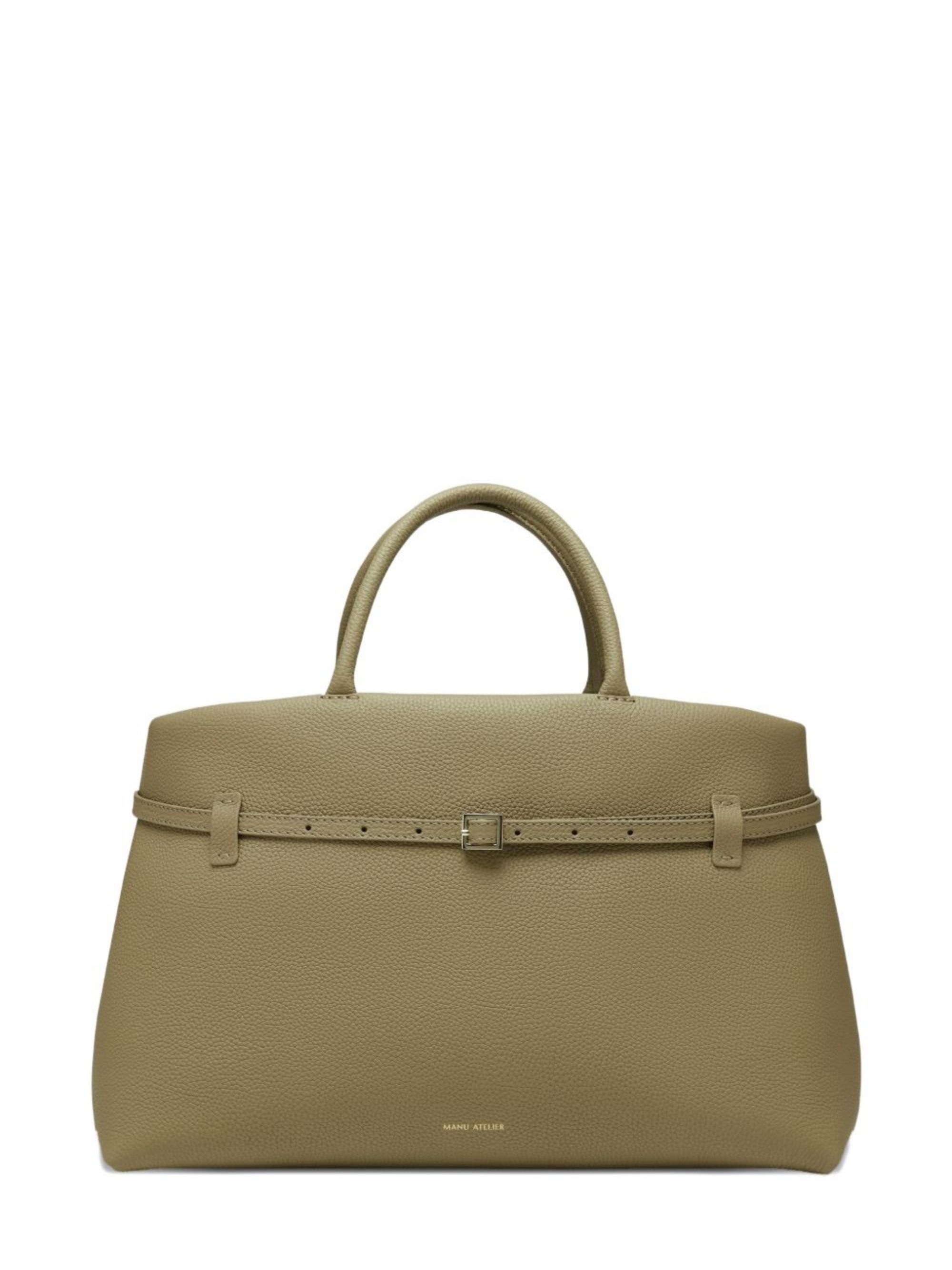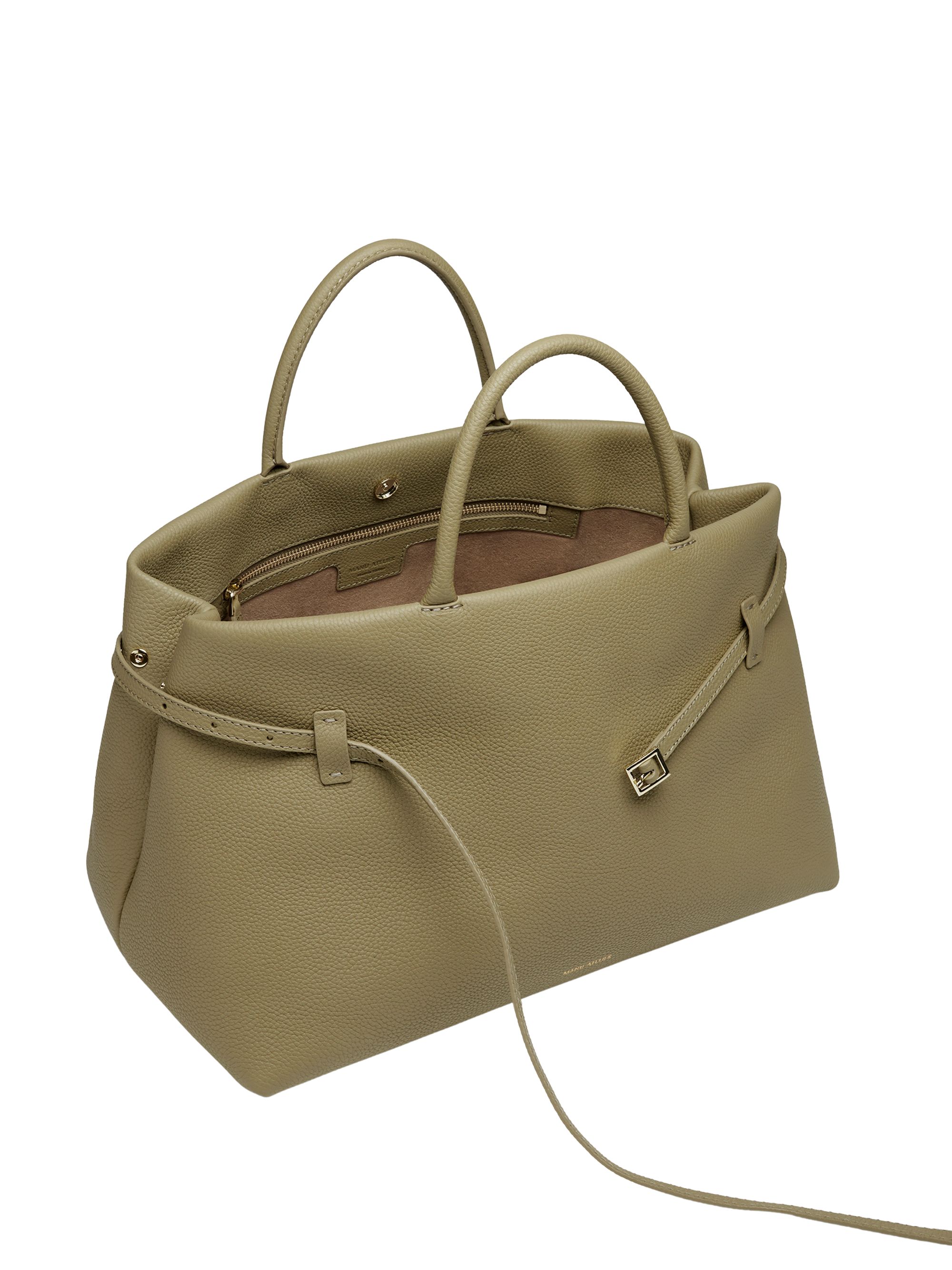MANU ATELIER Le Cambon 40 bag in olive green in hammered leather with lining, interior zip pocket, handles, strap, logo, and magnetic closure. Dimensions: 40 x 26.5 x 24 cm