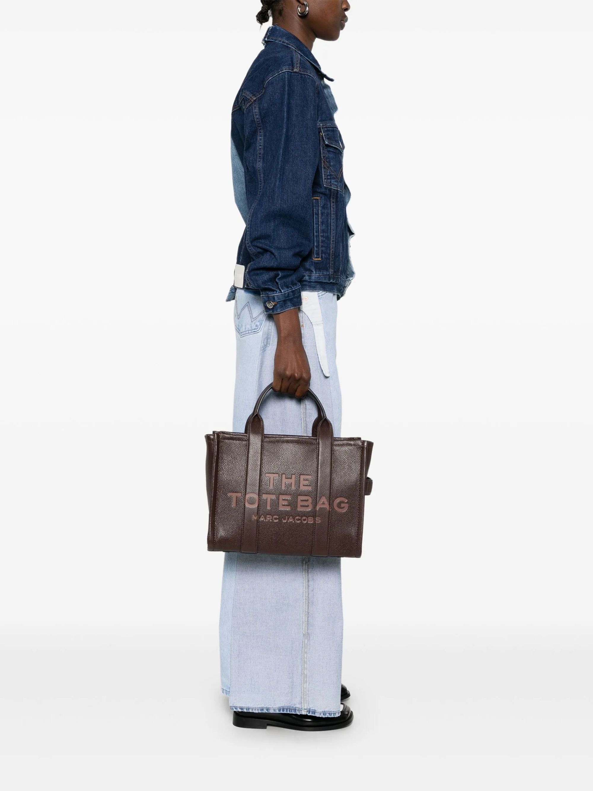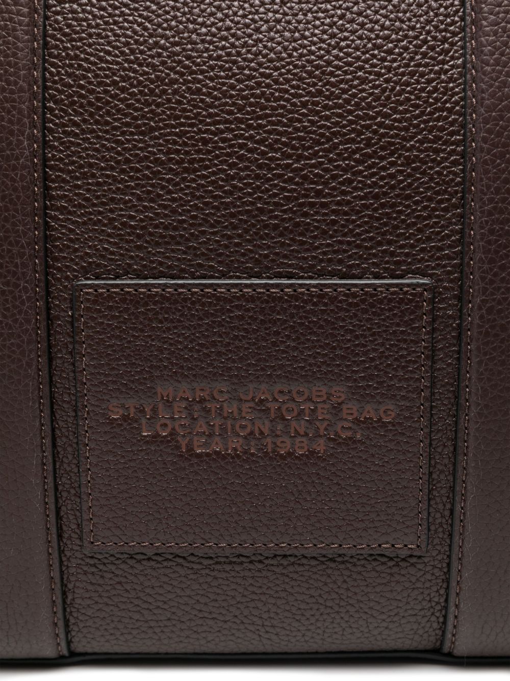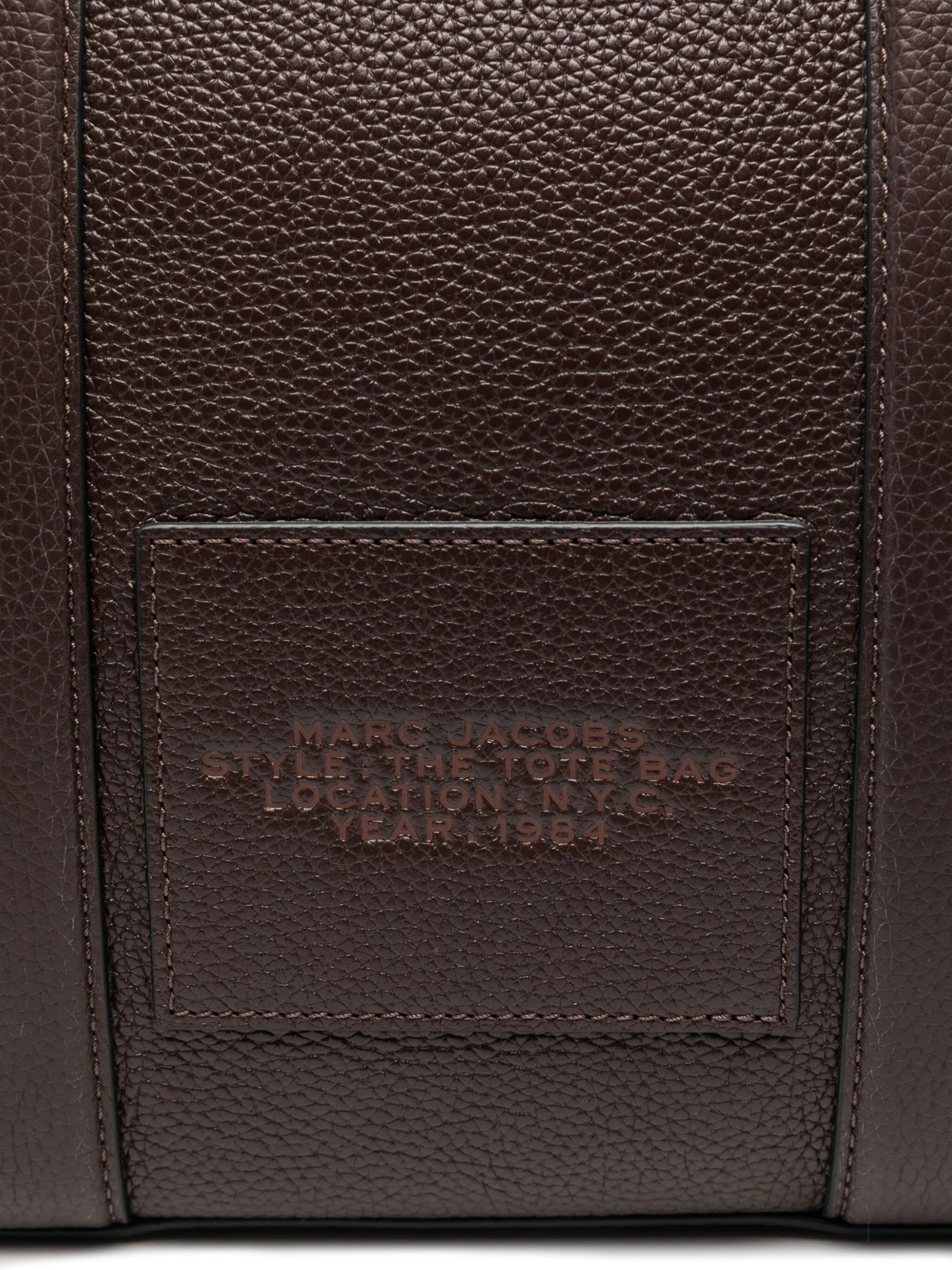 MARC JACOBS medium brown leather tote bag featuring a zip closure, one compartment, two slip pockets, a card slot, a textured design, and an adjustable and removable shoulder strap. Dimensions: 34 x 15 x 27 cm.