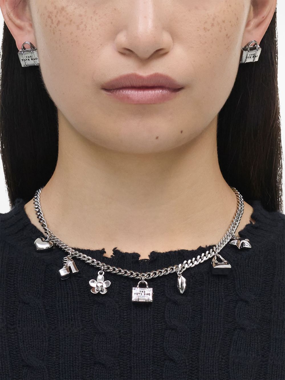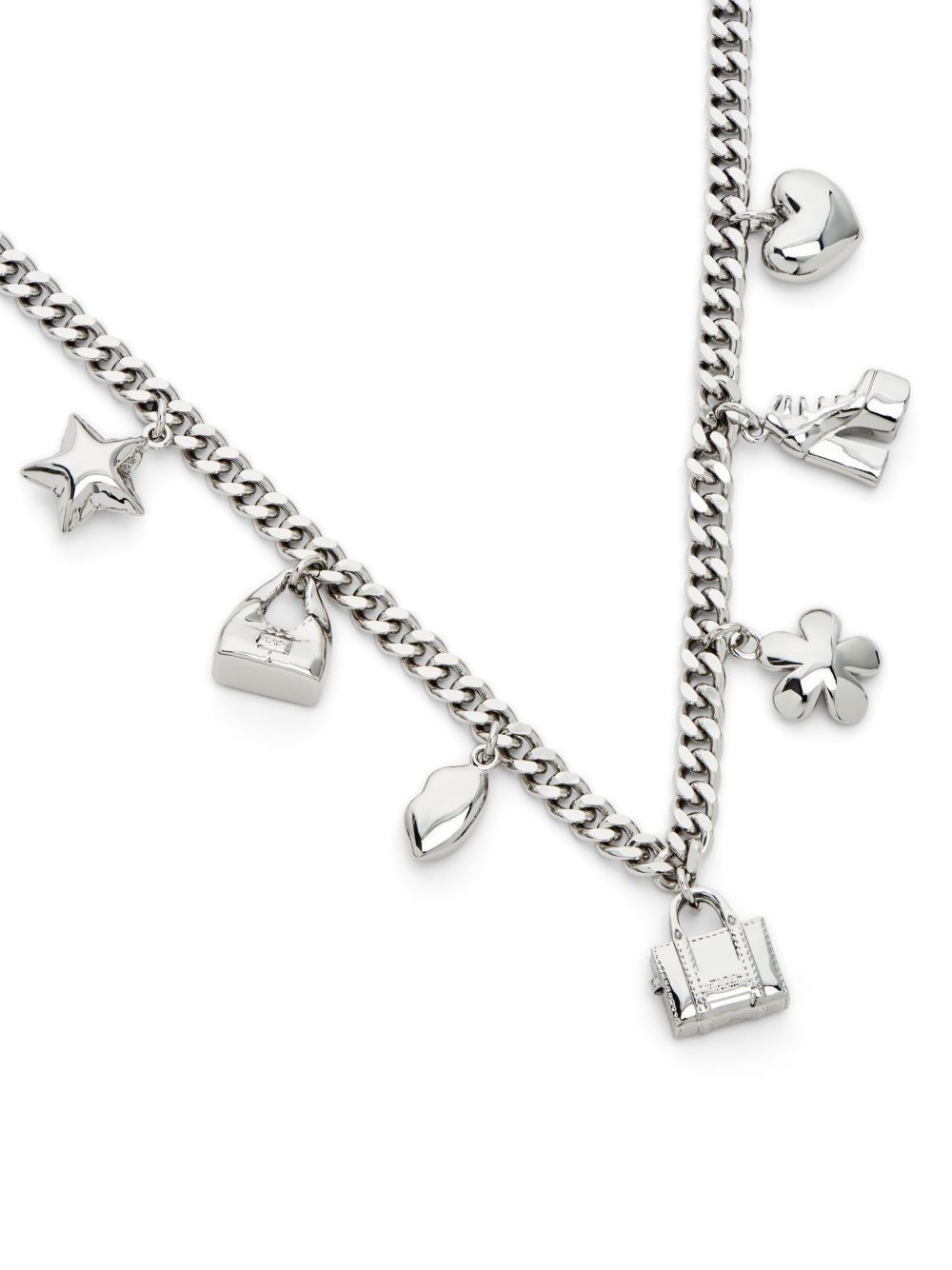 MARC JACOBS Mini Icon Charm Necklace in silver brass with pendant detail, adjustable and lobster clasp closure.