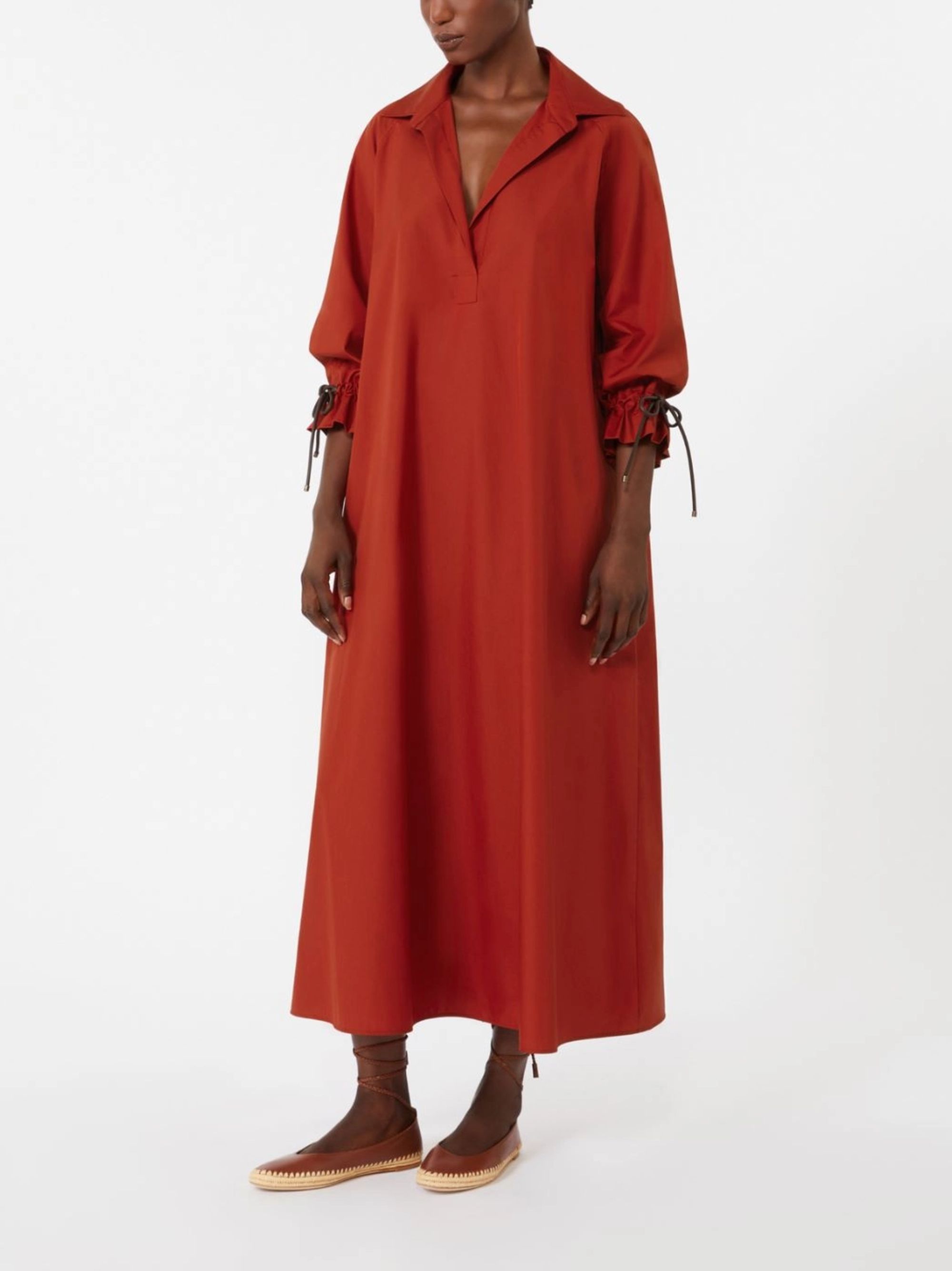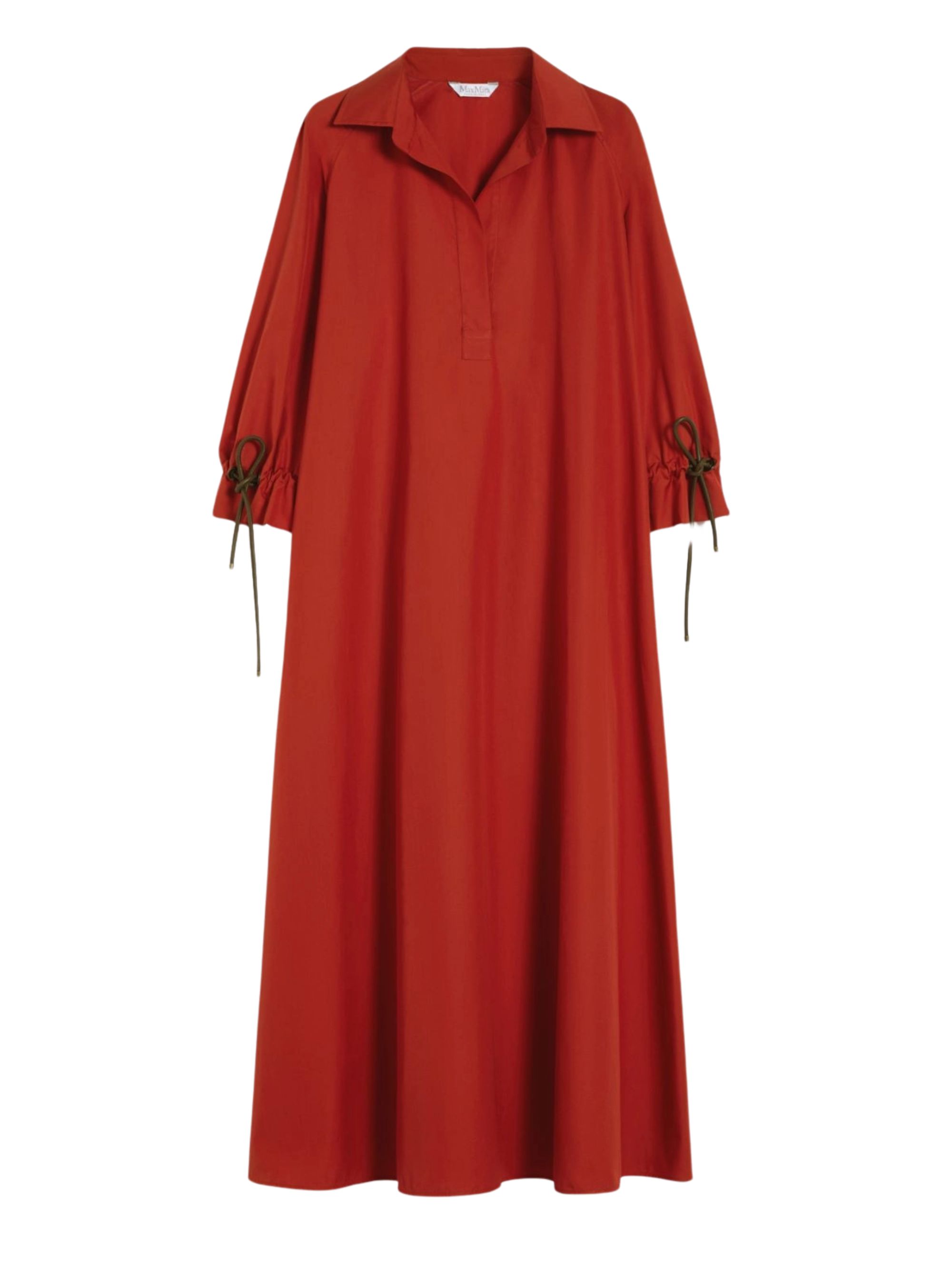 Mirto cotton dress in red, classic collar, waist belt, adjustable cuffs.