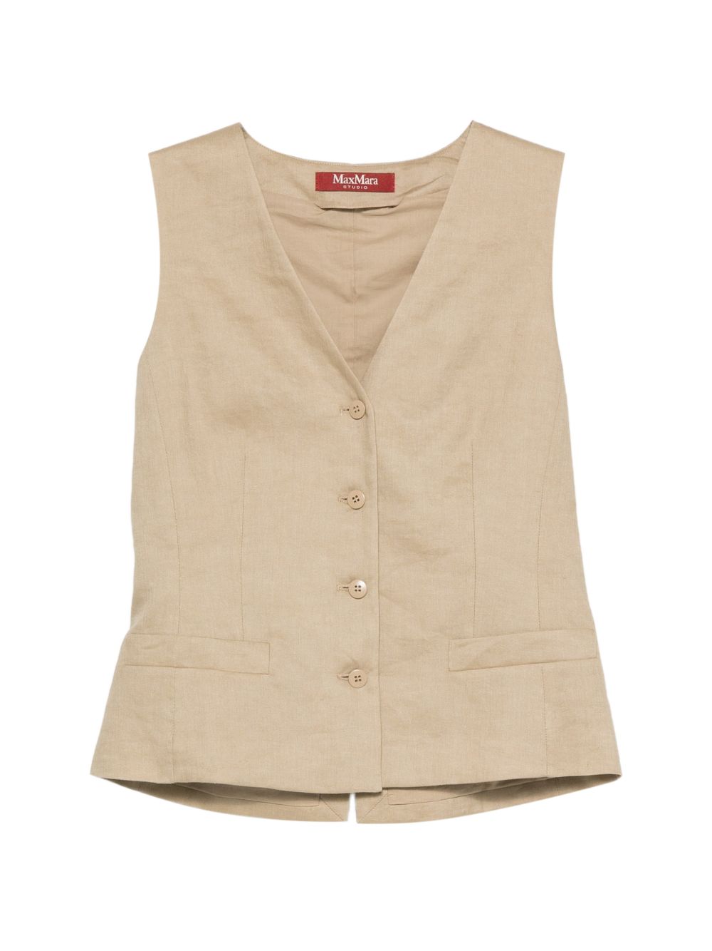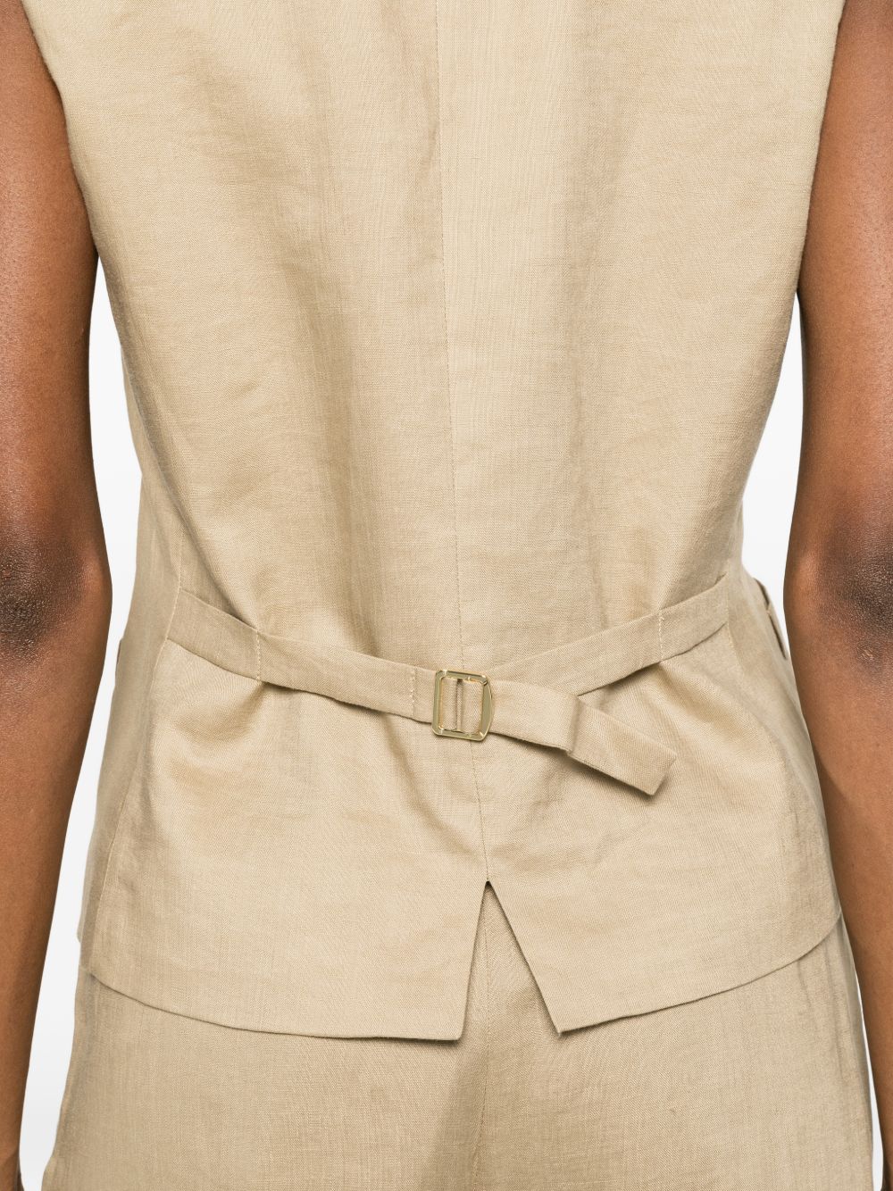 Beige linen Carnet vest by MAX MARA STUDIO featuring a boxy fit, a strap at the back to adjust the waist, and a front button closure.