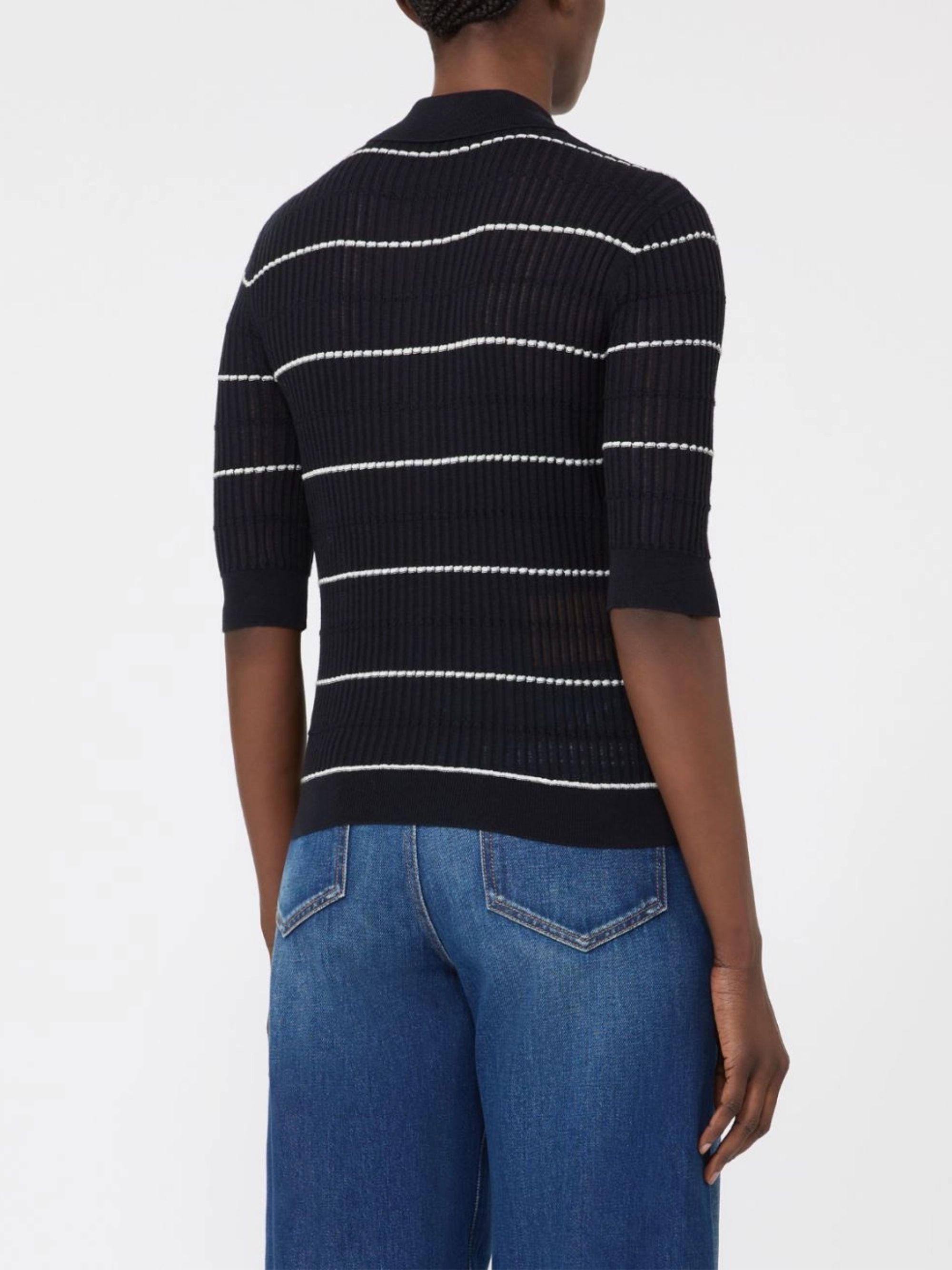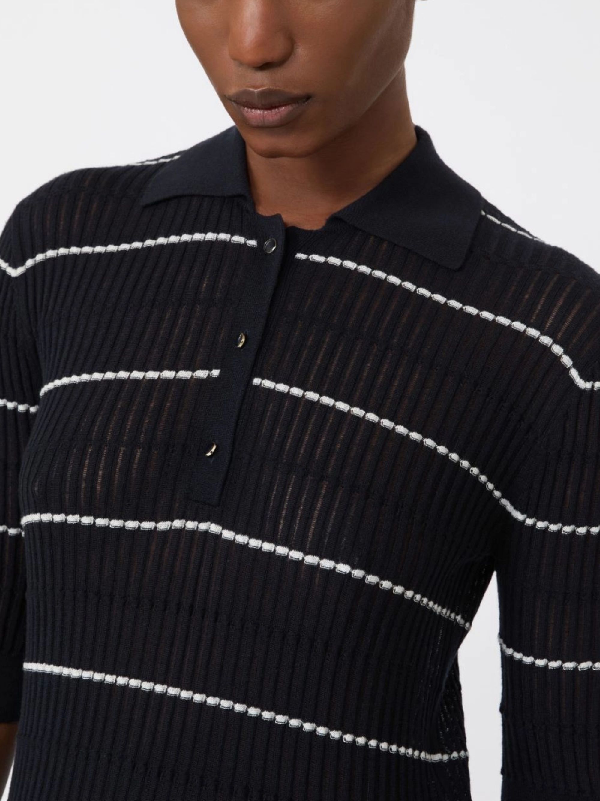 Gallo blue and white polo, silk/wool blend, ribbed, horizontal stripe pattern, collar, short button placket.