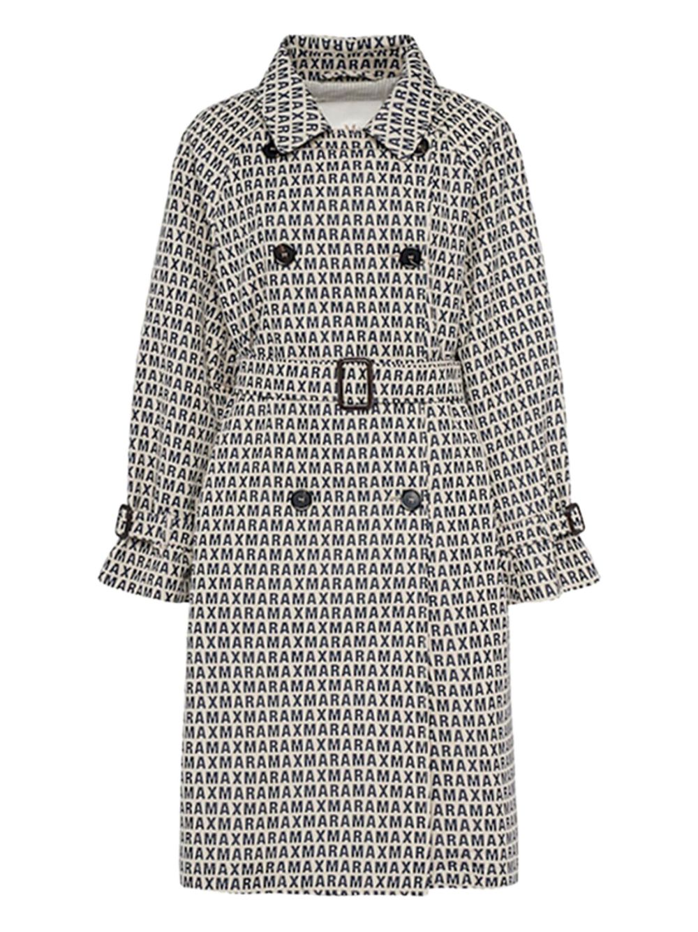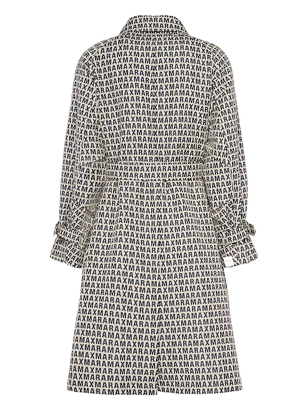 White and black Lucio raincoat by MAX MARA THE CUBE in cotton with collar, all-over monogram and double-breasted fastening and belt.