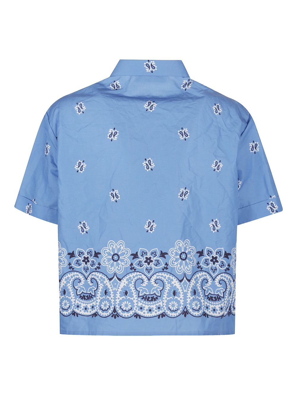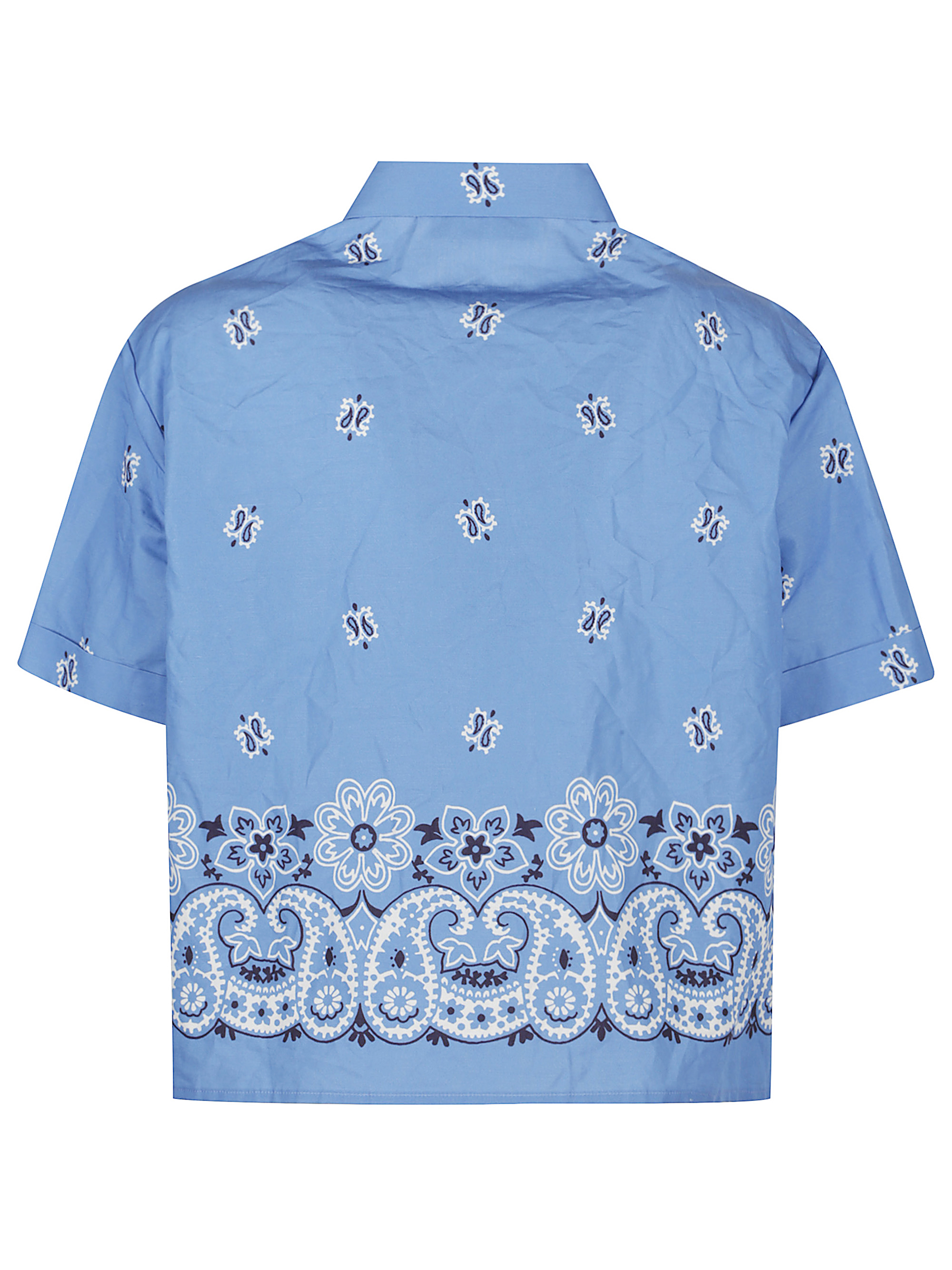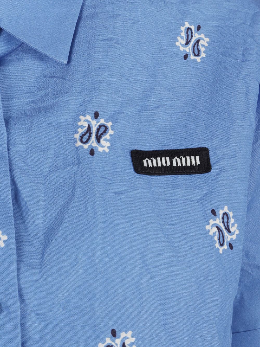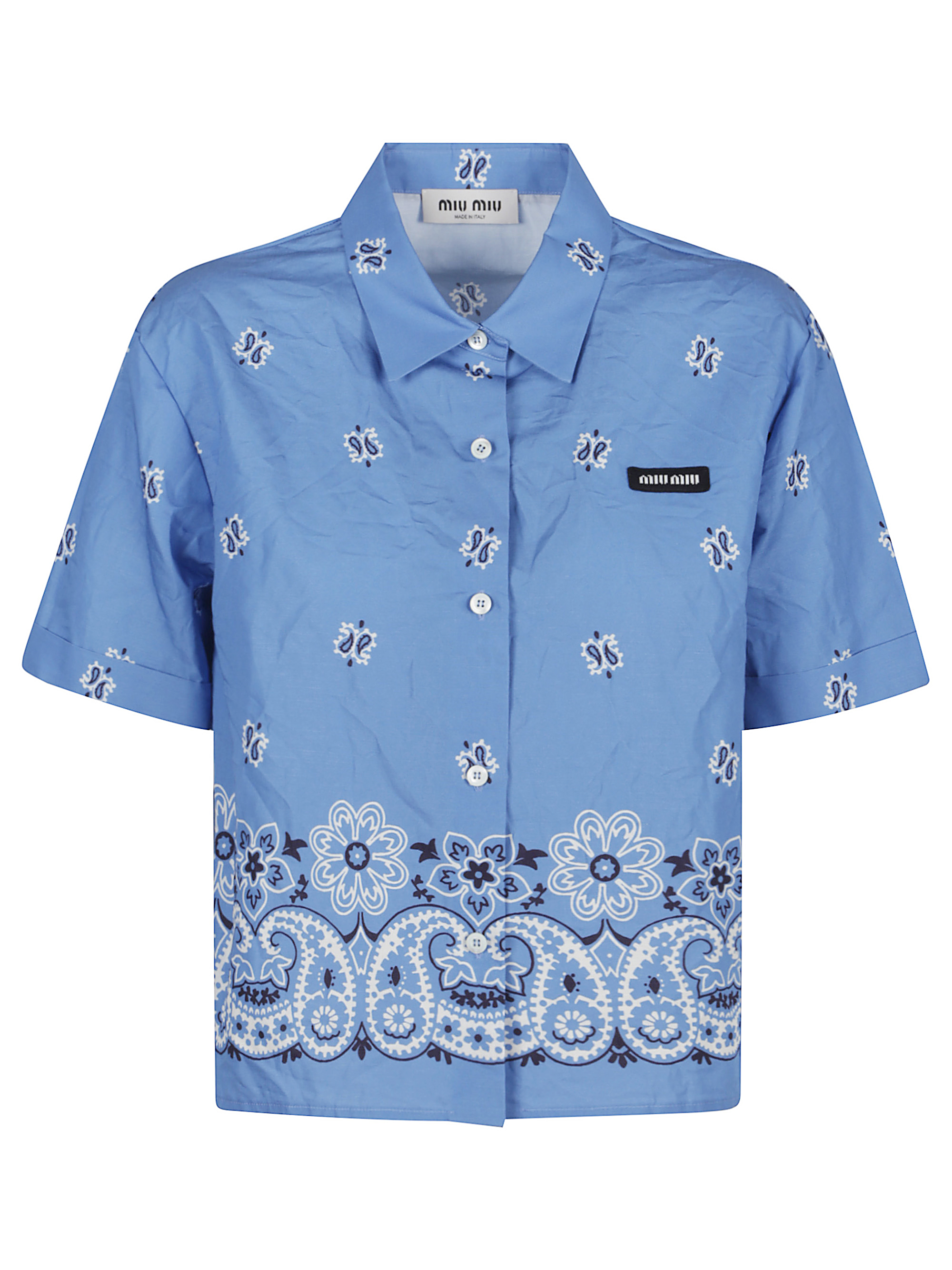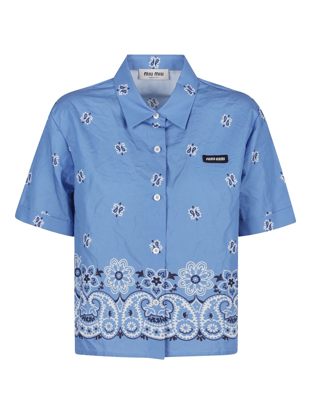 MIU MIU light blue bandana shirt in slub poplin with print, logo at left chest, short sleeves, classic collar, and button closure.