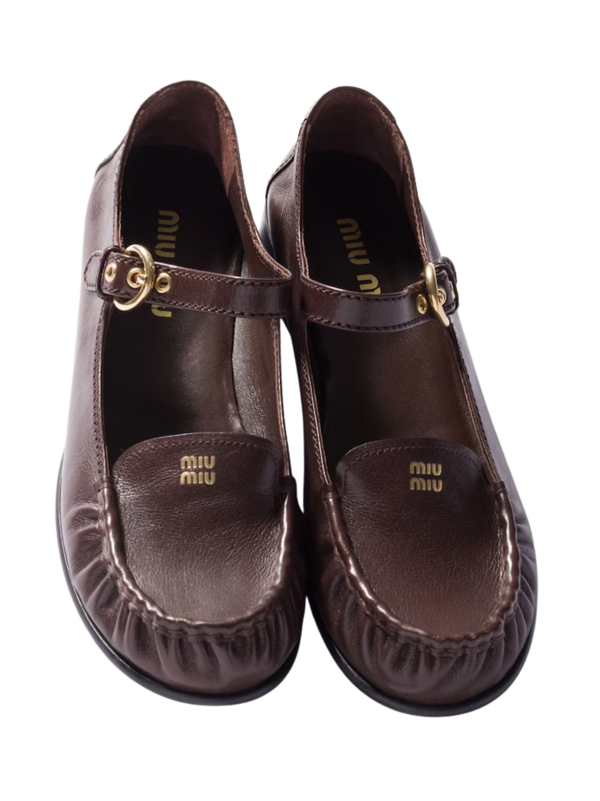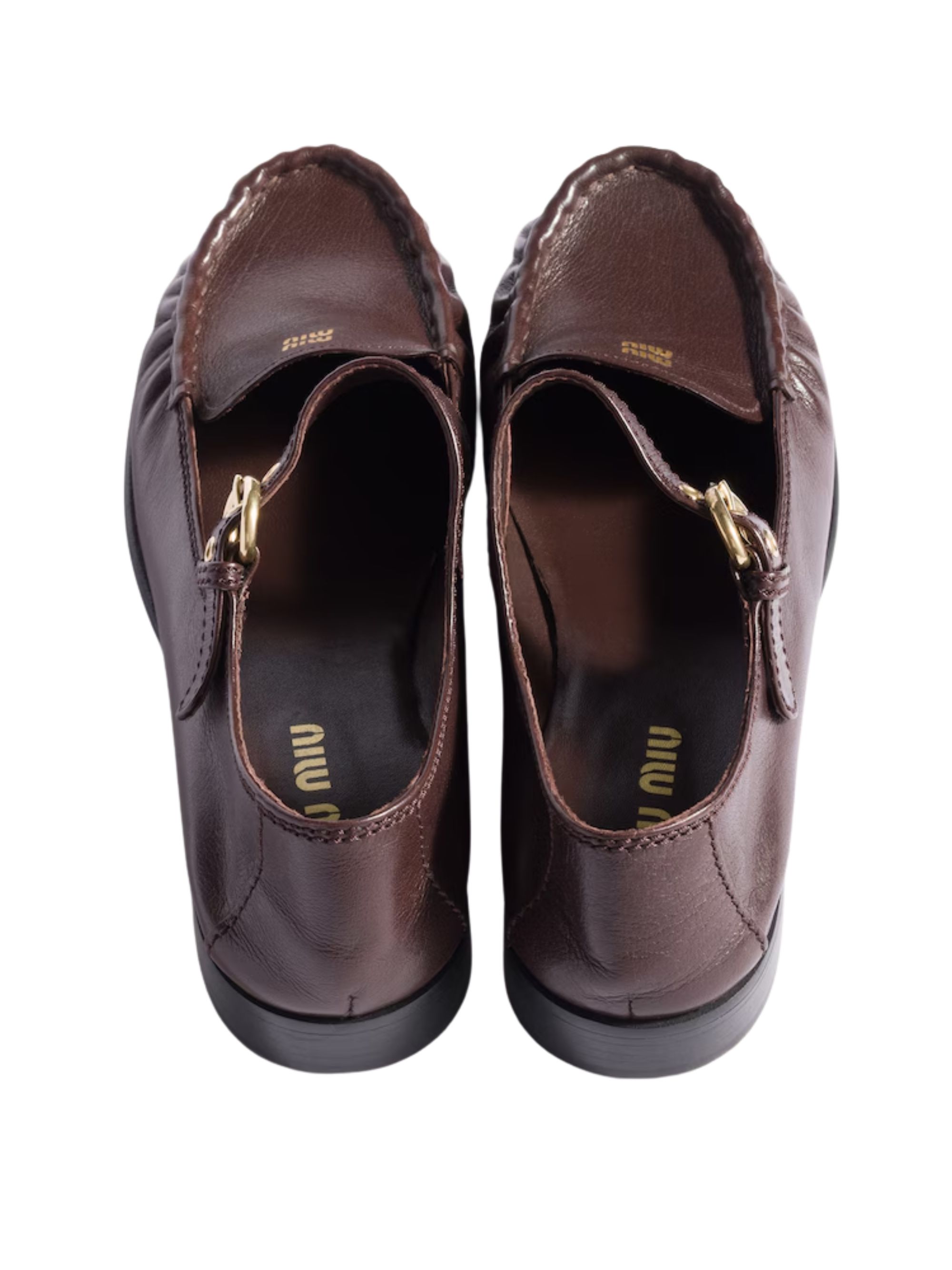 MIU MIU brown leather buckle loafer featuring a gathered MaryJane design, gold details, a leather lining, a leather sole, and a 15 mm heel.