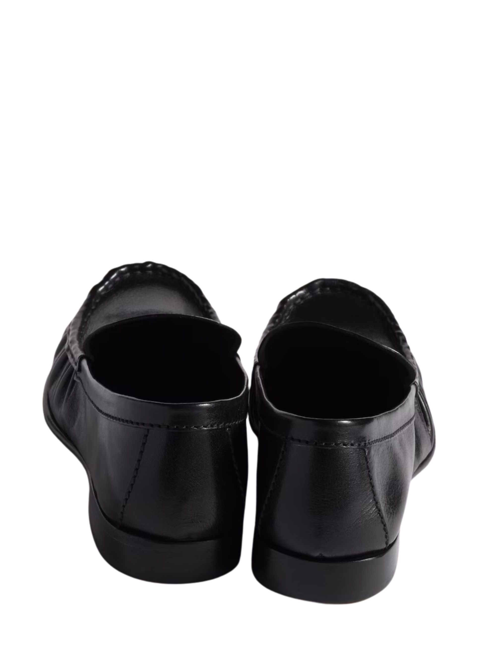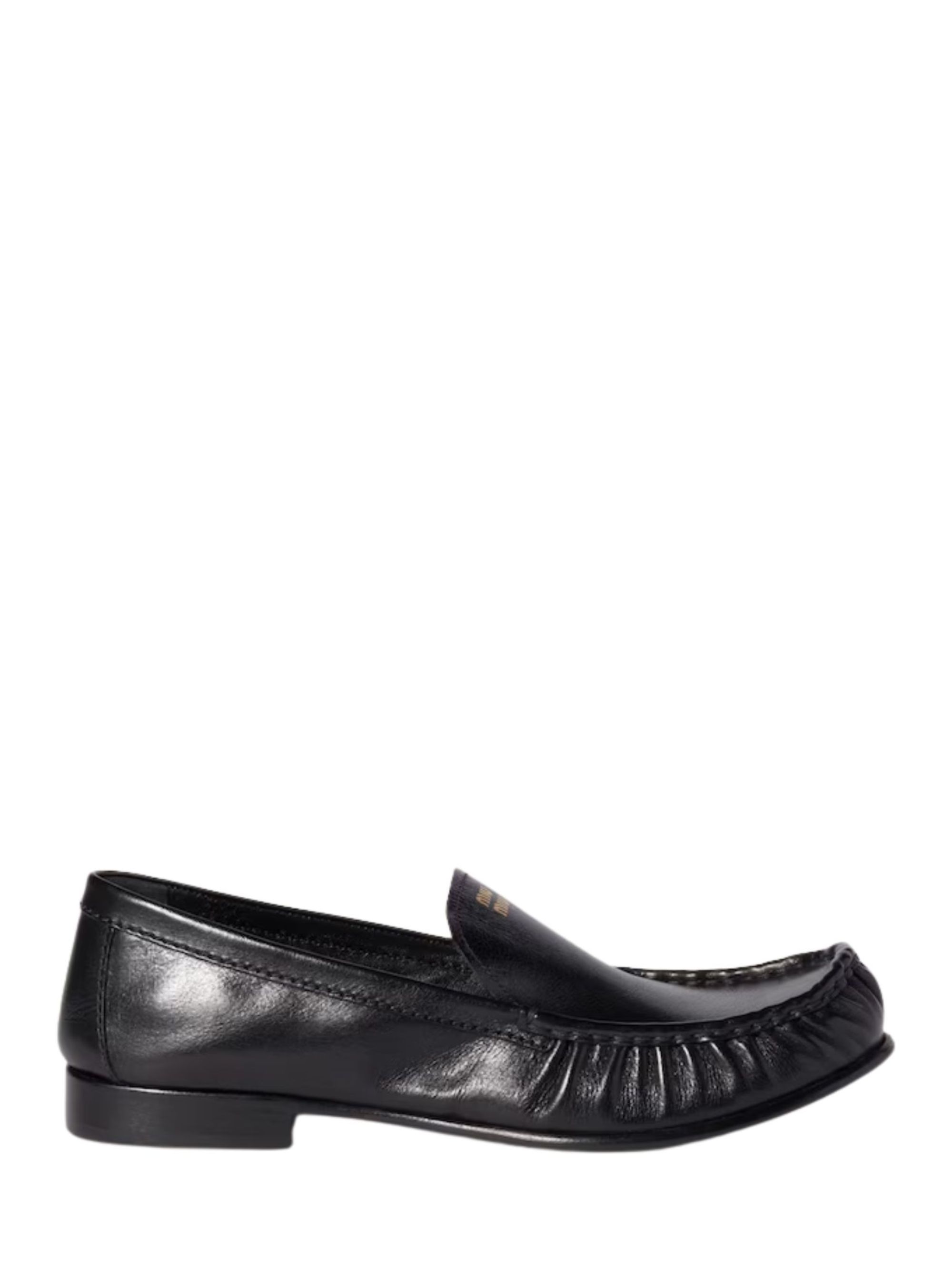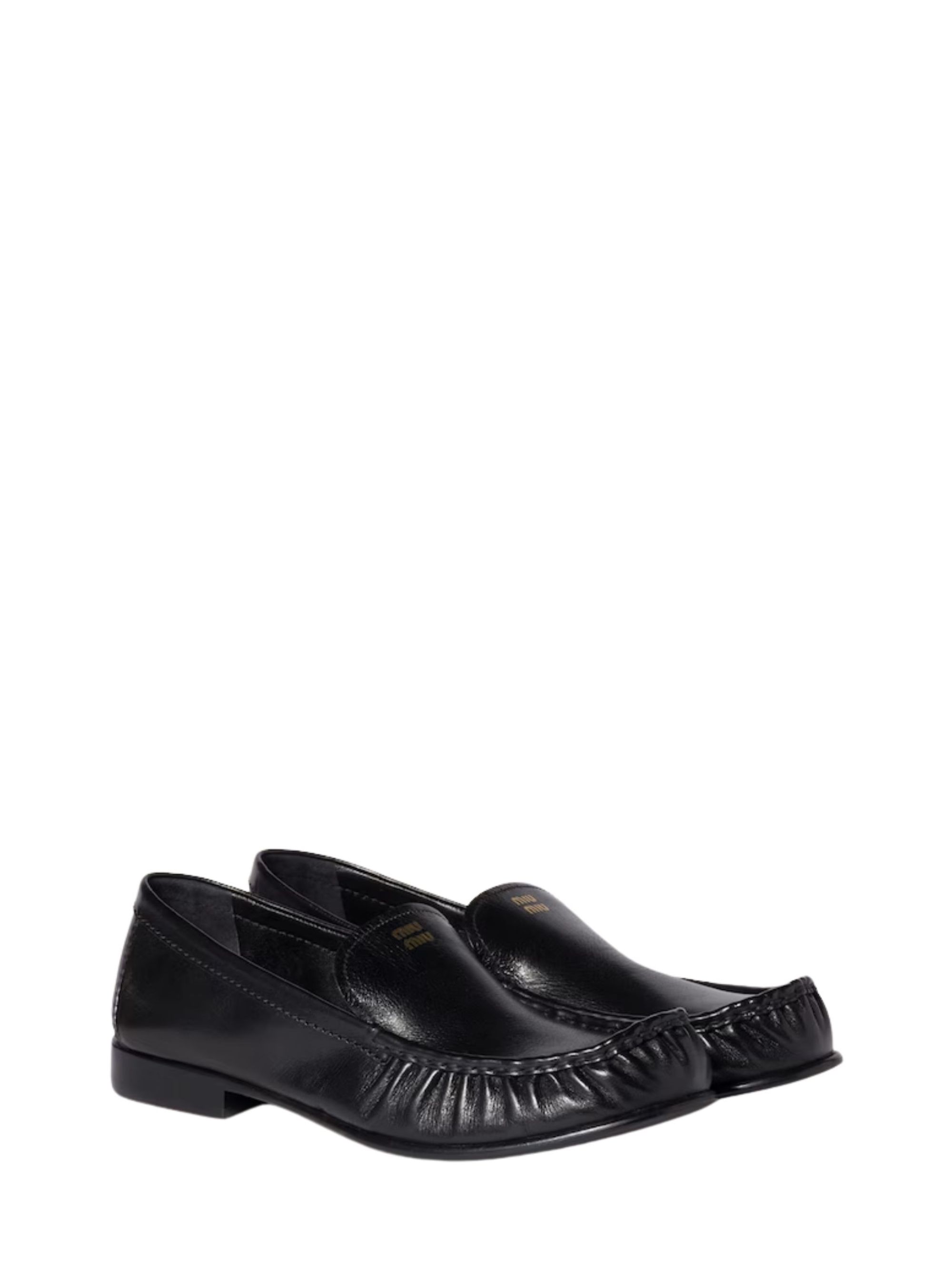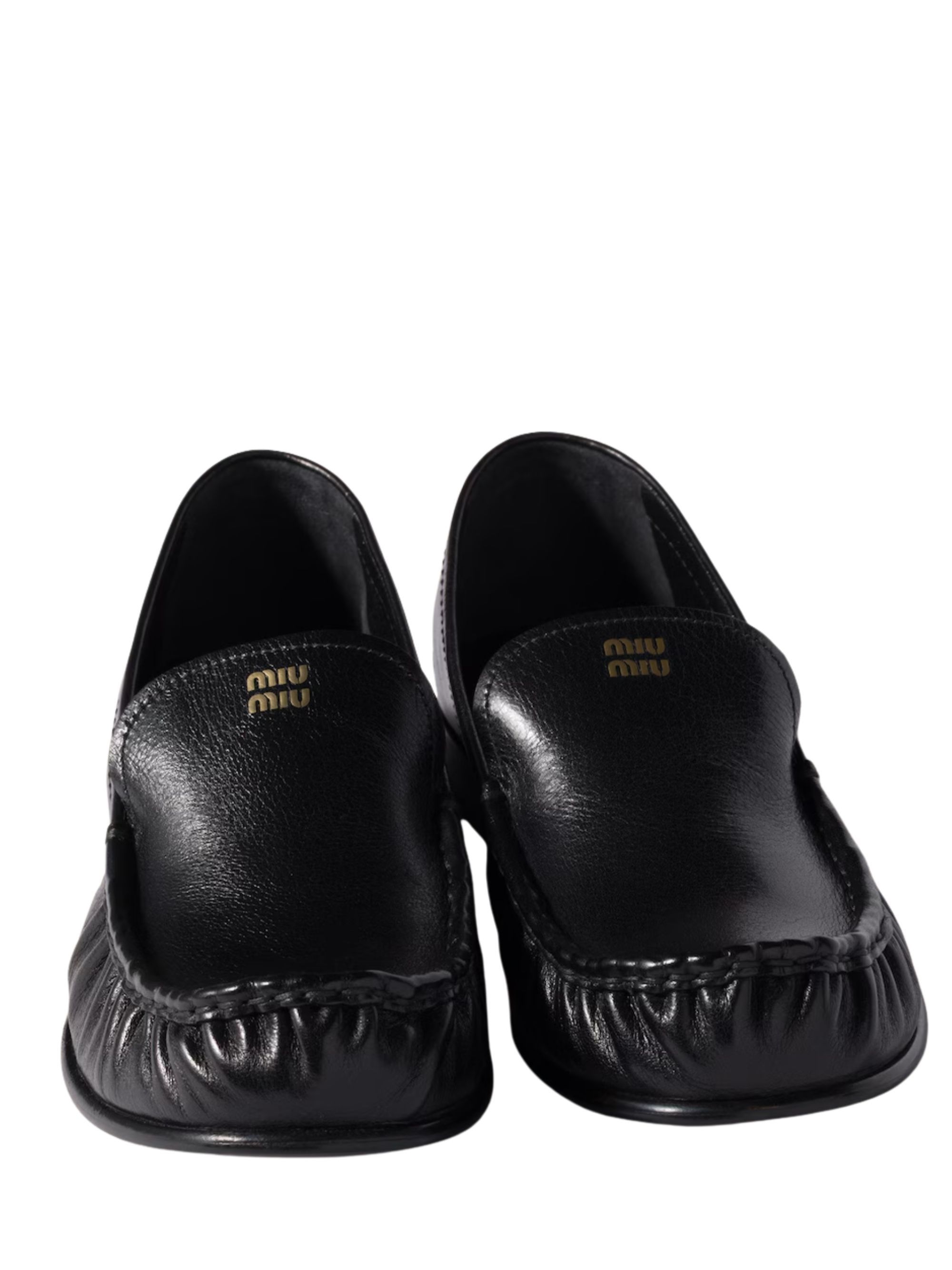 MIU MIU black buffalo leather loafer featuring an embossed logo on the tongue and insole, a leather insole, a one-piece leather and rubber sole, and a 15 mm heel.