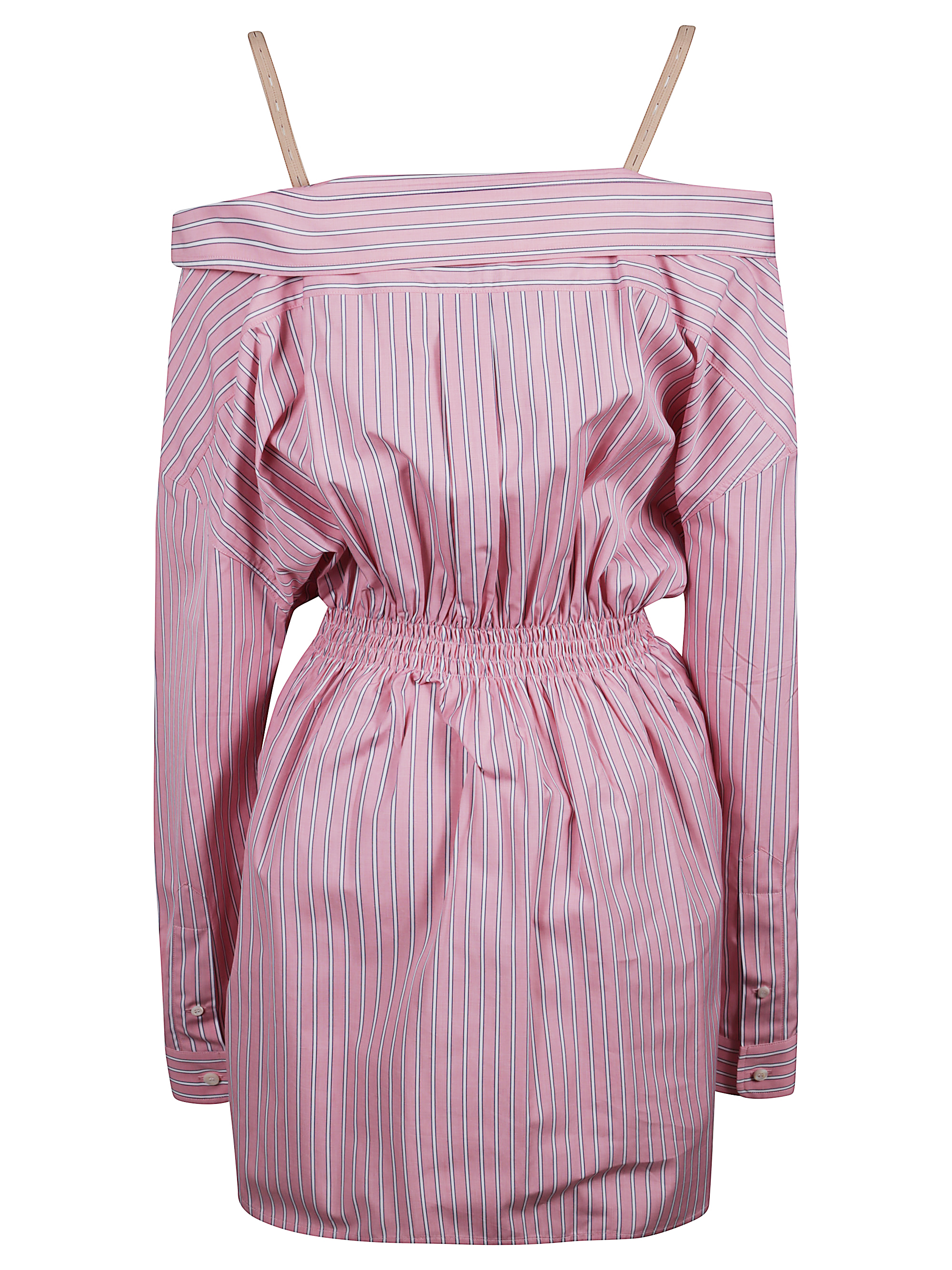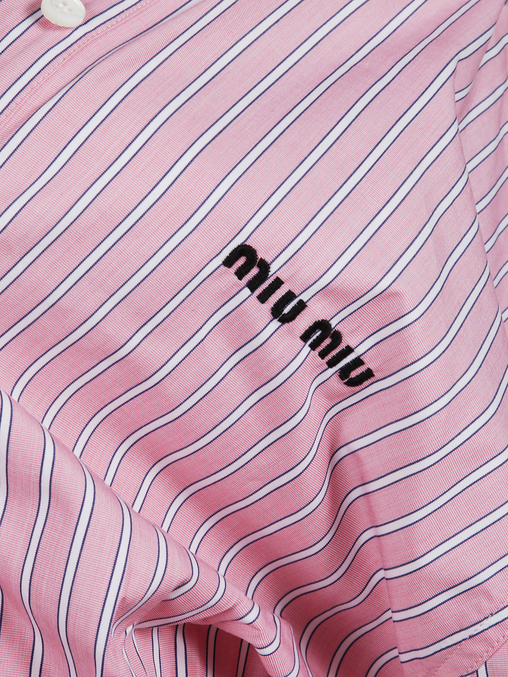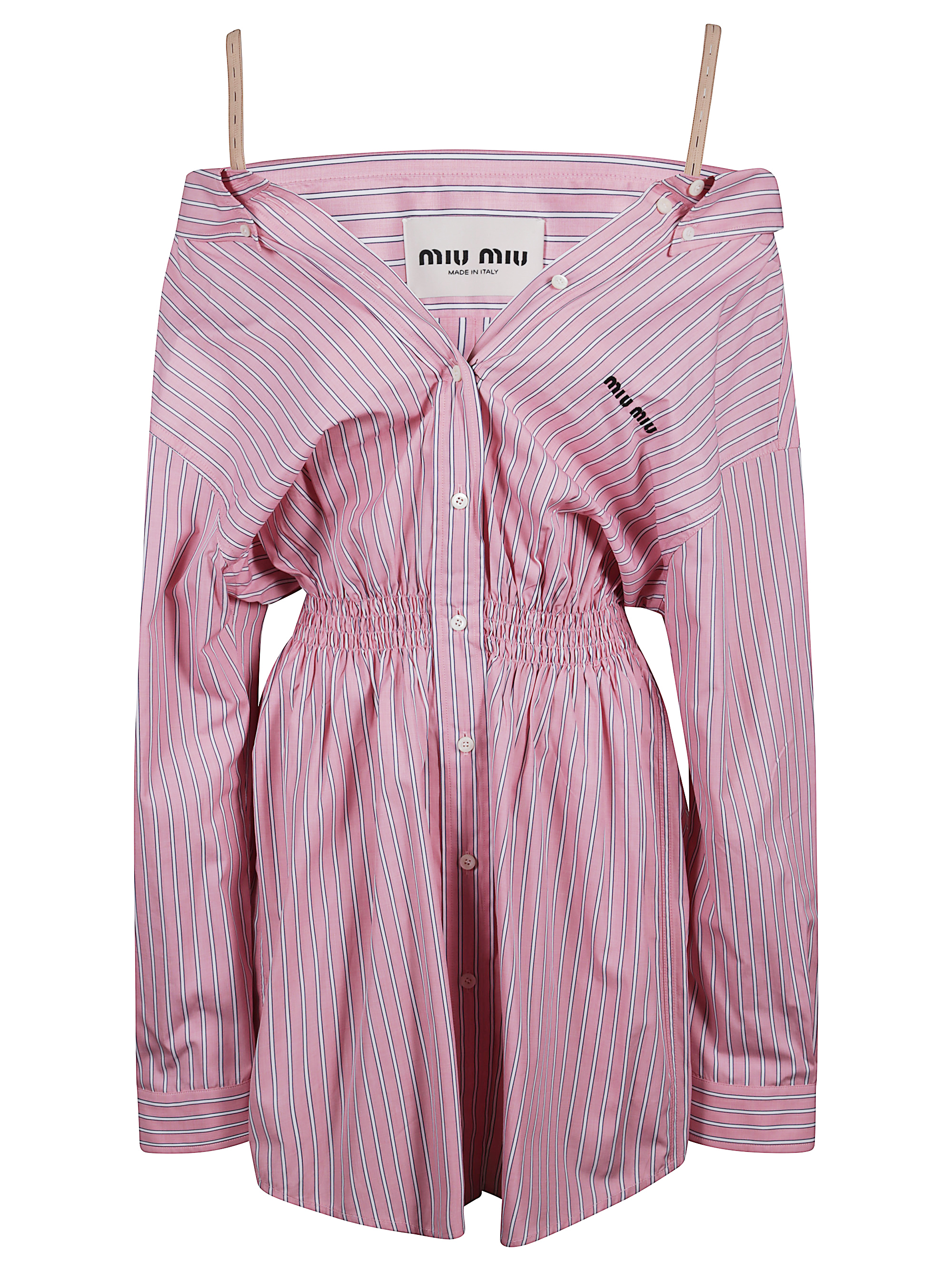 MIU MIU pink striped cotton poplin shirt dress featuring adjustable and removable internal shoulder straps, button fastening, embroidered logo on the chest, elasticated waist and rounded cuffs with button.