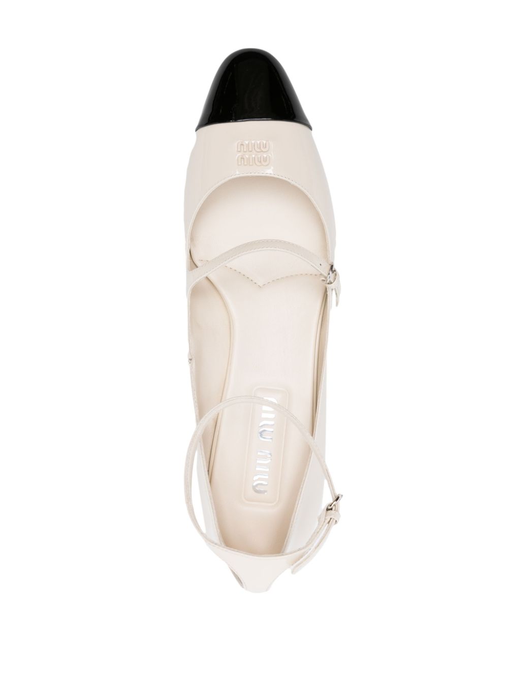 Classic black and white color pumps from MIU MIU, featuring round toe and contrasting heel, front logo with two adjustable straps.