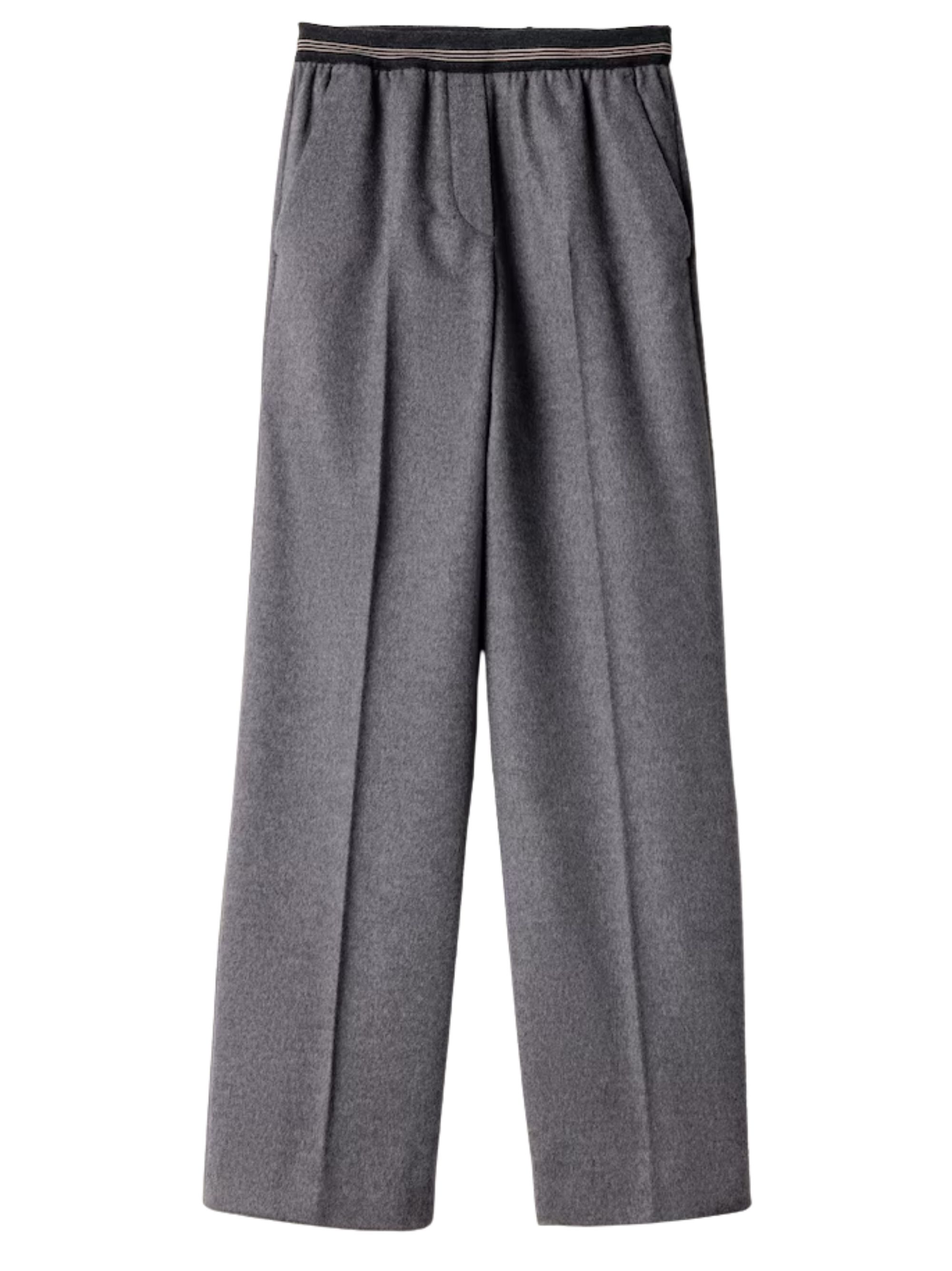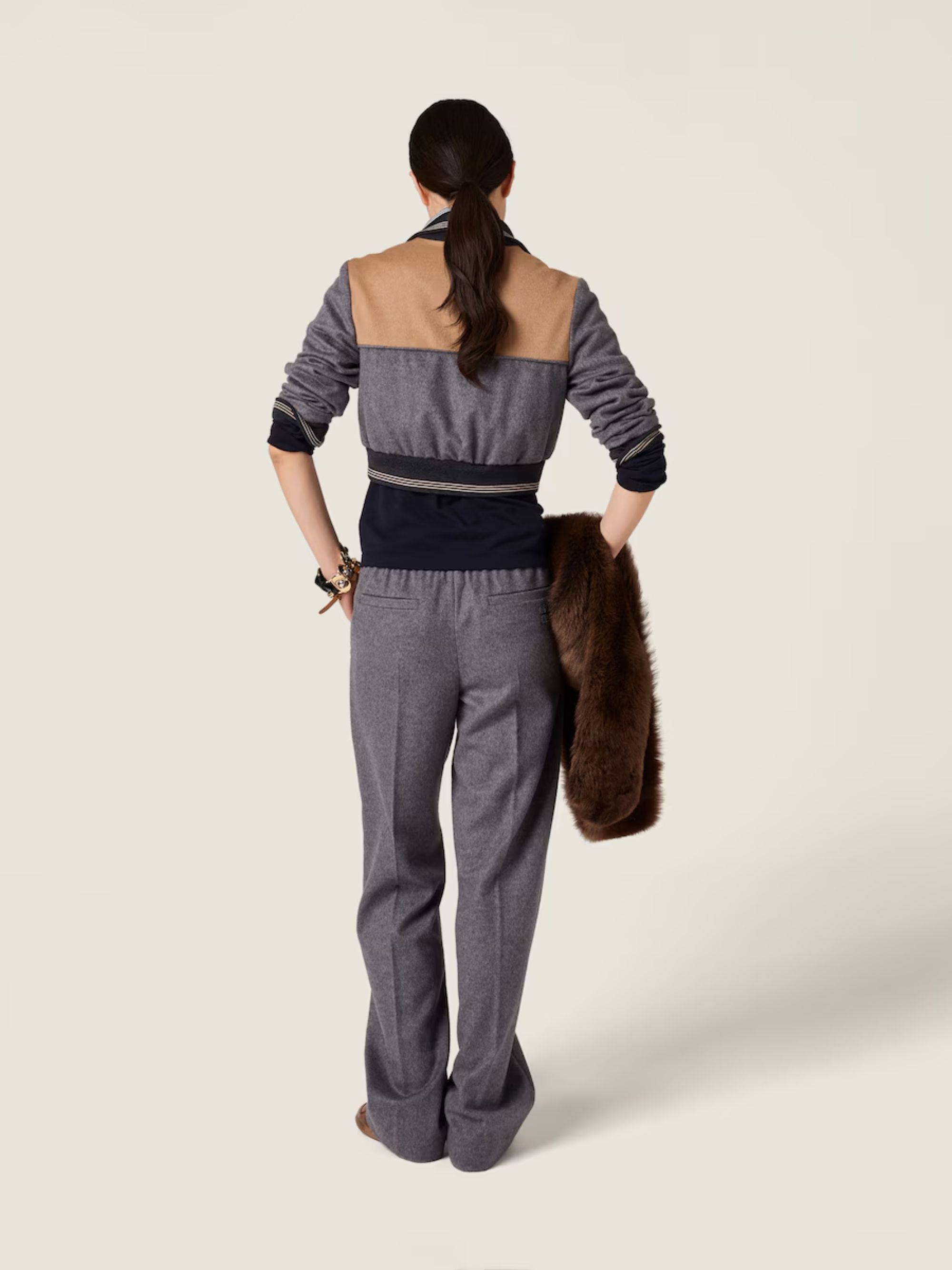 MIU MIU grey velour jogging trousers with rear welt pockets, slant pockets, drawstring waist, embroidered logo and elastic waistband.