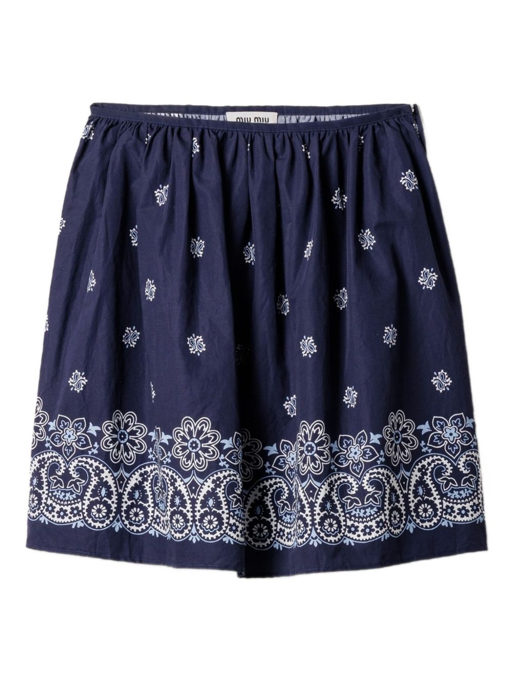 MIU MIU blue skirt with white print, flared fit, side pockets and button fastening on the side.