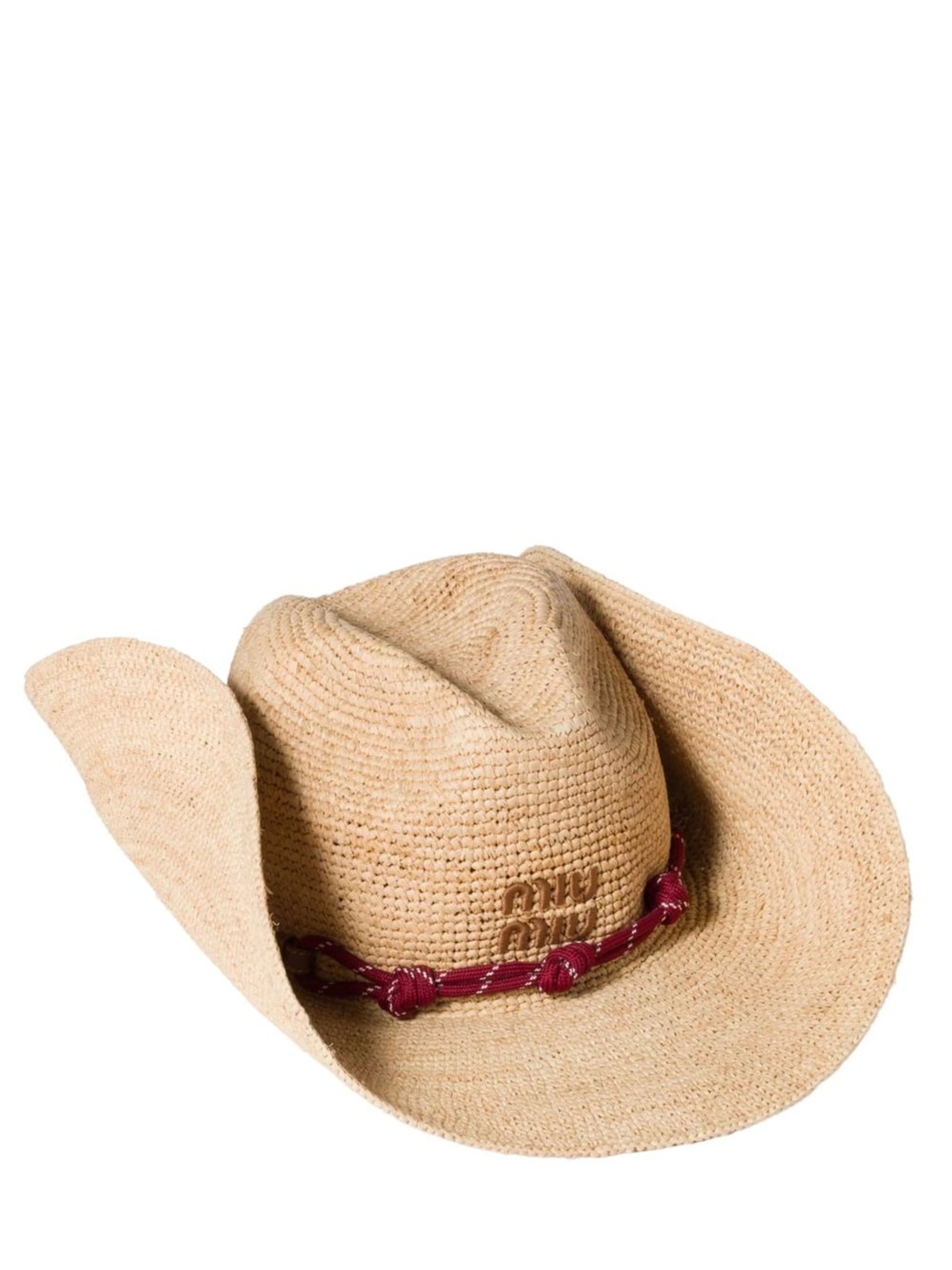 Beige MIU MIU raffia hat featuring drawstring detail and logo.
