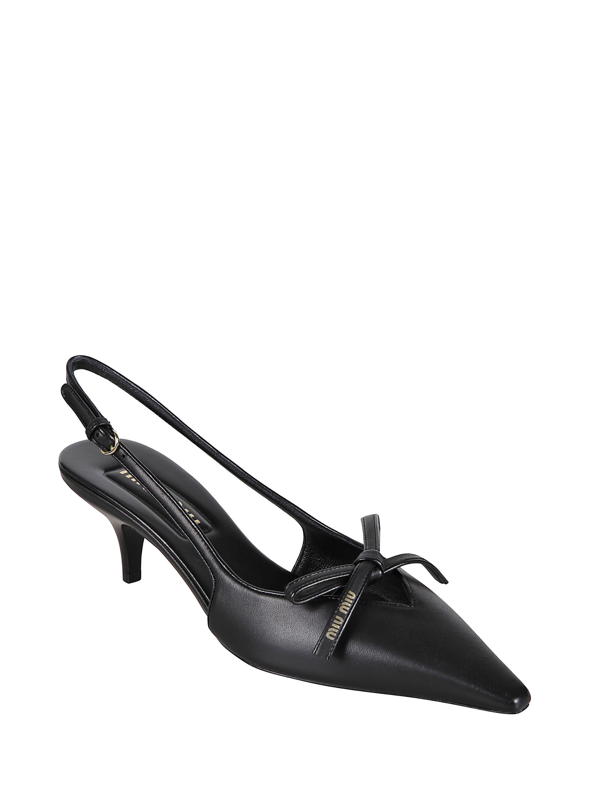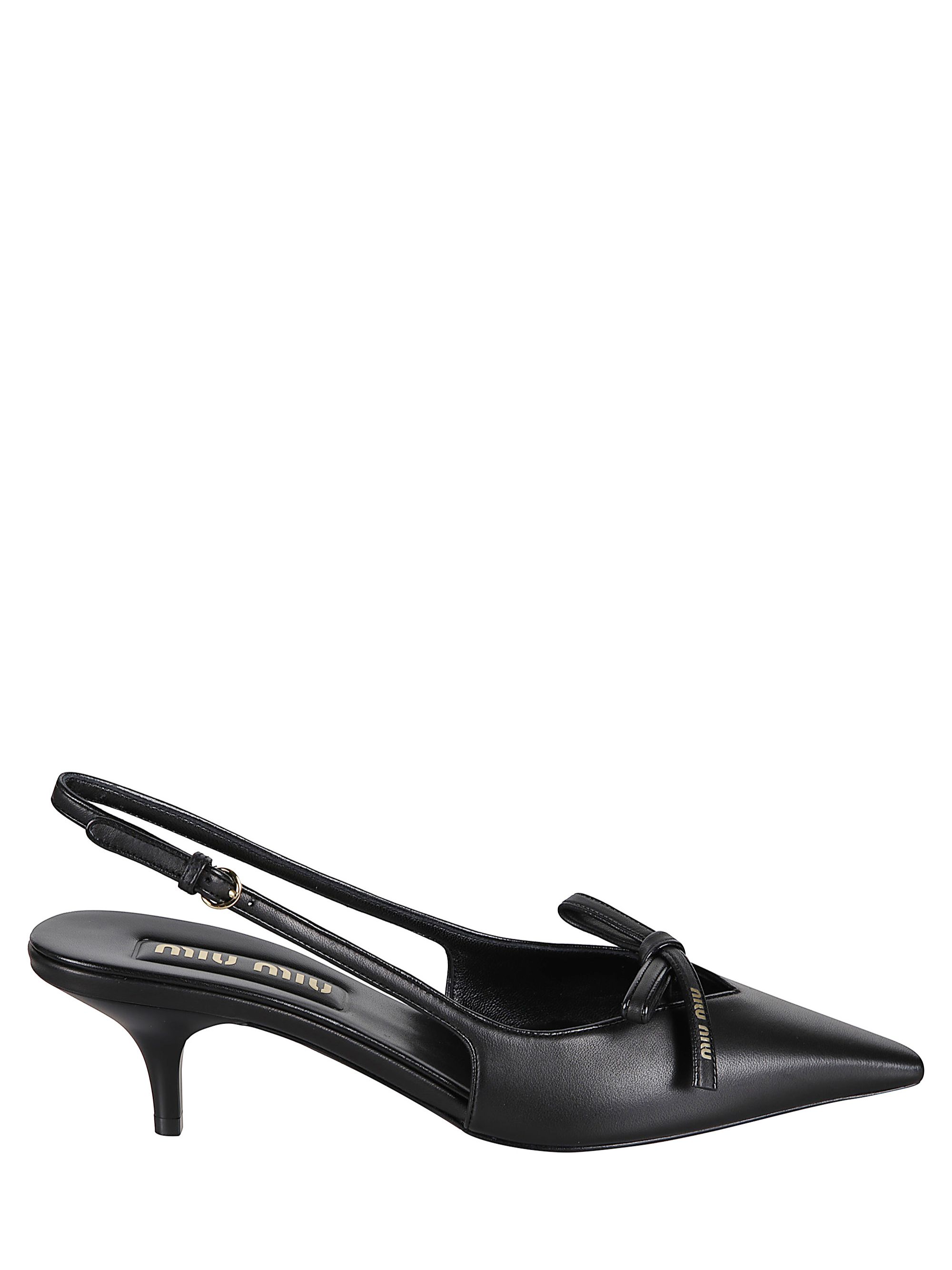 MIU MIU black leather slingback with bow, buckle strap and 5 cm heel.