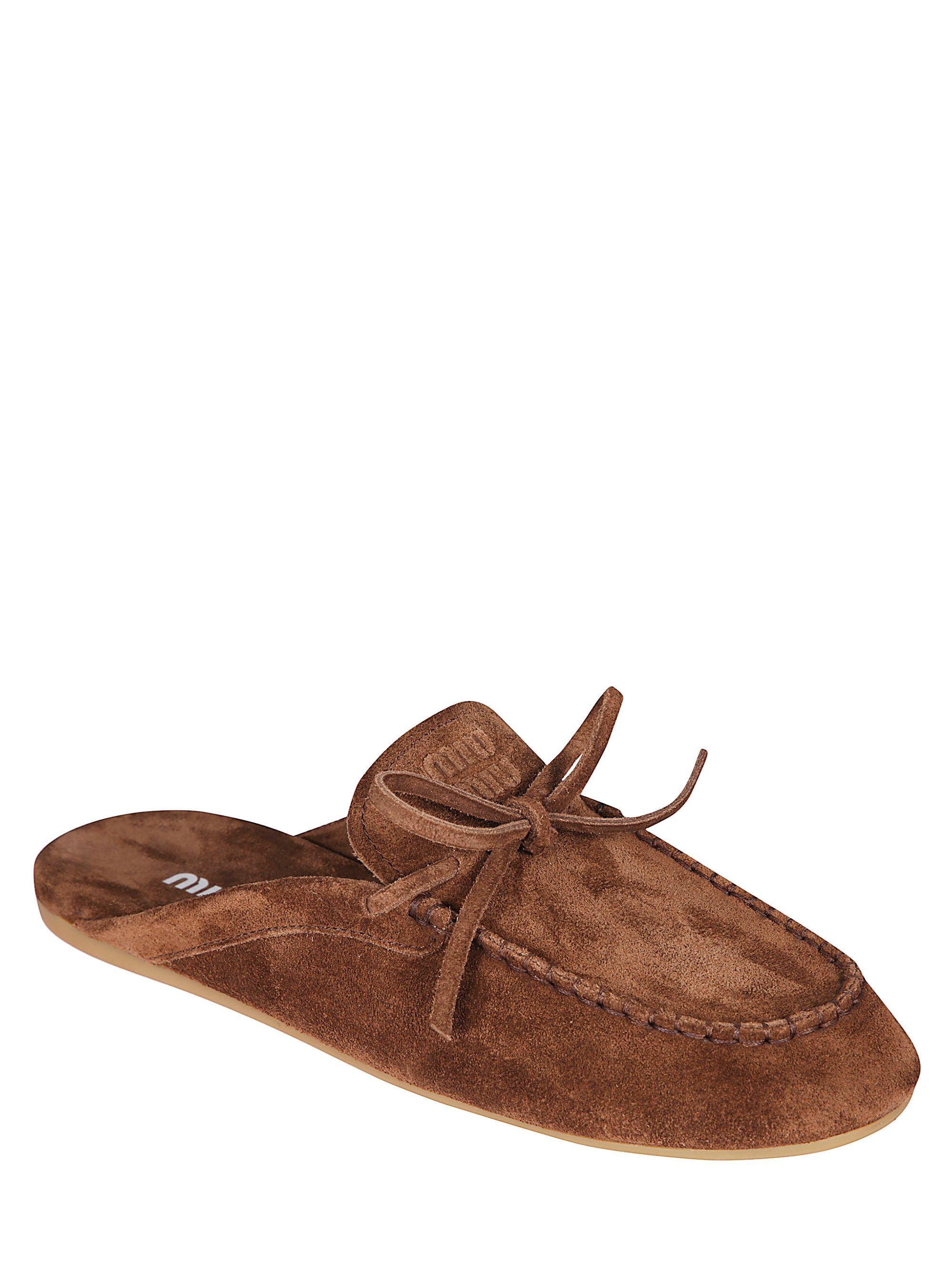 Brown suede mules by MIU MIU, featuring a rounded toe, embossed logo, front bow and rubber sole.