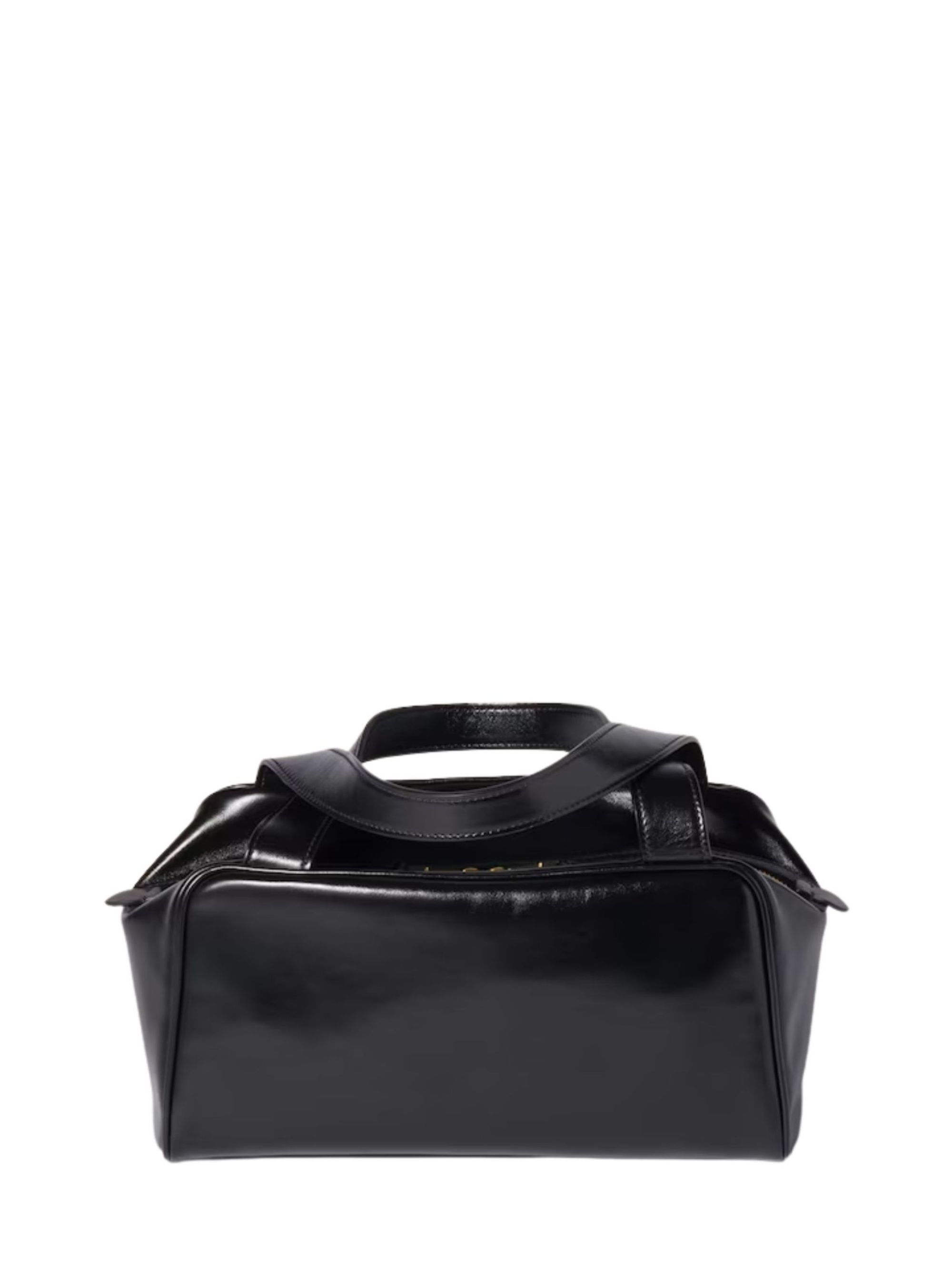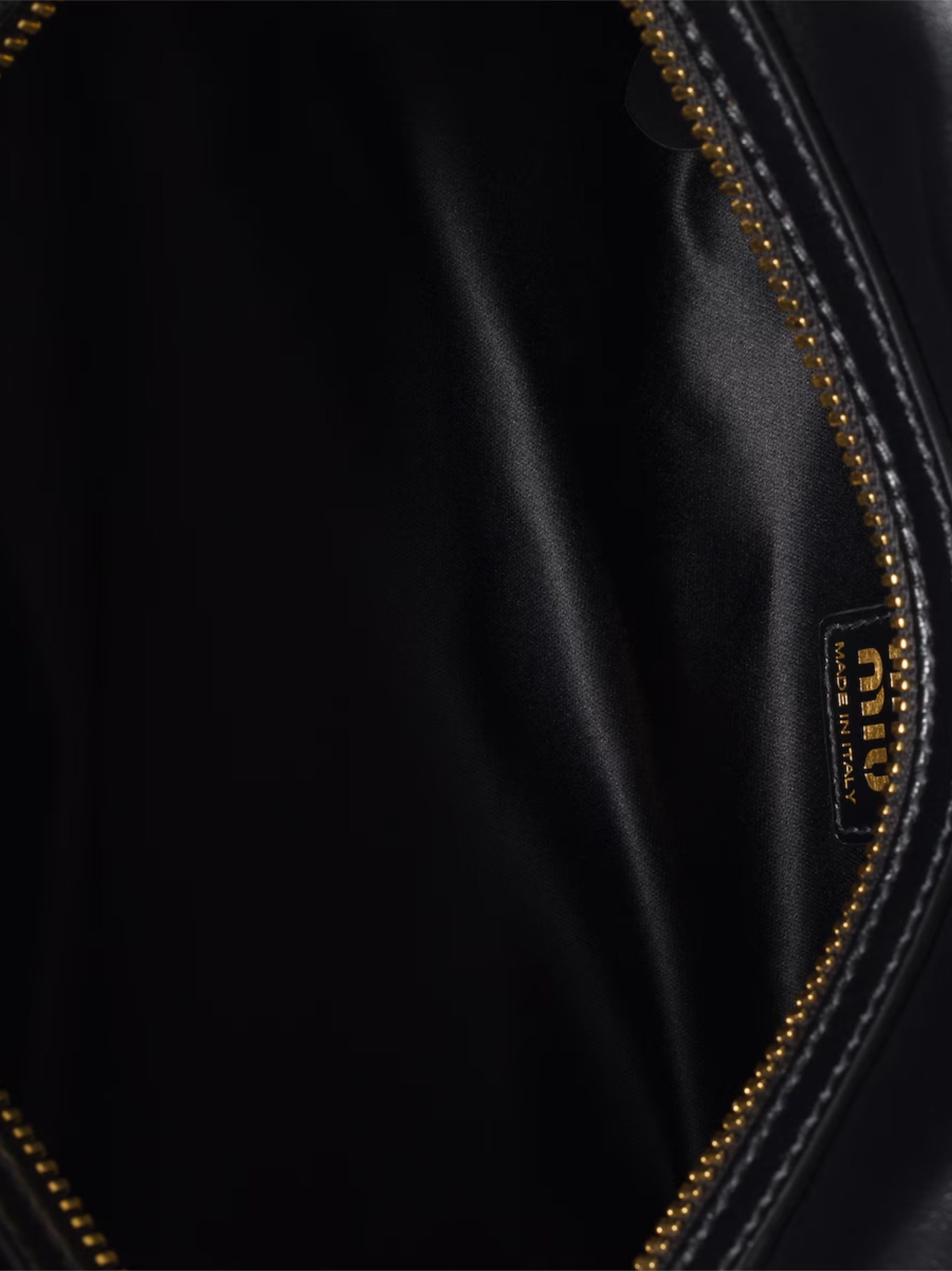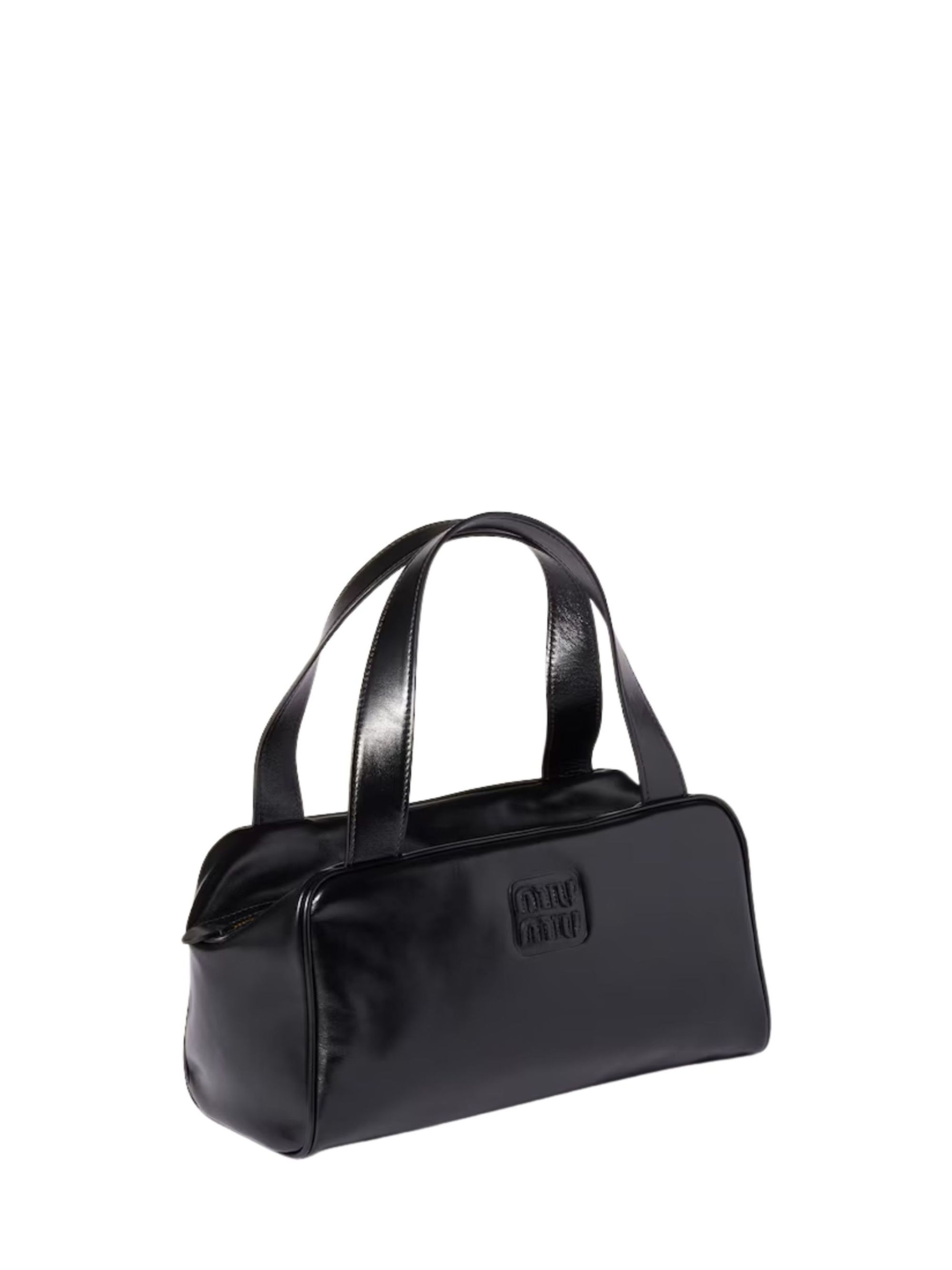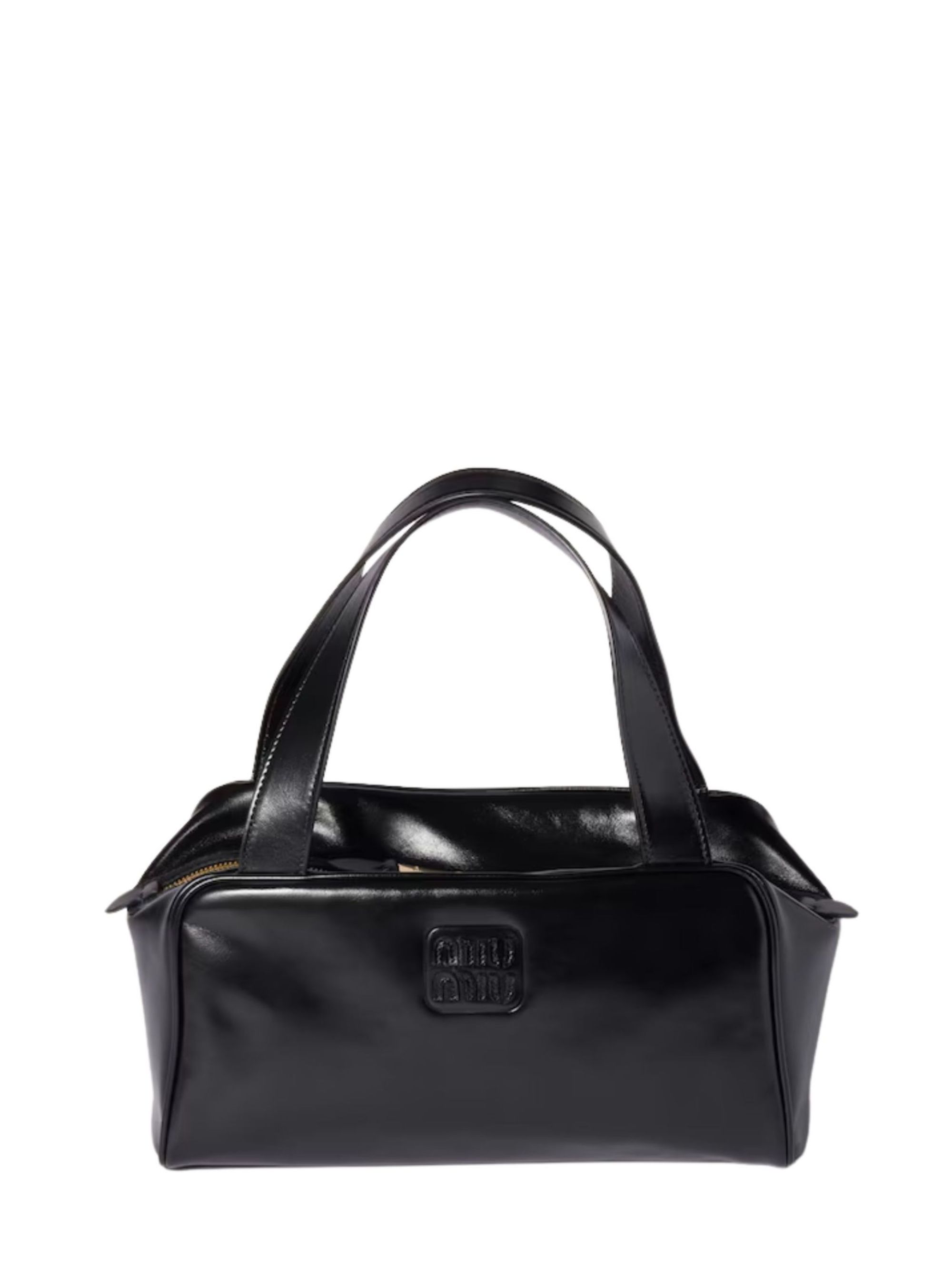 MIU MIU black satchel bag in shiny leather, top handles, gold hardware, cotton satin interior with zip pocket and patch pocket, leather logo lettering on the front, and zip closure. Dimensions: 28 x 13 x 15 cm