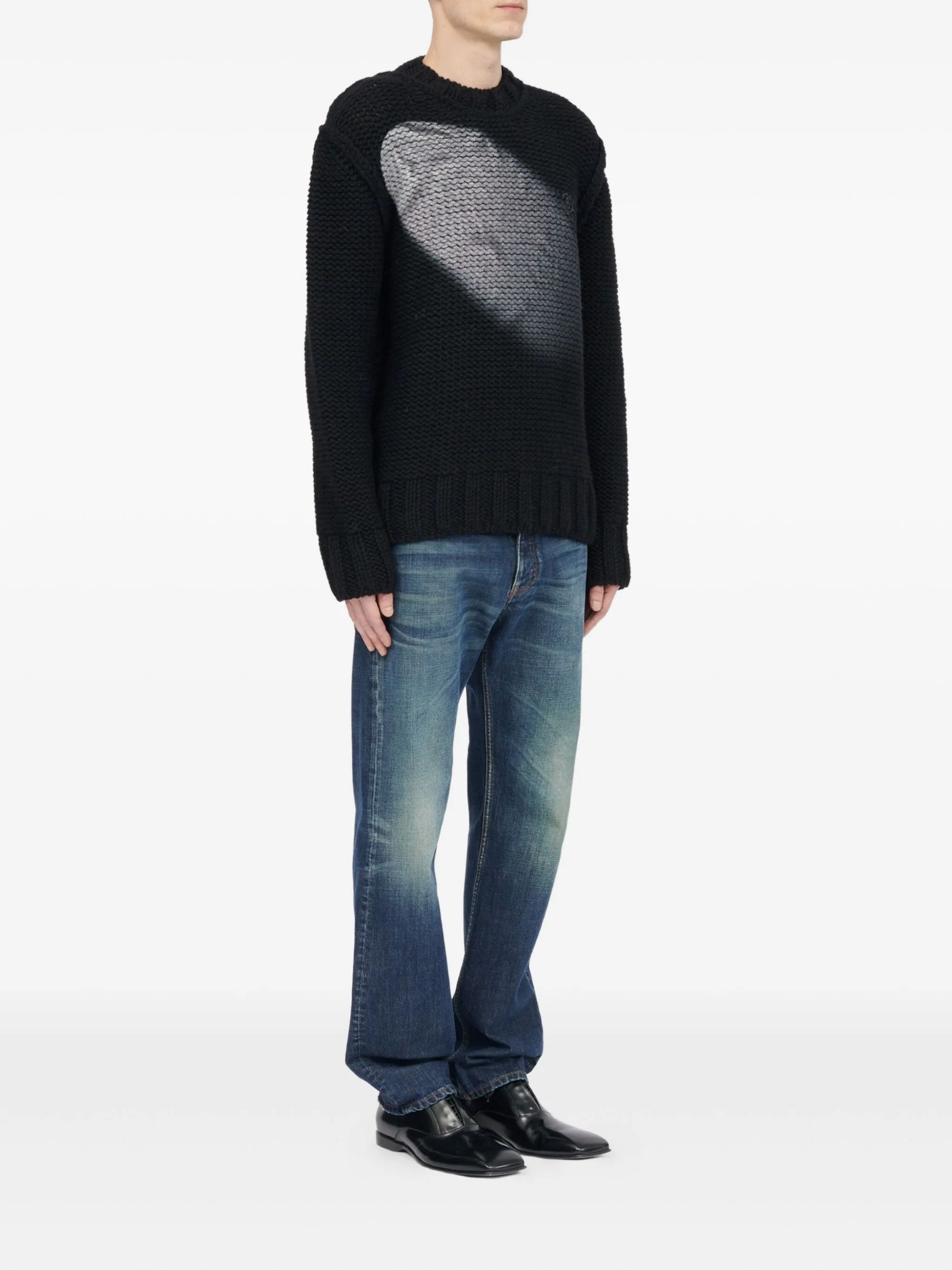 Black wool crewneck sweater by MM6, featuring a reflector-effect print and long sleeves.