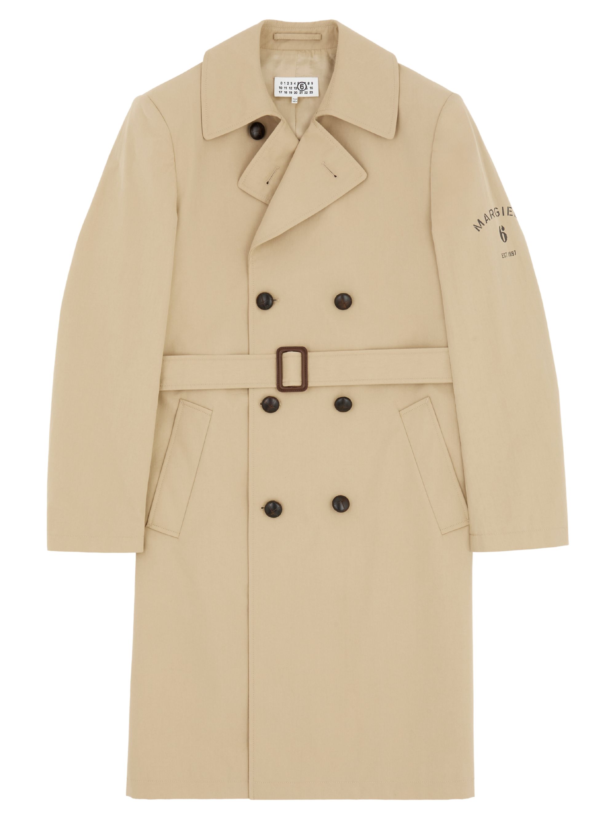 Beige cotton double-breasted trench coat with belt by MM6, featuring double-breasted button fastening, shirt collar, belted waist and white stitching on the back.