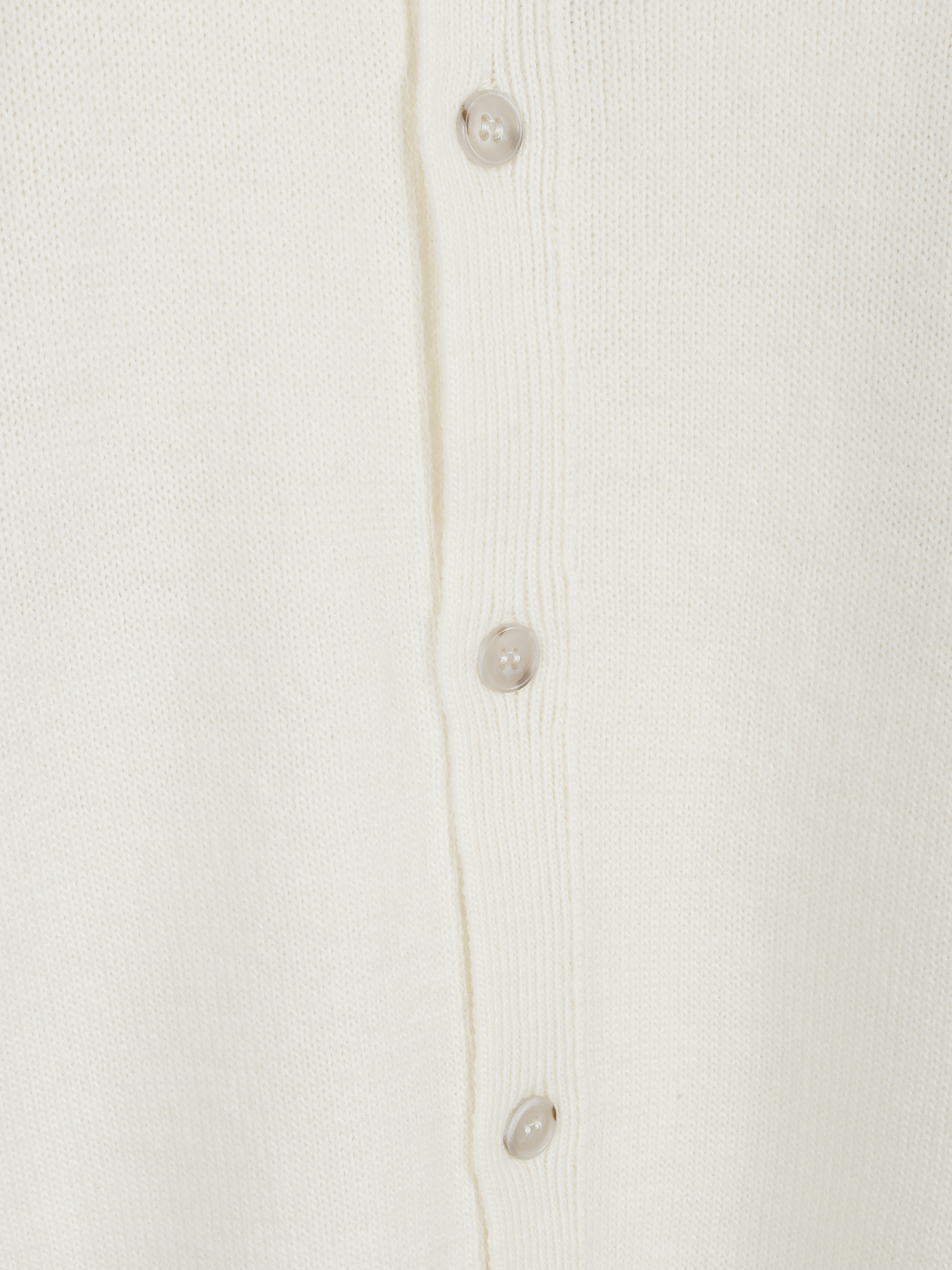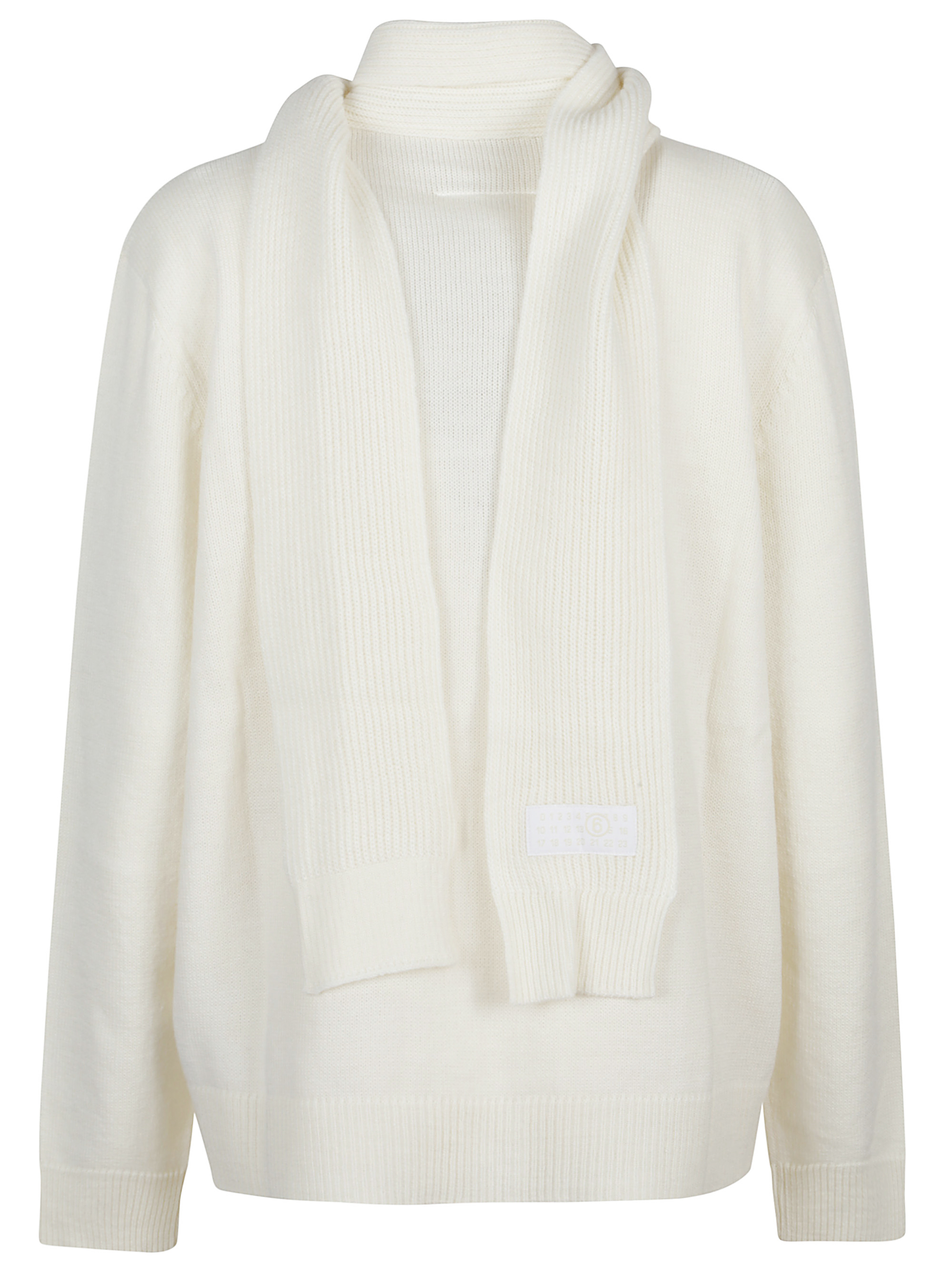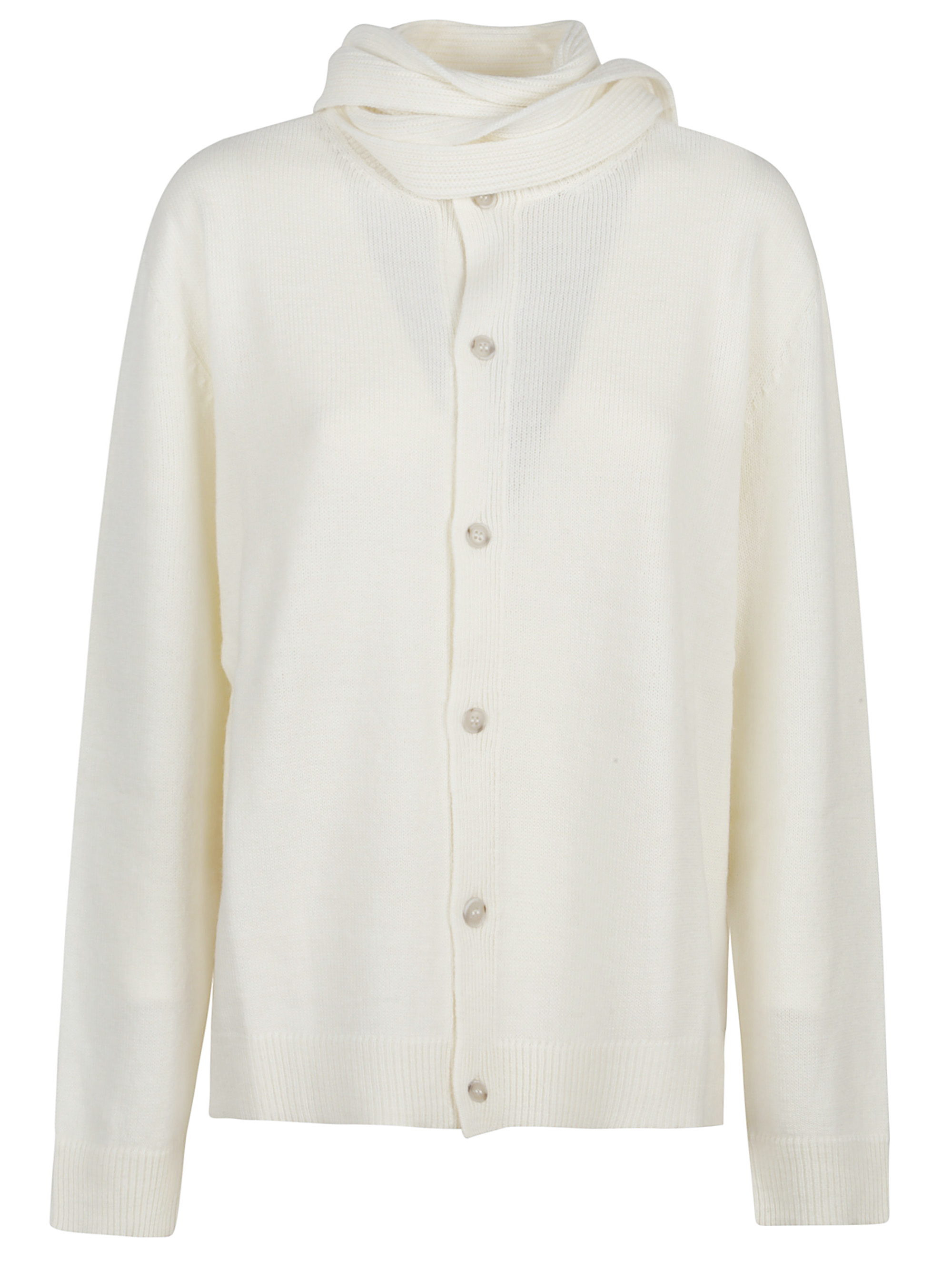 MM6 ivory virgin wool scarf cardigan with a scarf detail, logo, and button closure.