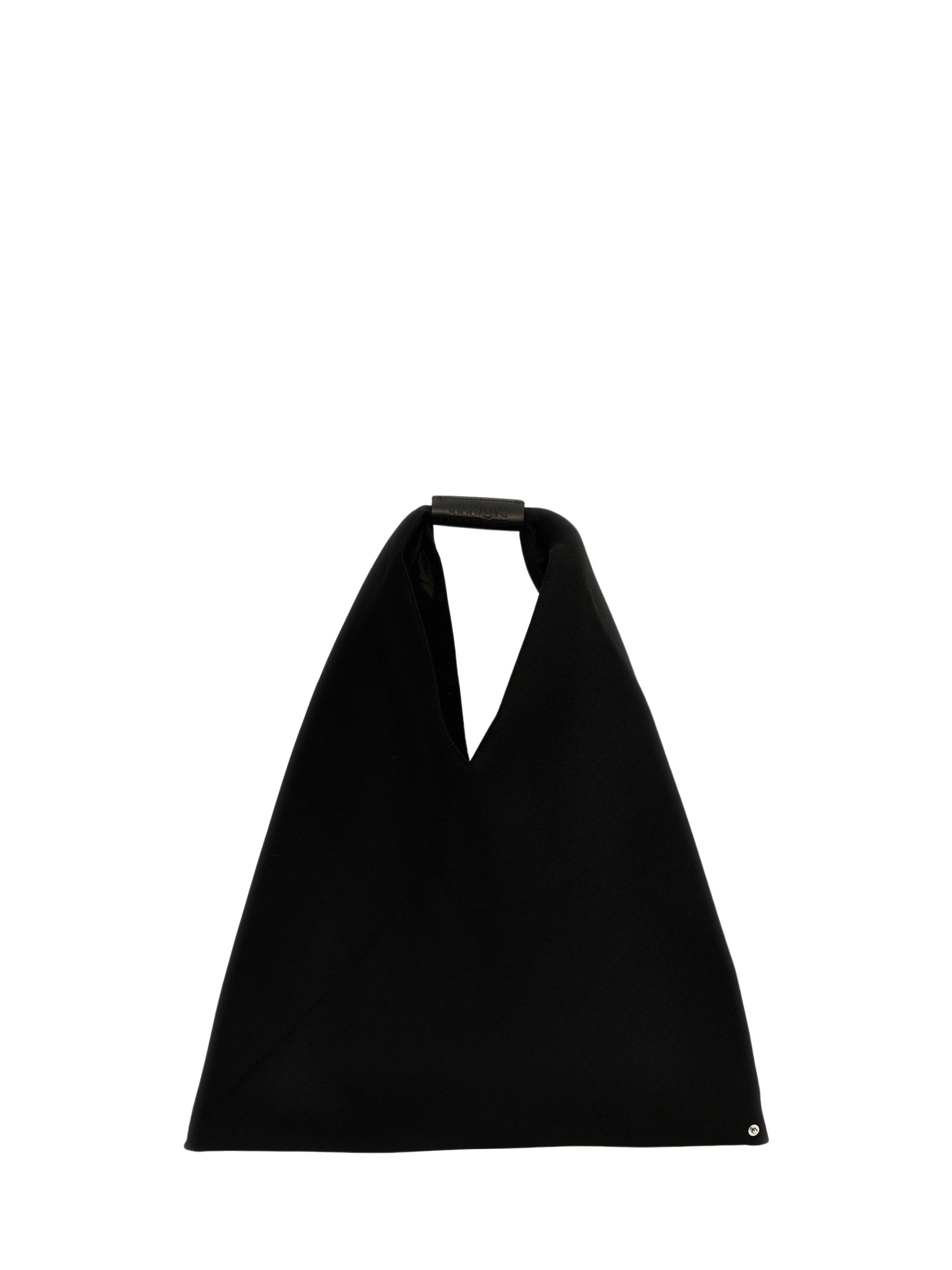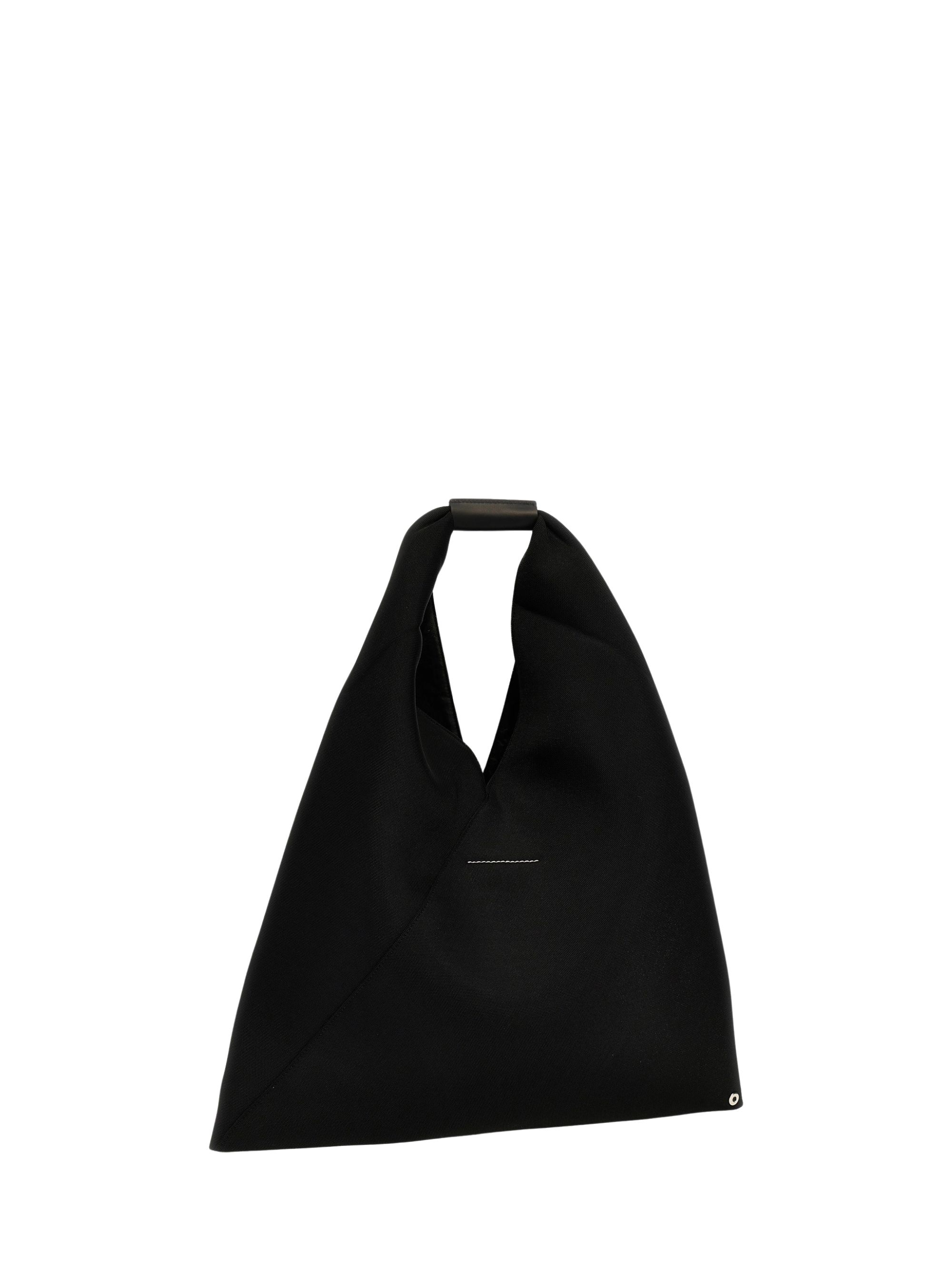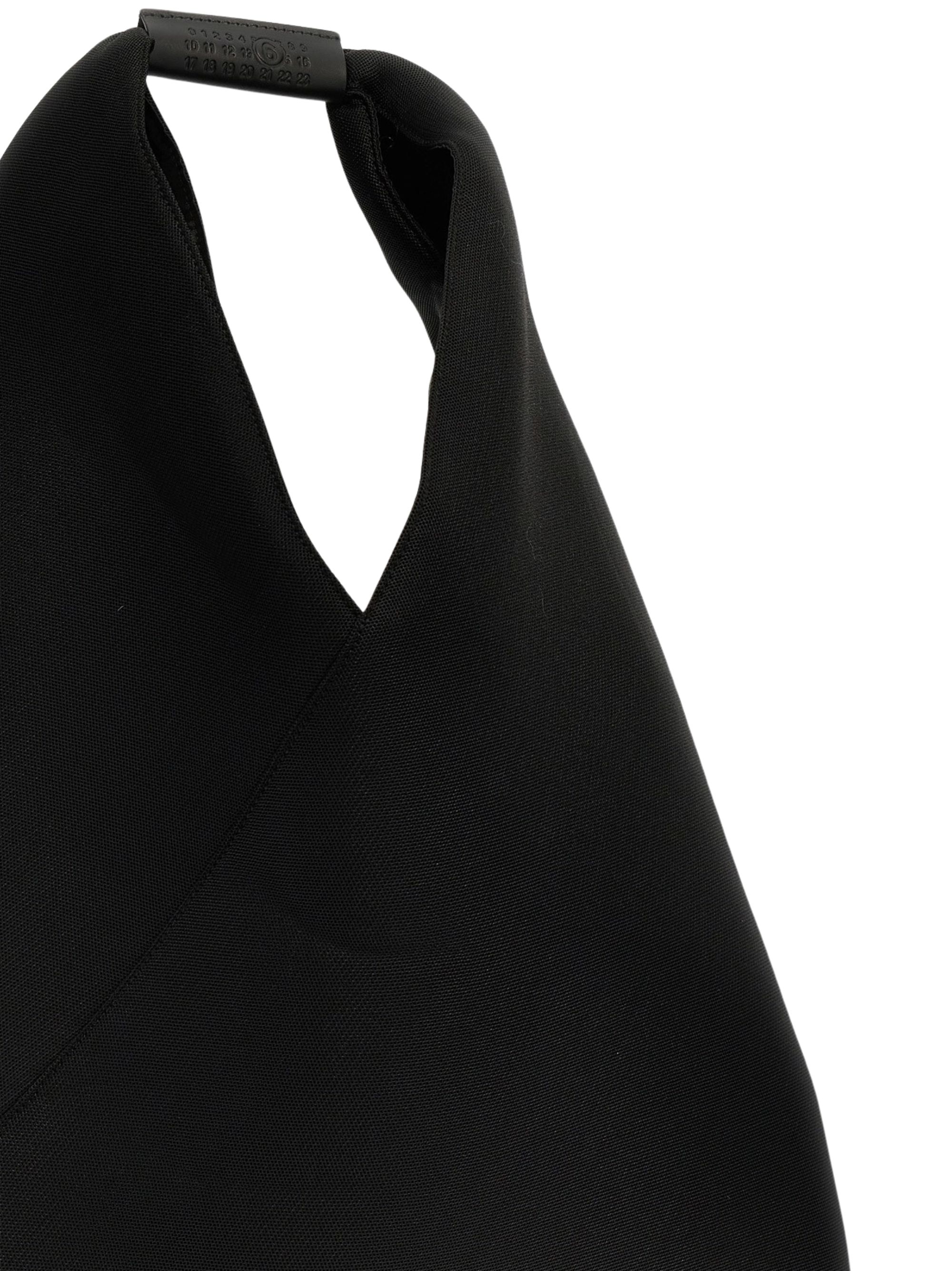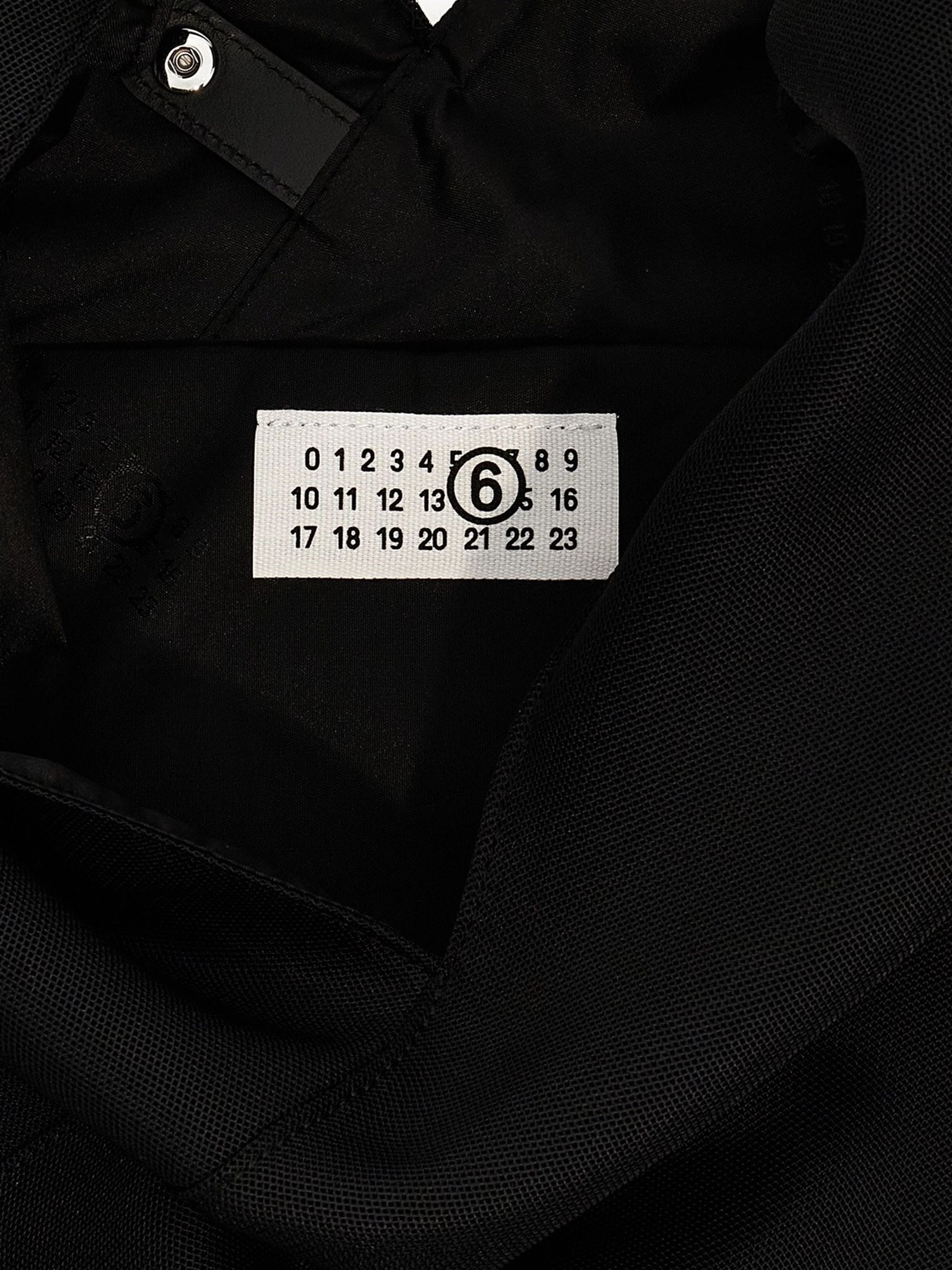 Black Japanese leather bag by MM6, featuring a top handle with embossed numeric logo, snap button closure on the corner and white stitching on the back.