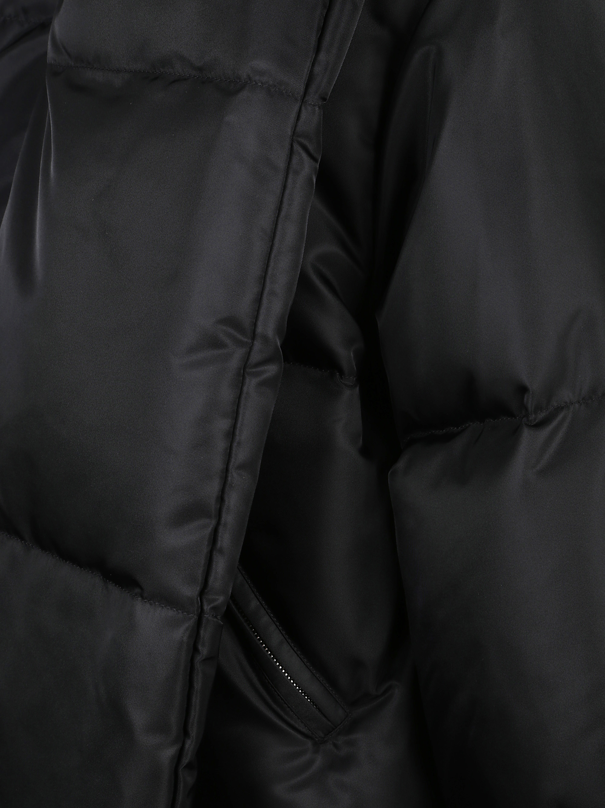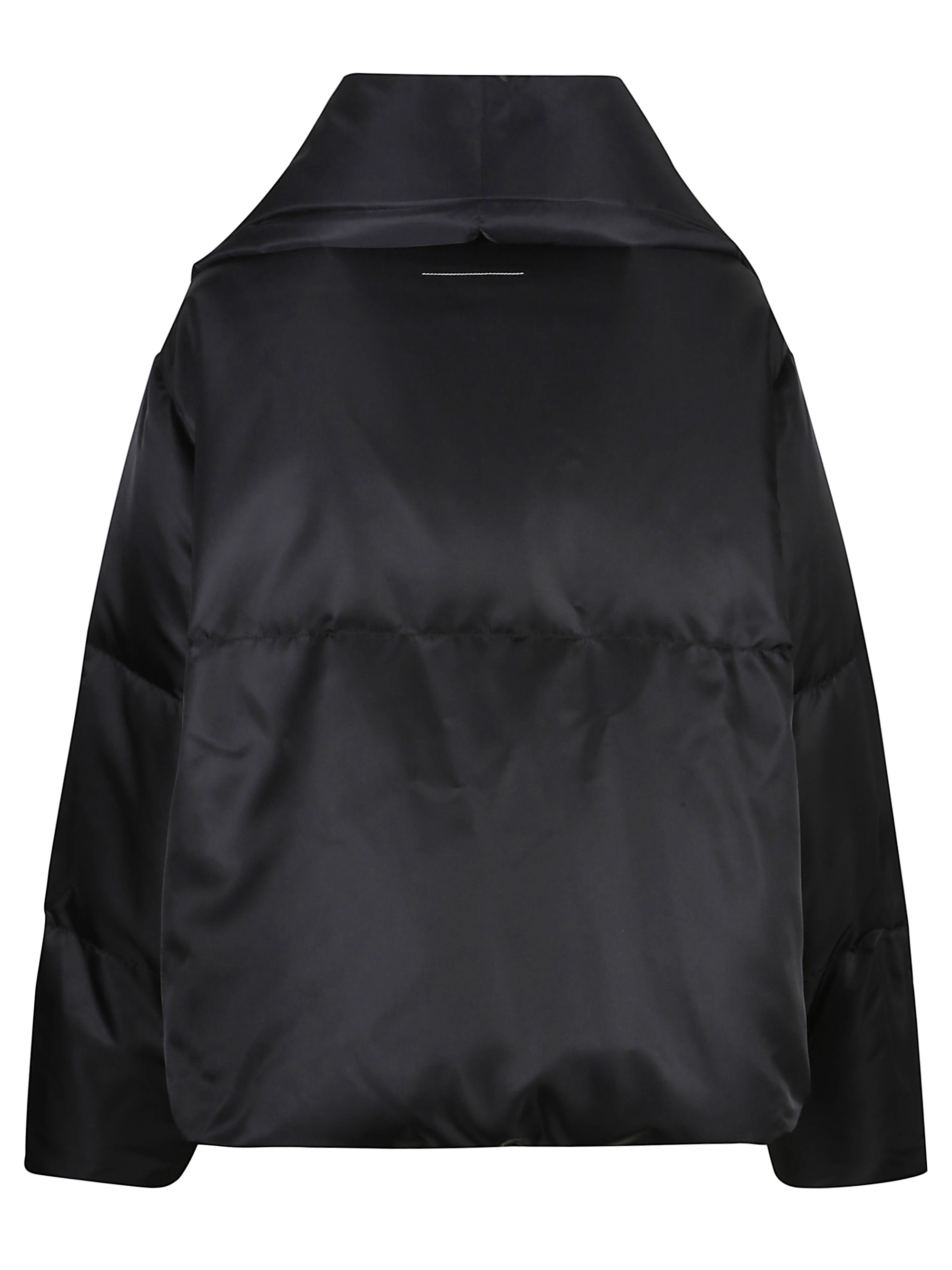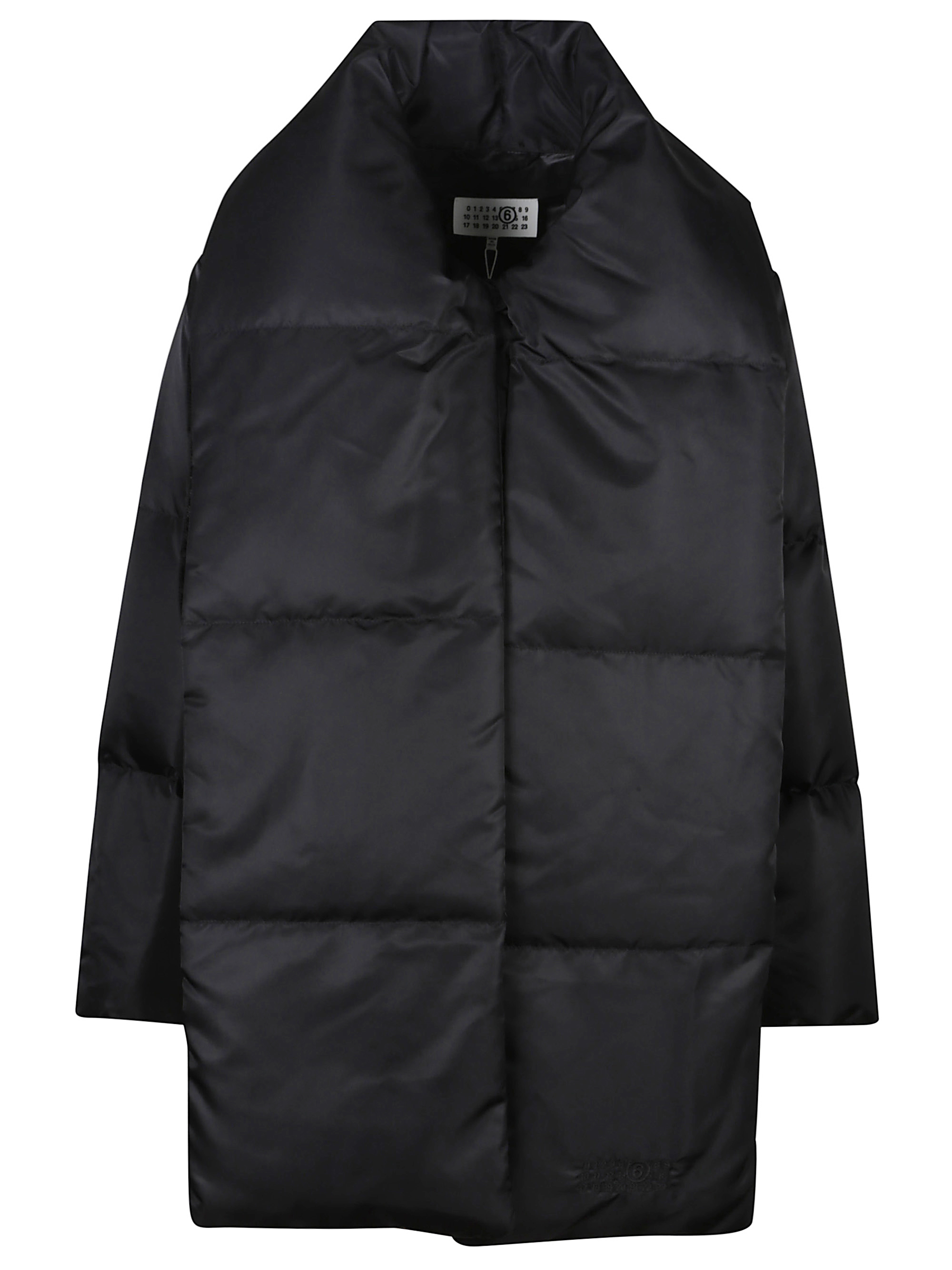 MM6 quilted down jacket in black with an oversized collar and a hidden zip closure.