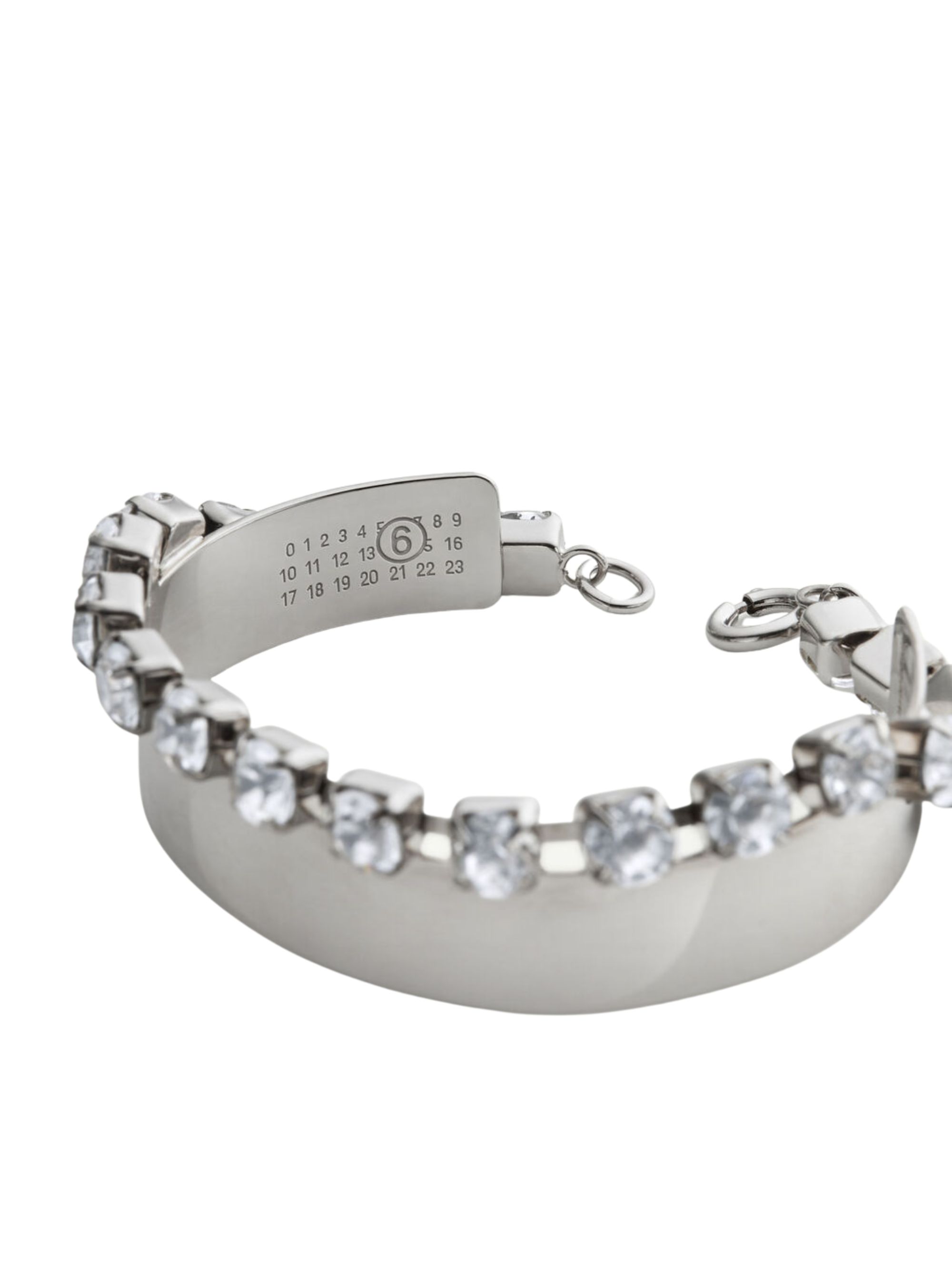 MM6 silver brass rhinestone bracelet, featuring glass crystal chain details and brand logo engraved on the inner band.
