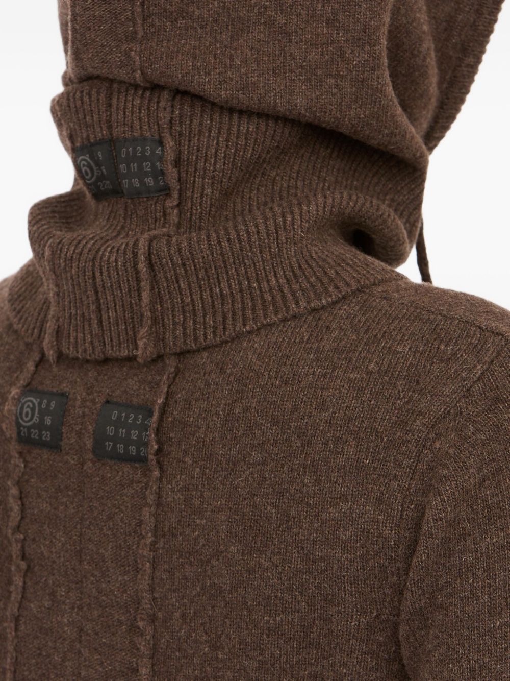 MM6 brown ribbed wool balaclava with a number logo and an adjustable closure.