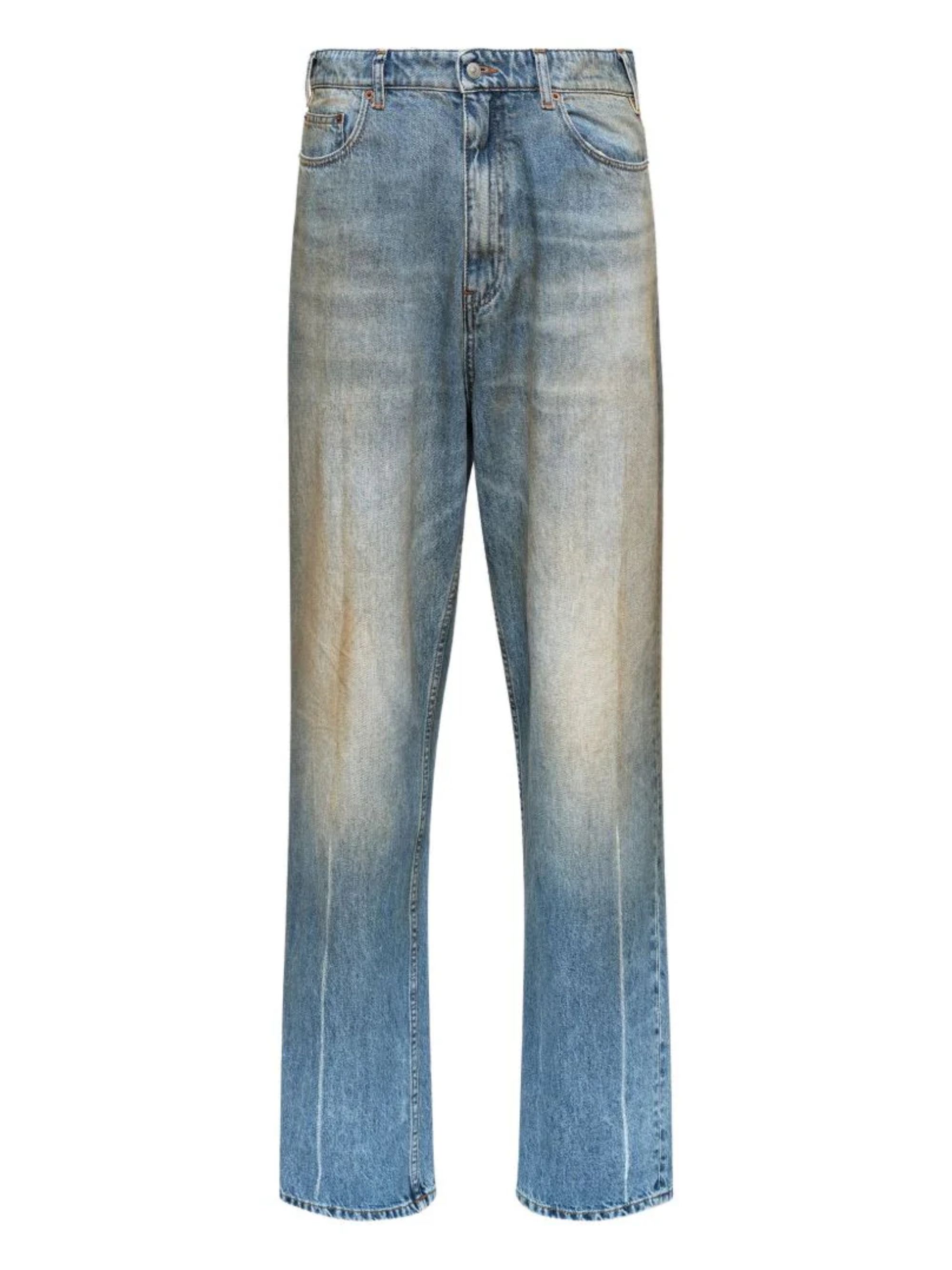 Straight leg jeans by MM6 in blue cotton denim featuring a worn effect, with belt loops and zip and button fastening.