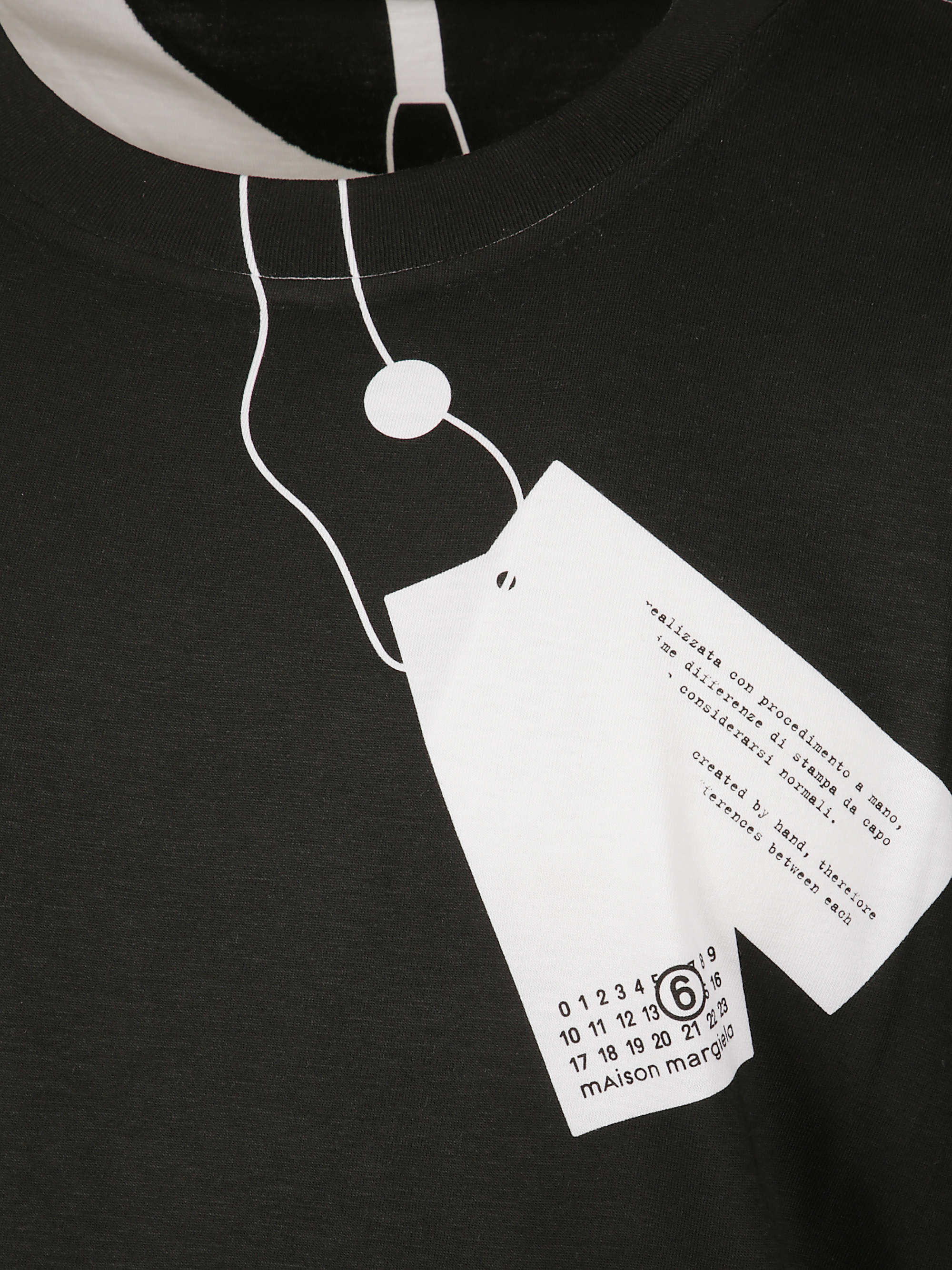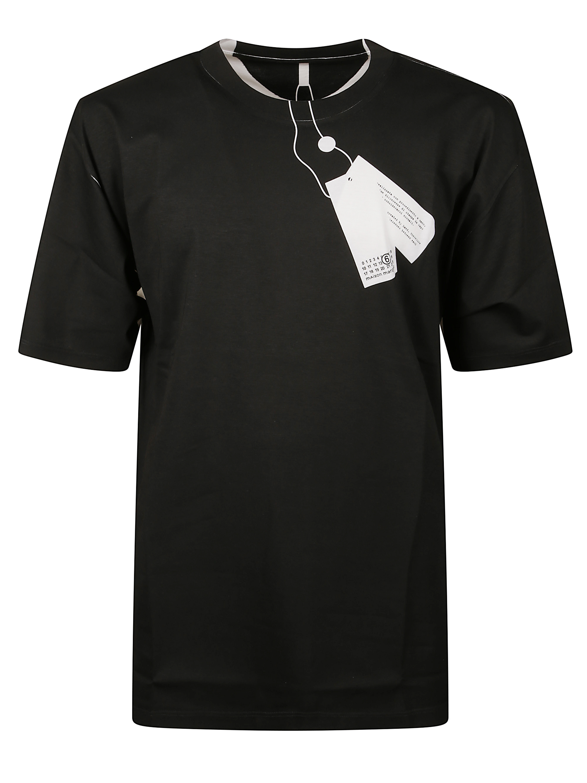 Black cotton trompe l'oeil T-shirt by MM6, featuring a printed label on the front, short sleeves and white MM6 stitching on the back.