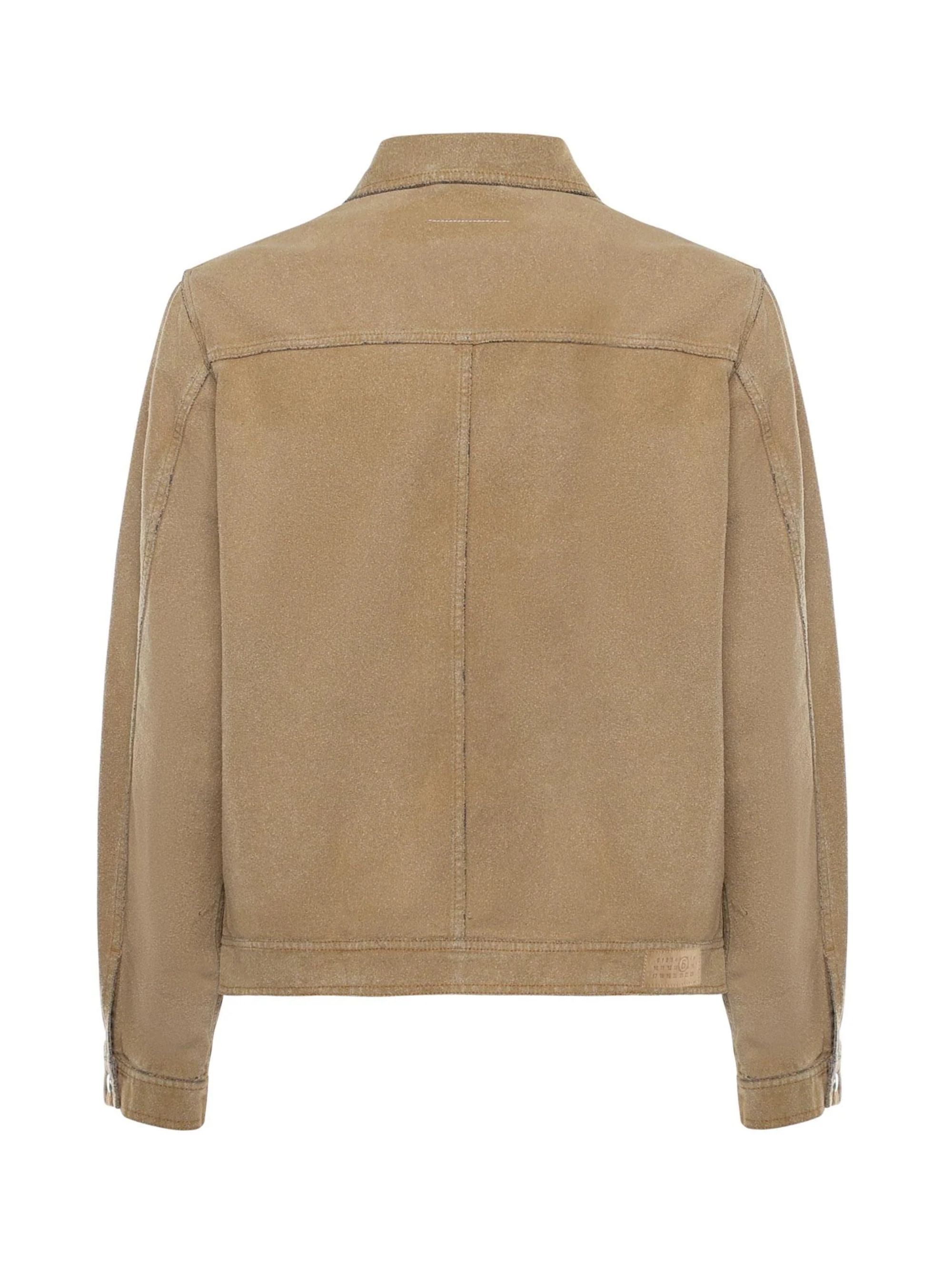 MM6 beige denim trucker jacket featuring a front button fastening, white Maison stitching on the back, flap pockets, shirt collar and snap fastening on the chest.