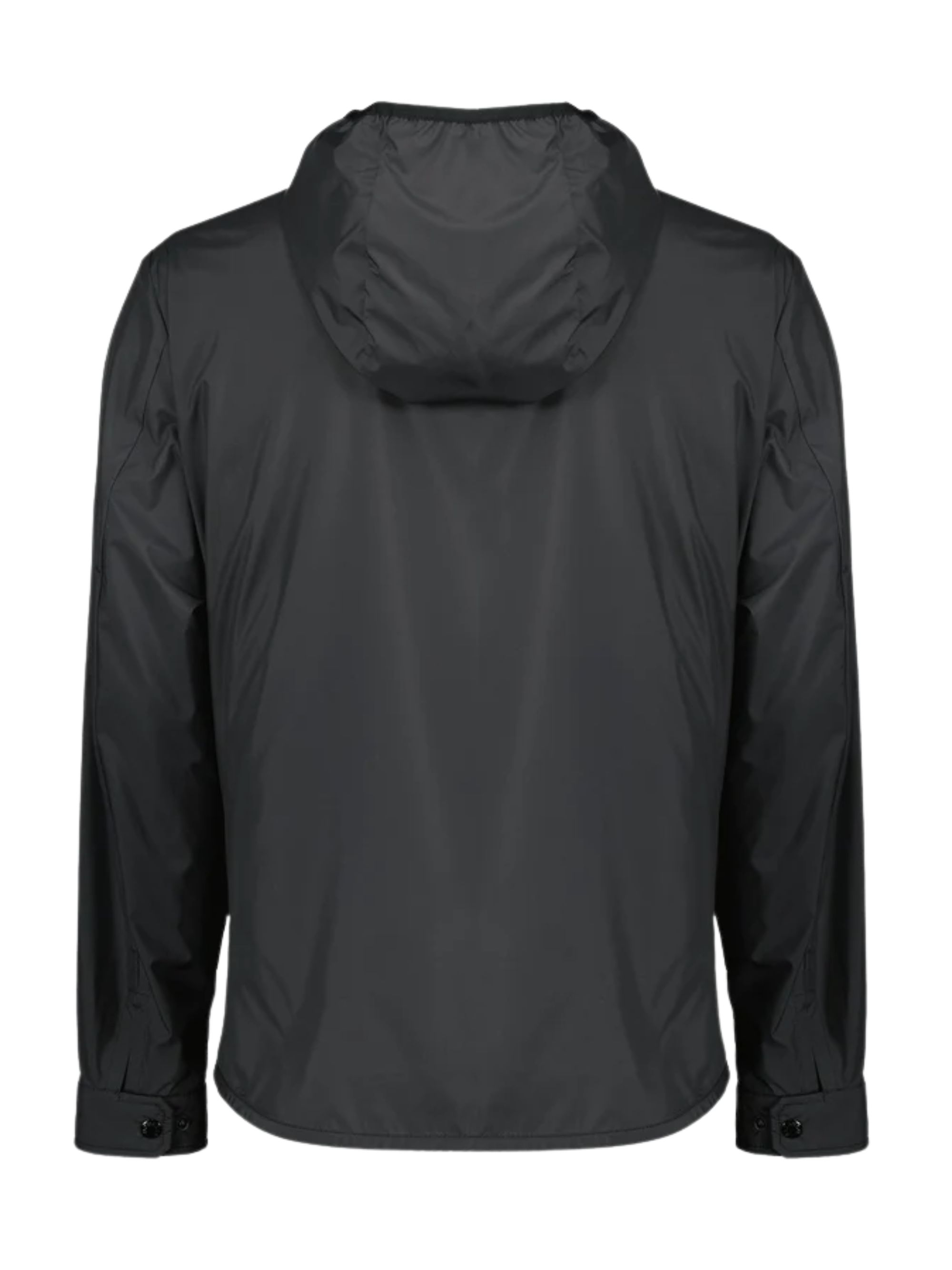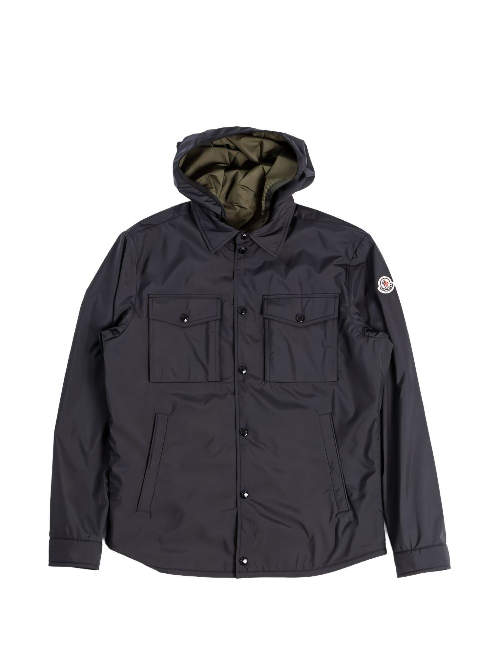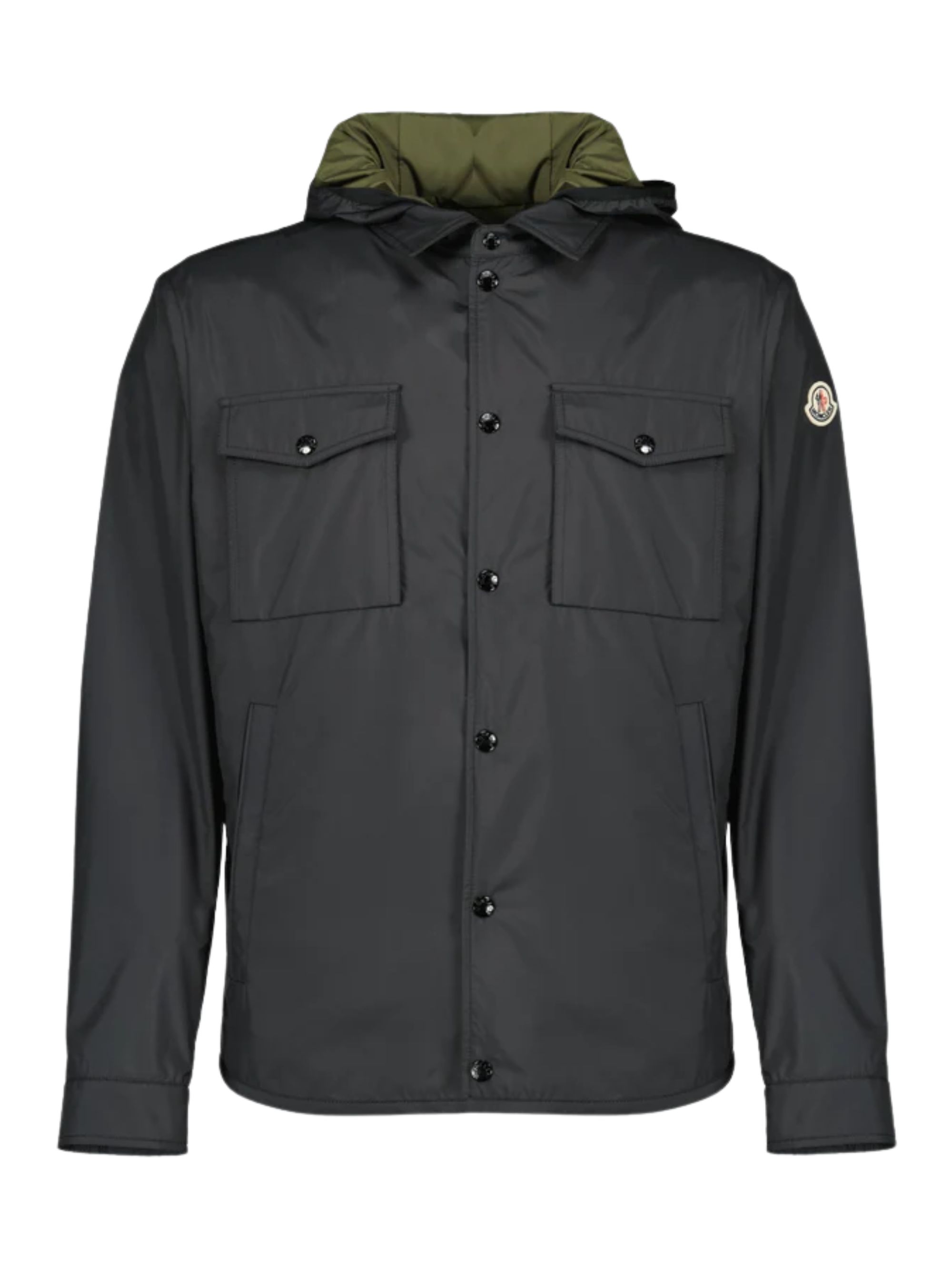 black hooded front button fastening chest flap pockets side welt pockets long sleeves