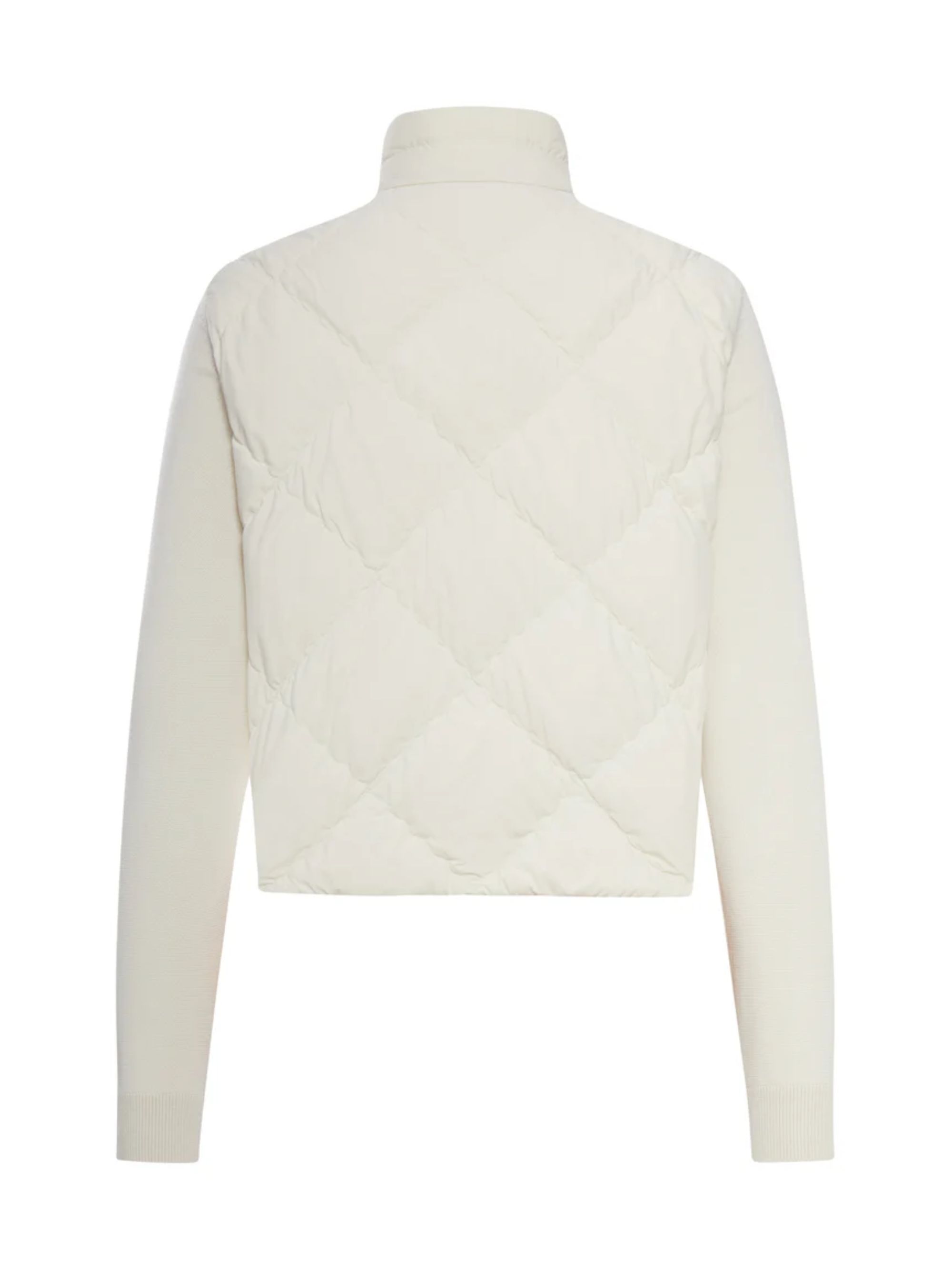 White MONCLER diamond-quilted jacket with removable knit sleeves, high collar, patch pockets and gold button fastening.