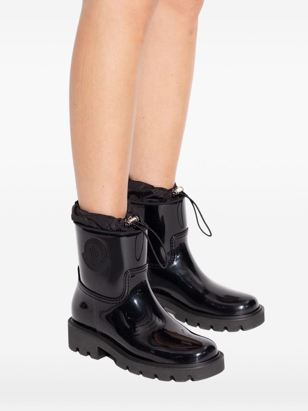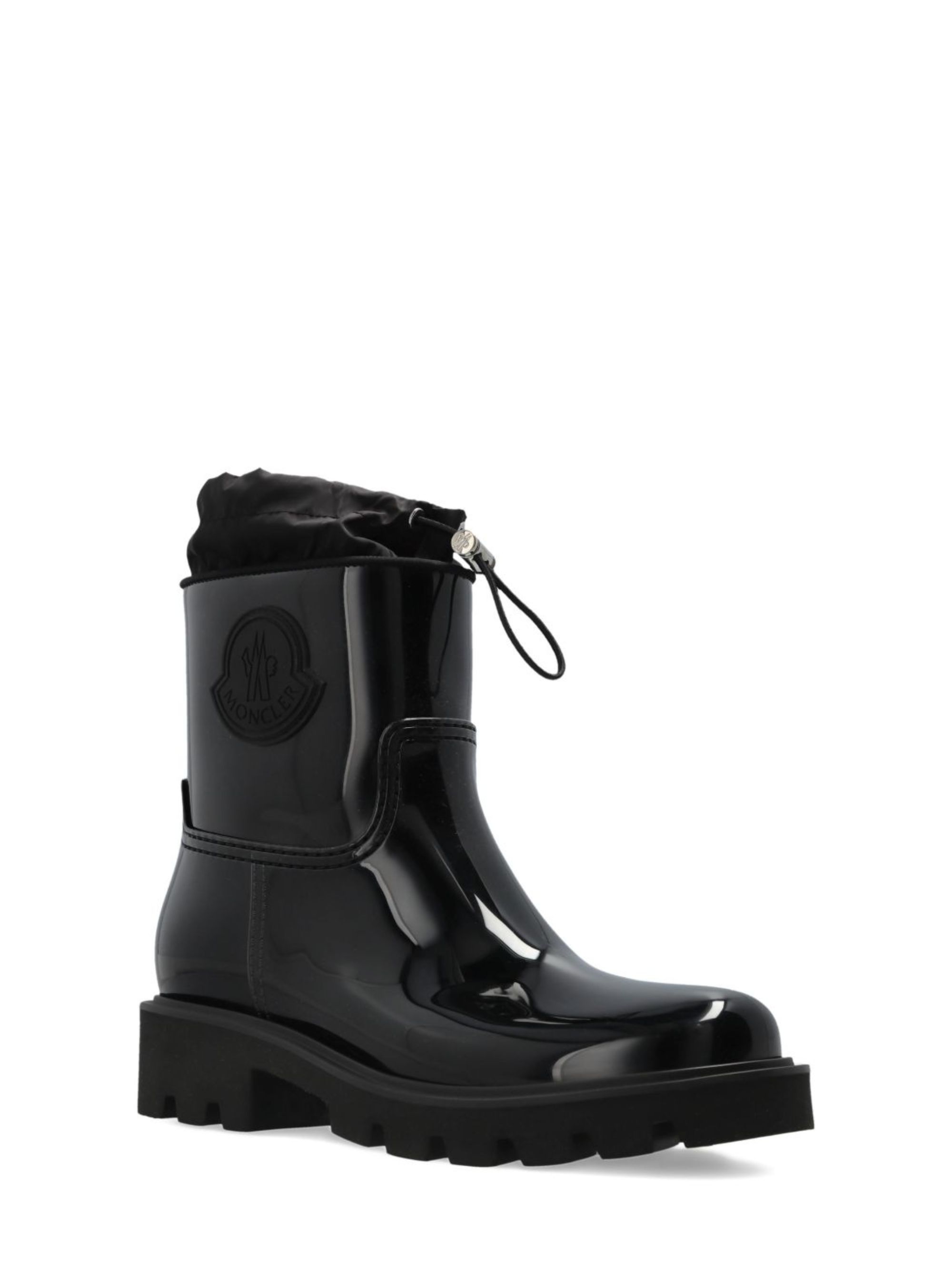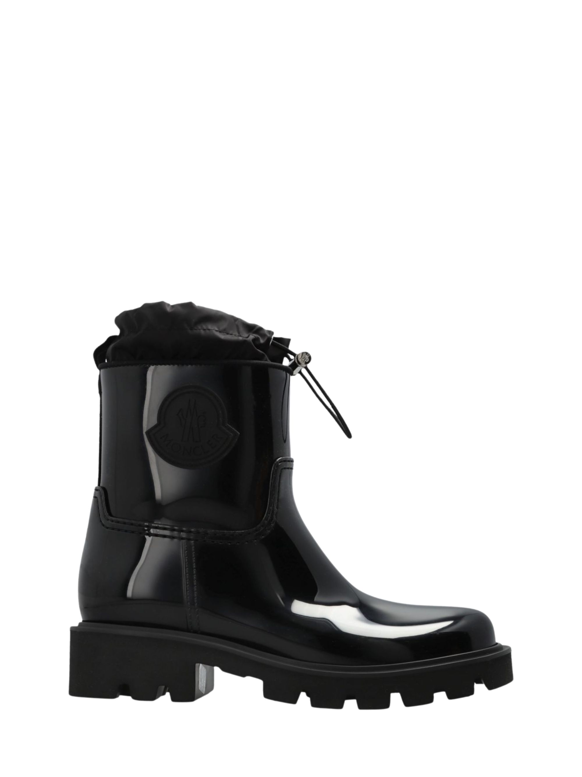 MONCLER Kickstream rain boot in black PVC and nylon, featuring a fabric insole, drawstring closure, EVA tread and side logo.