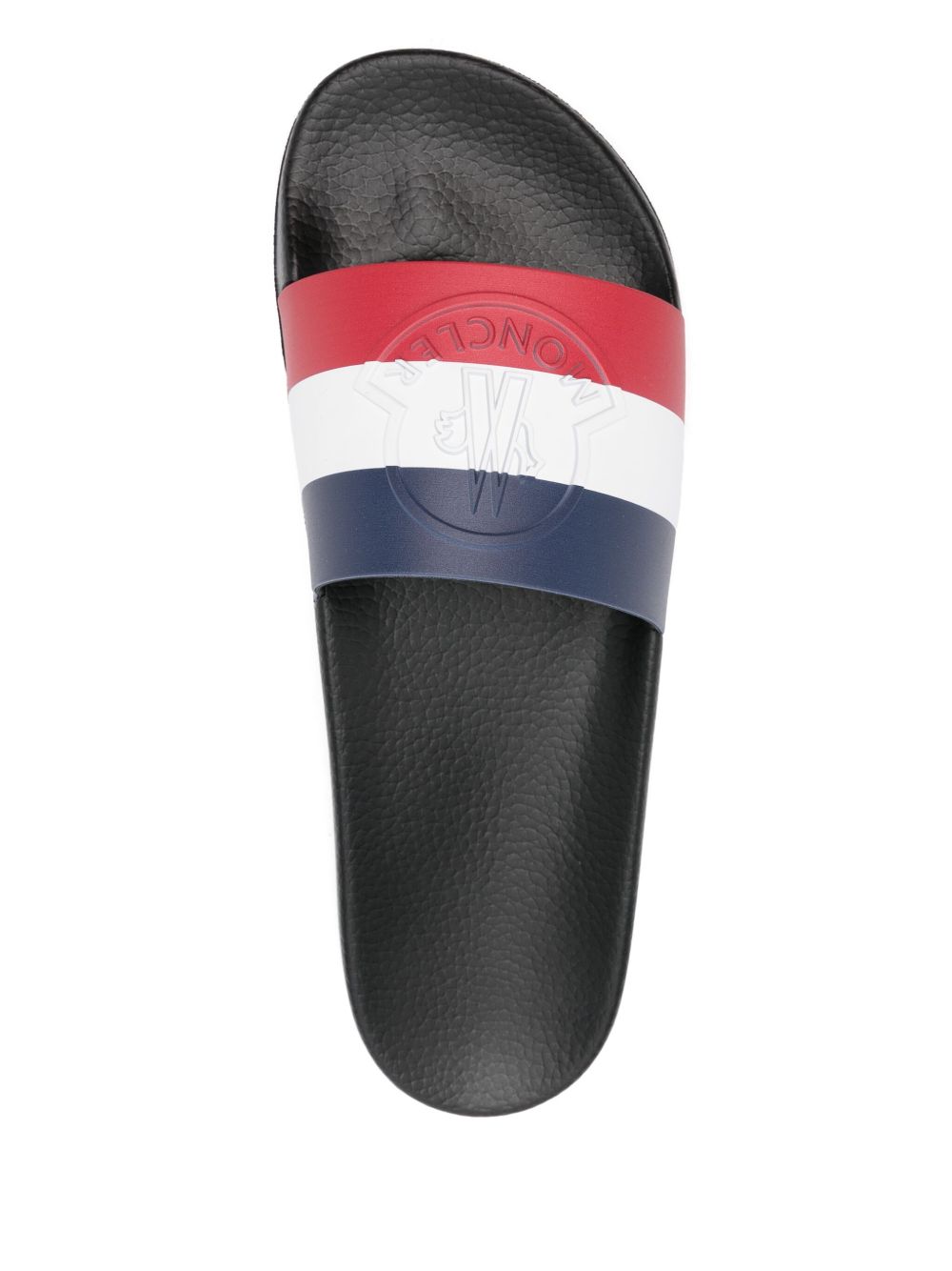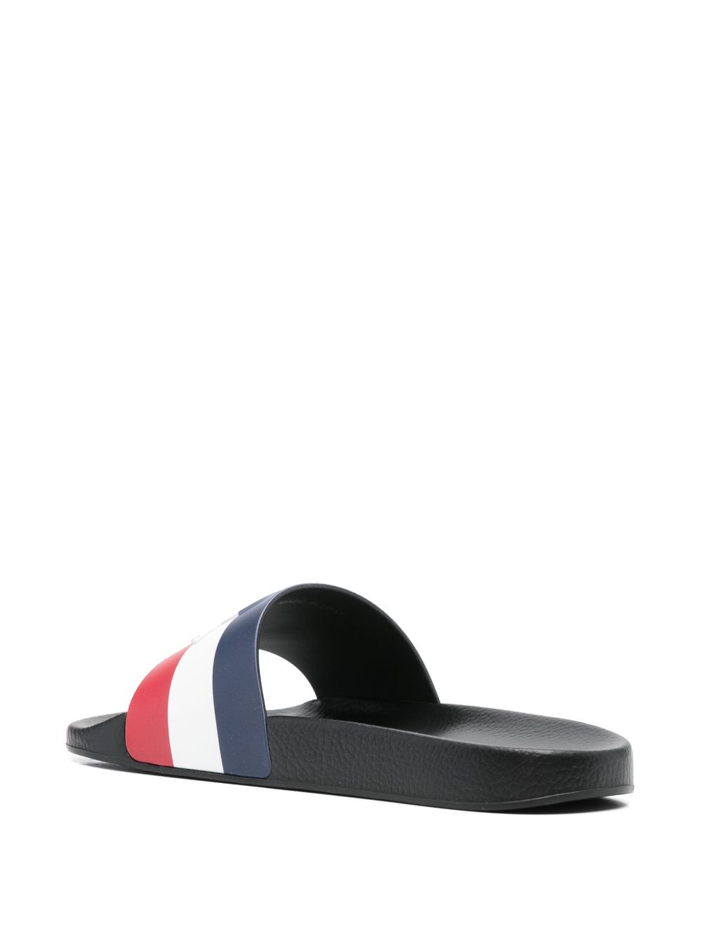 Black MONCLER logo slider with tricolor rubber band.