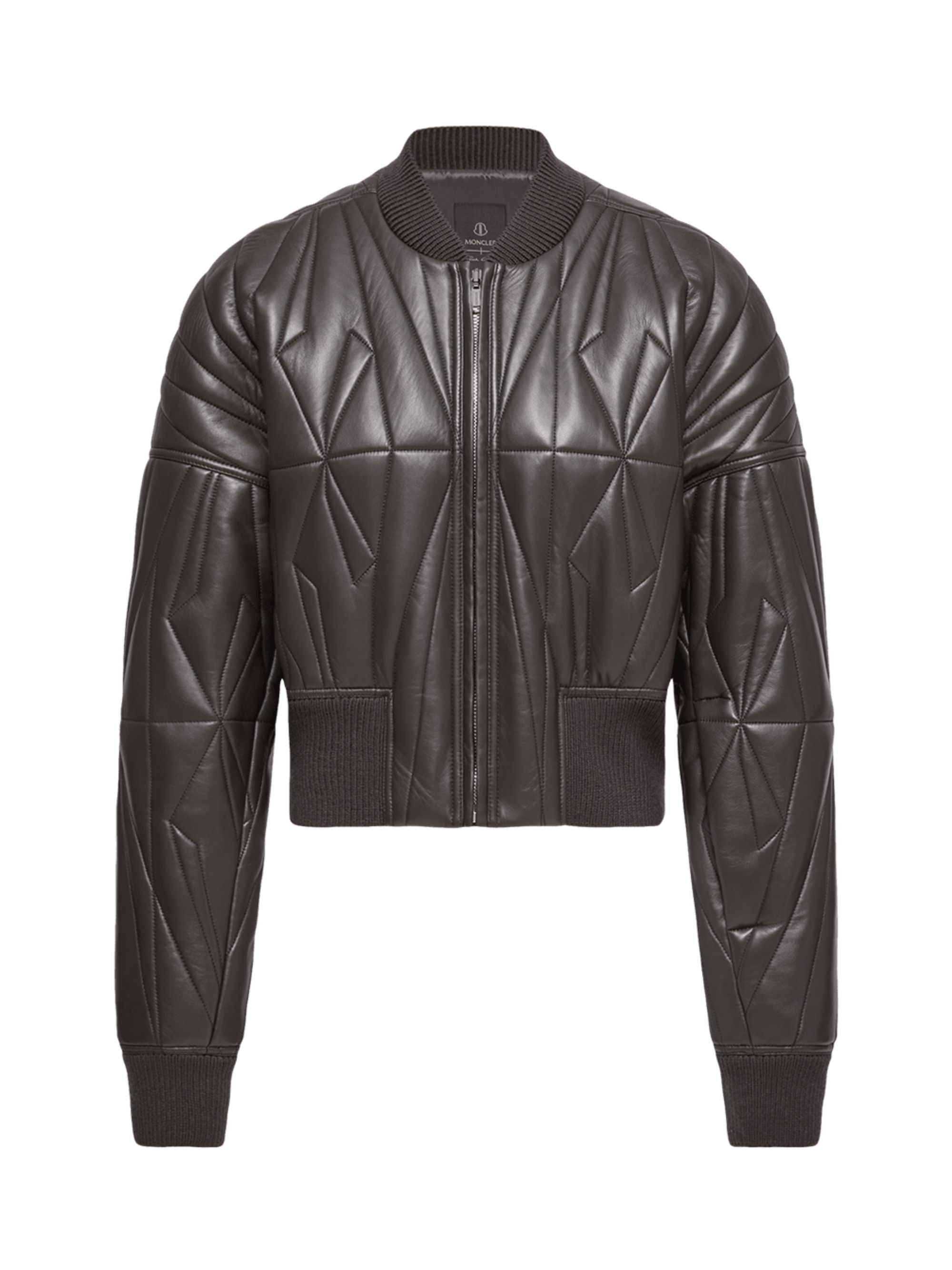 Black leather bomber jacket by MONCLER x RICK OWENS, featuring a quilted design with a geometric pattern, a zip fastening and ribbed knit details.