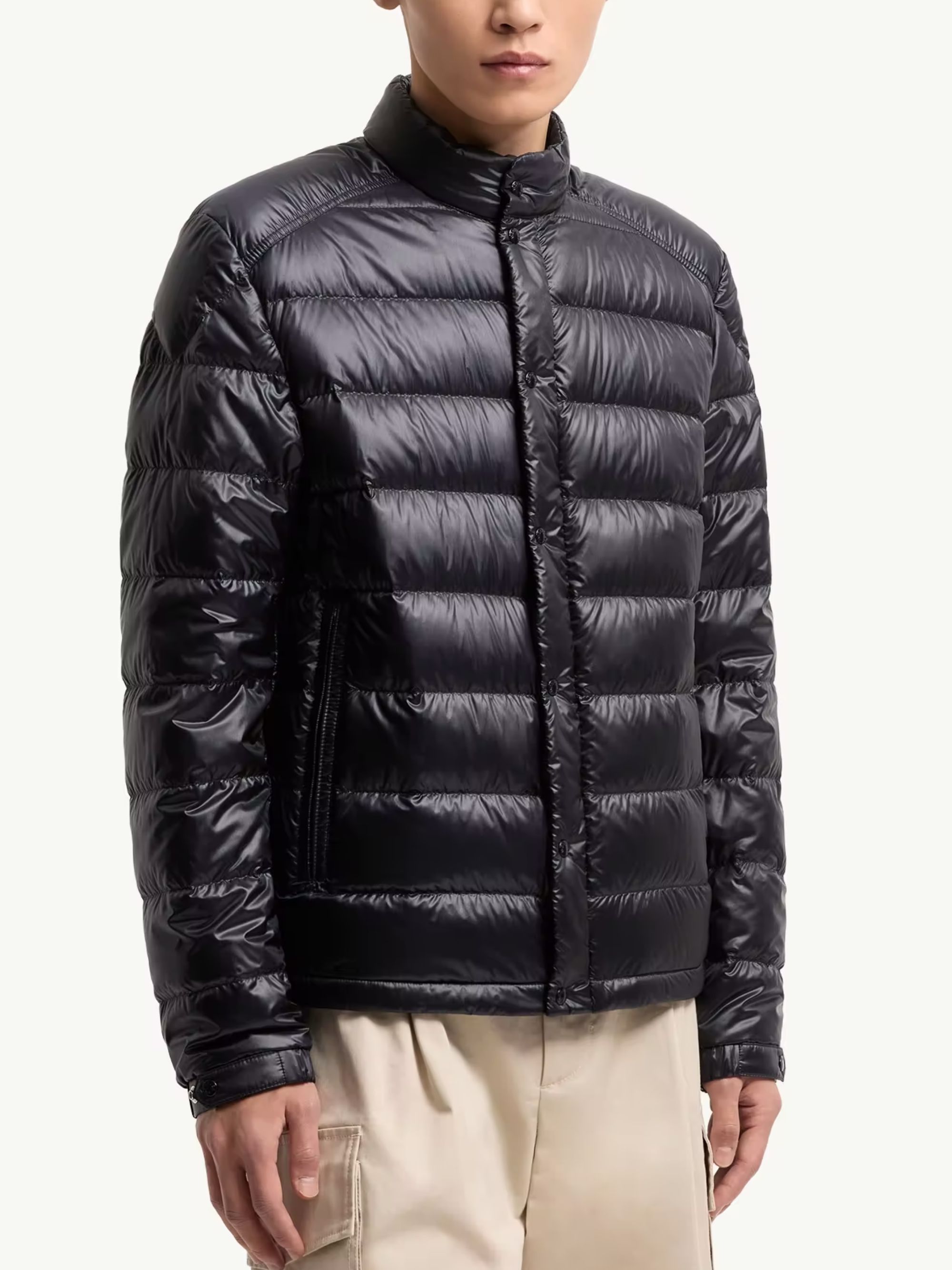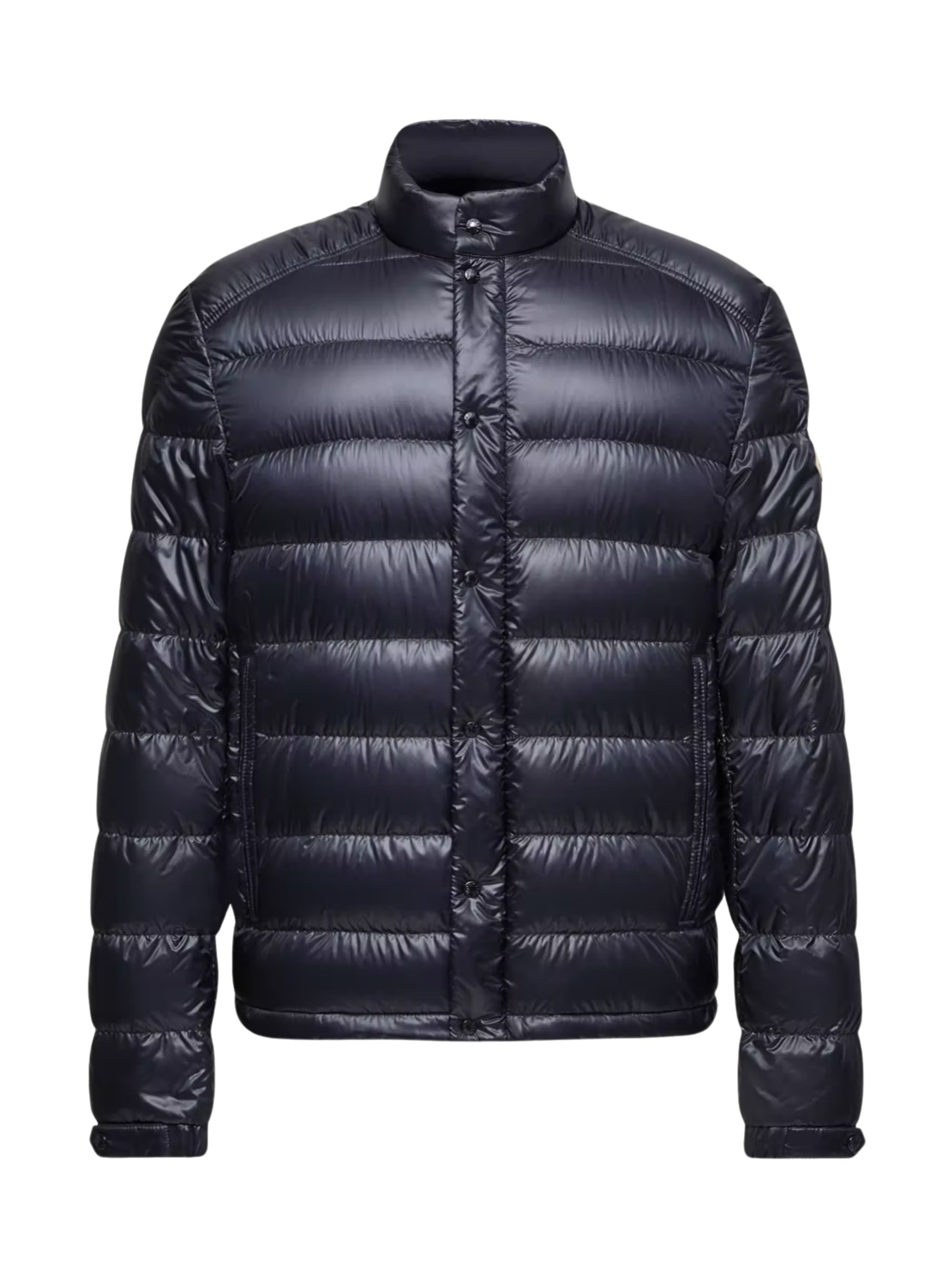 MONCLER Selves blue padded quilted jacket in shiny nylon, featuring a stand-up collar, zip pockets, adjustable cuffs, drawstring hem, and a zip and snap closure.
