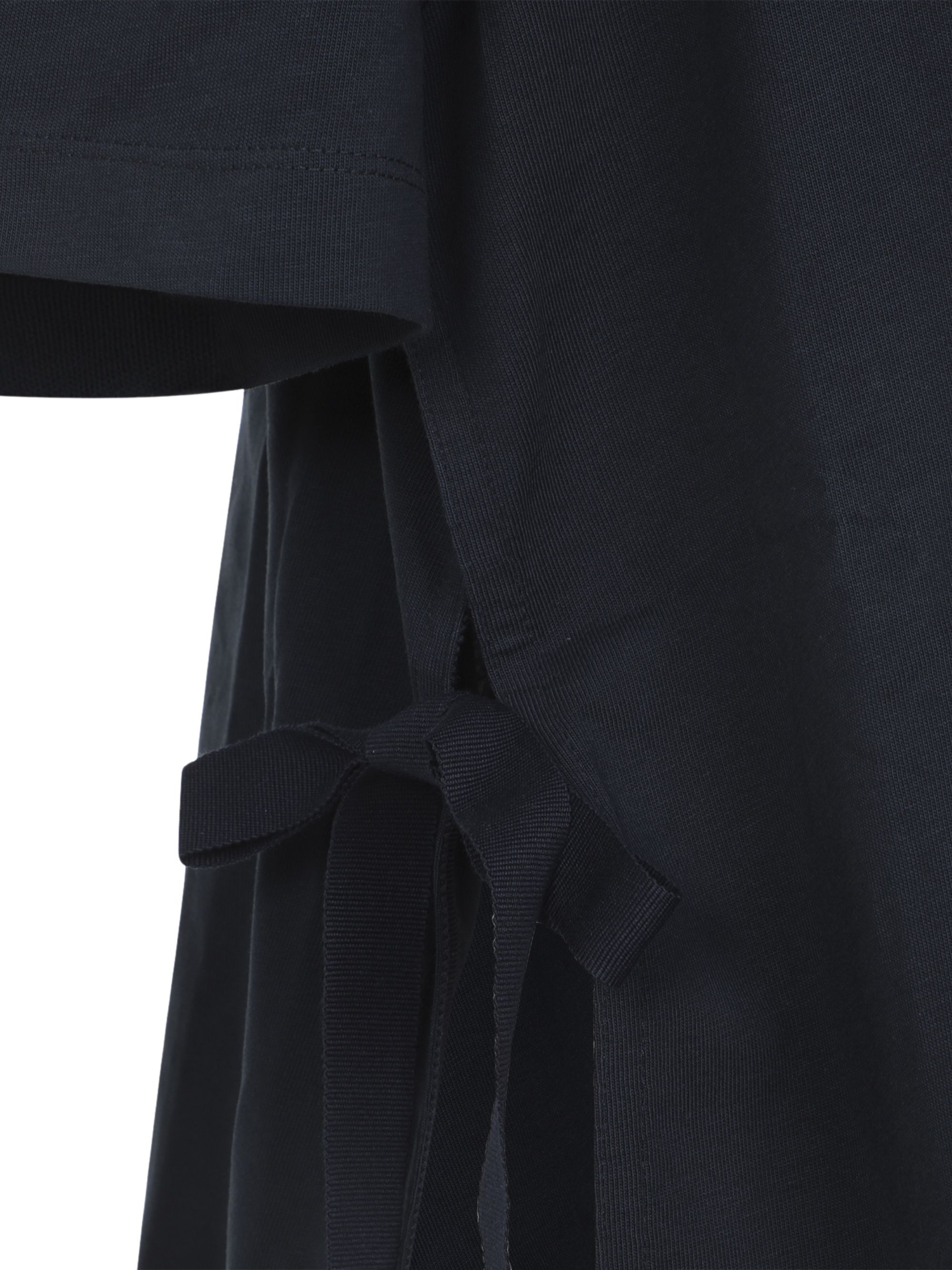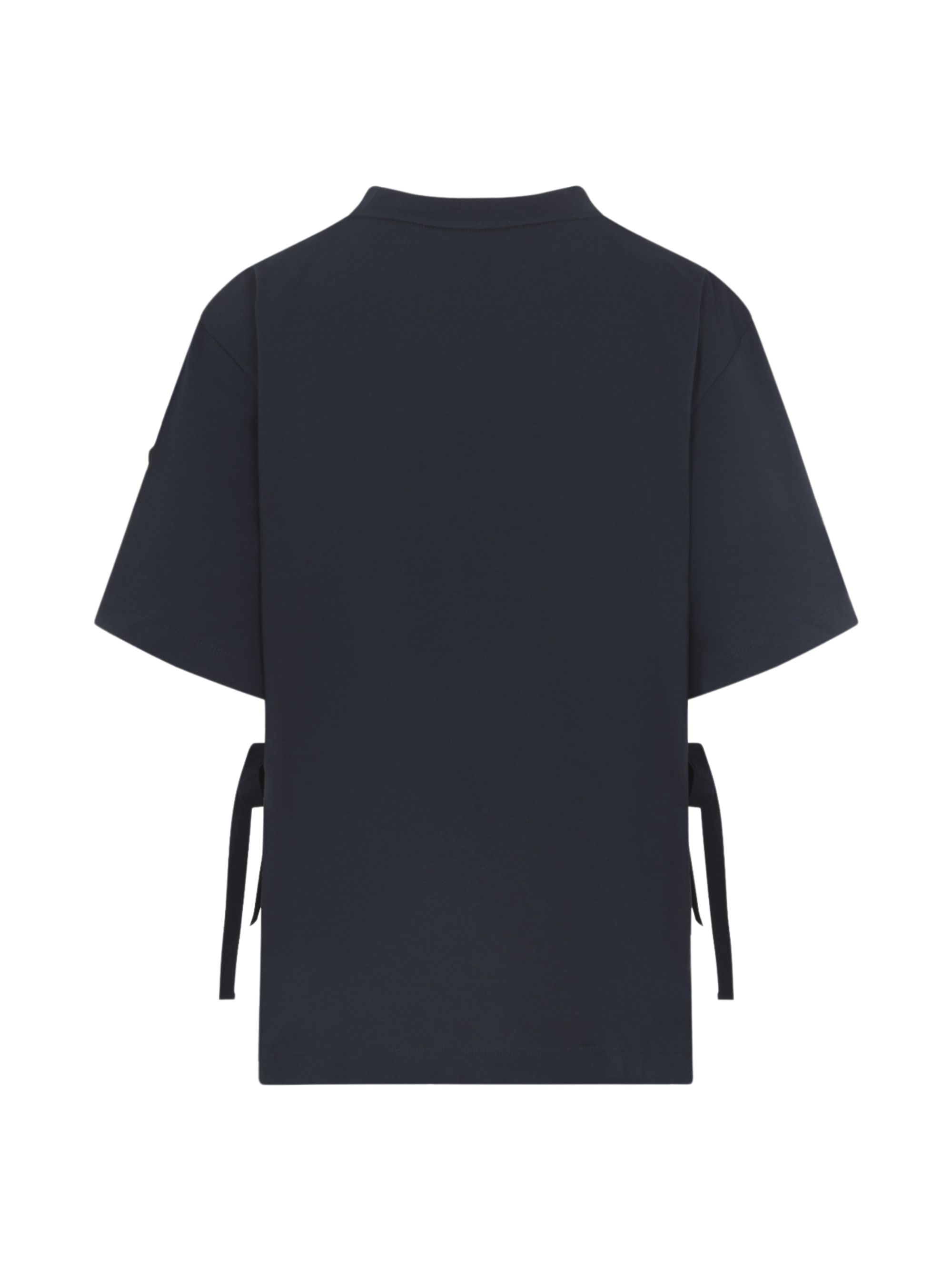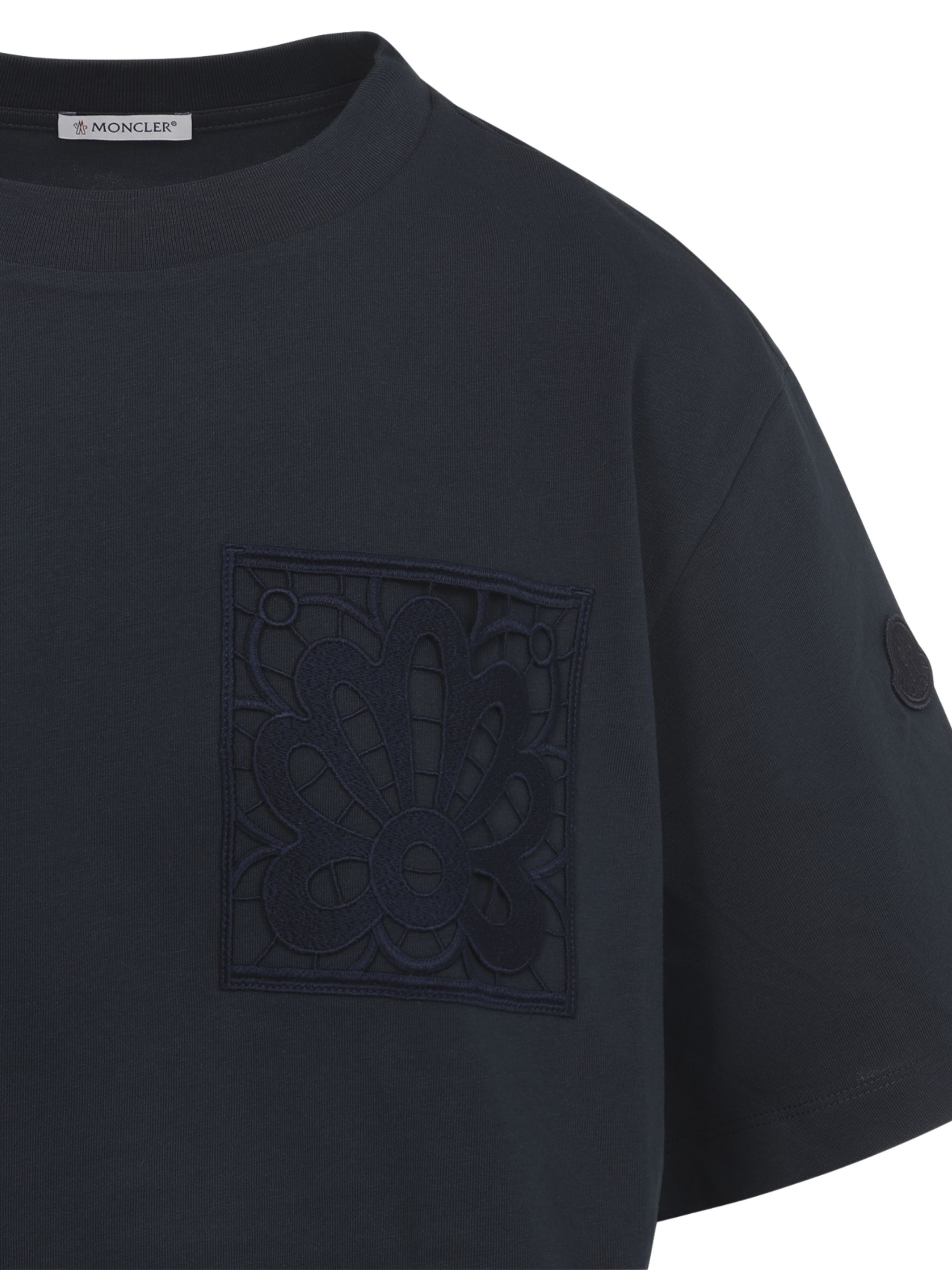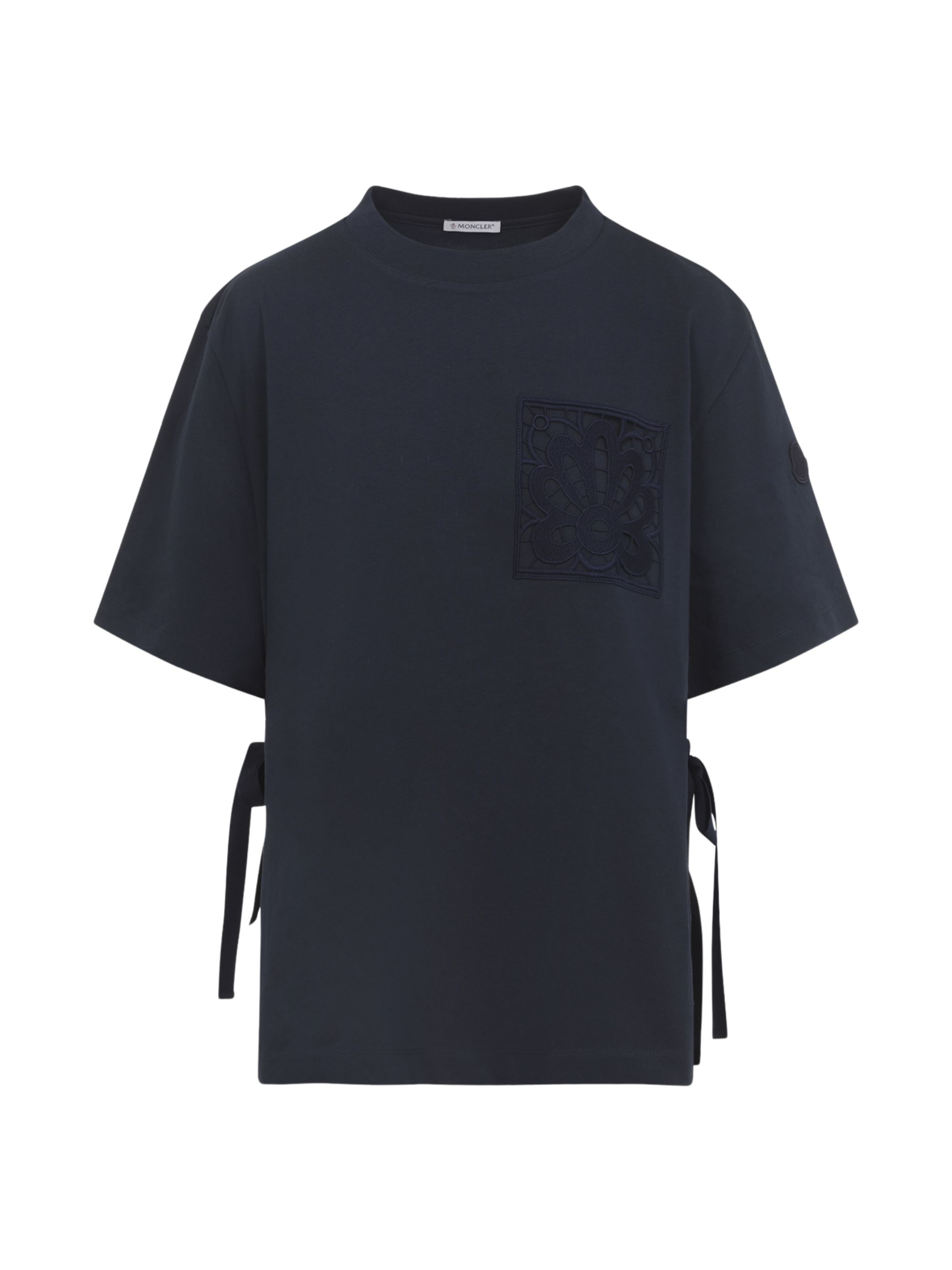 MONCLER embroidered T-shirt in blue cotton, featuring a crew neck, short sleeves, embroidery on the chest, logo on the sleeve and side slits with laces.