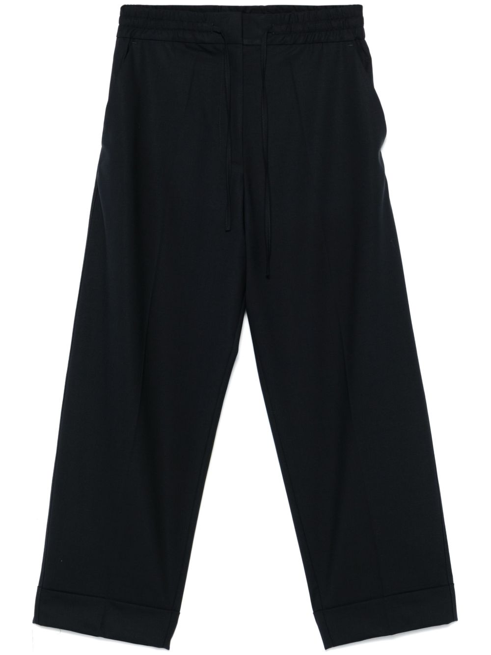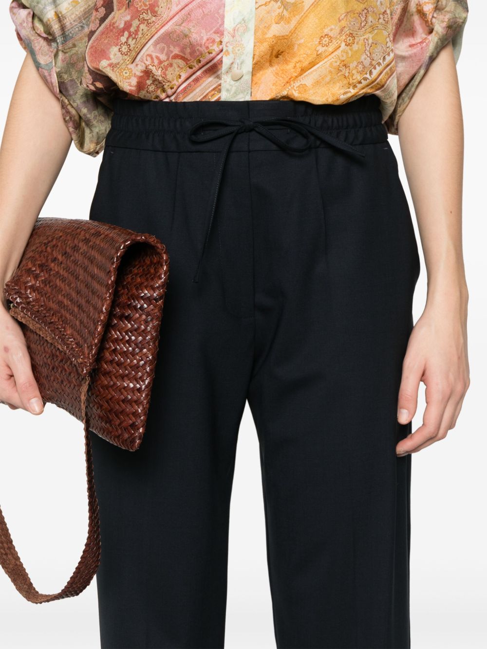 P.A.R.O.S.H. Bleach trousers navy blue virgin wool dress with diagonal side pockets, back welt pocket, elasticated drawstring waist and hidden front fastening with button, hook and zip.