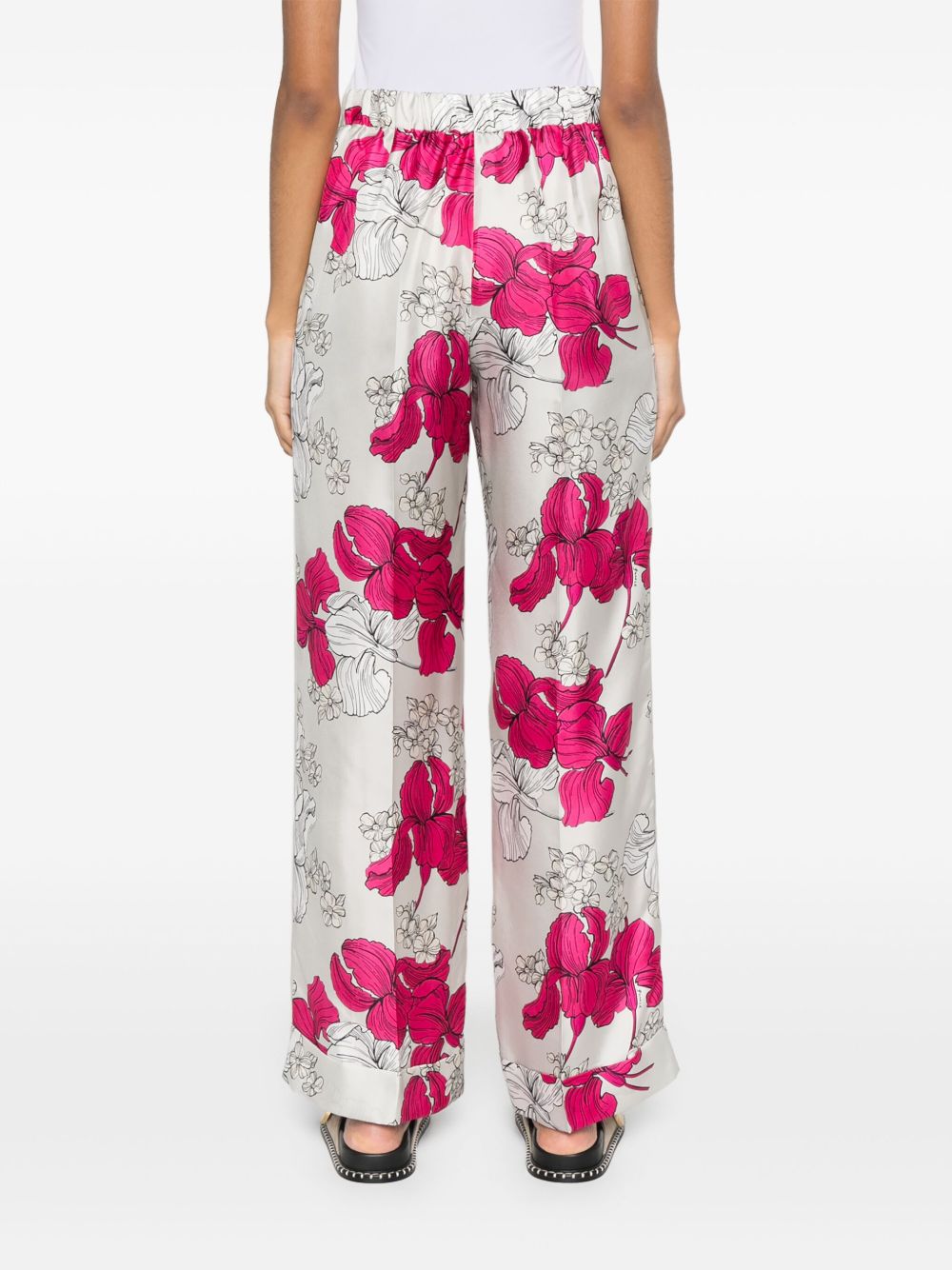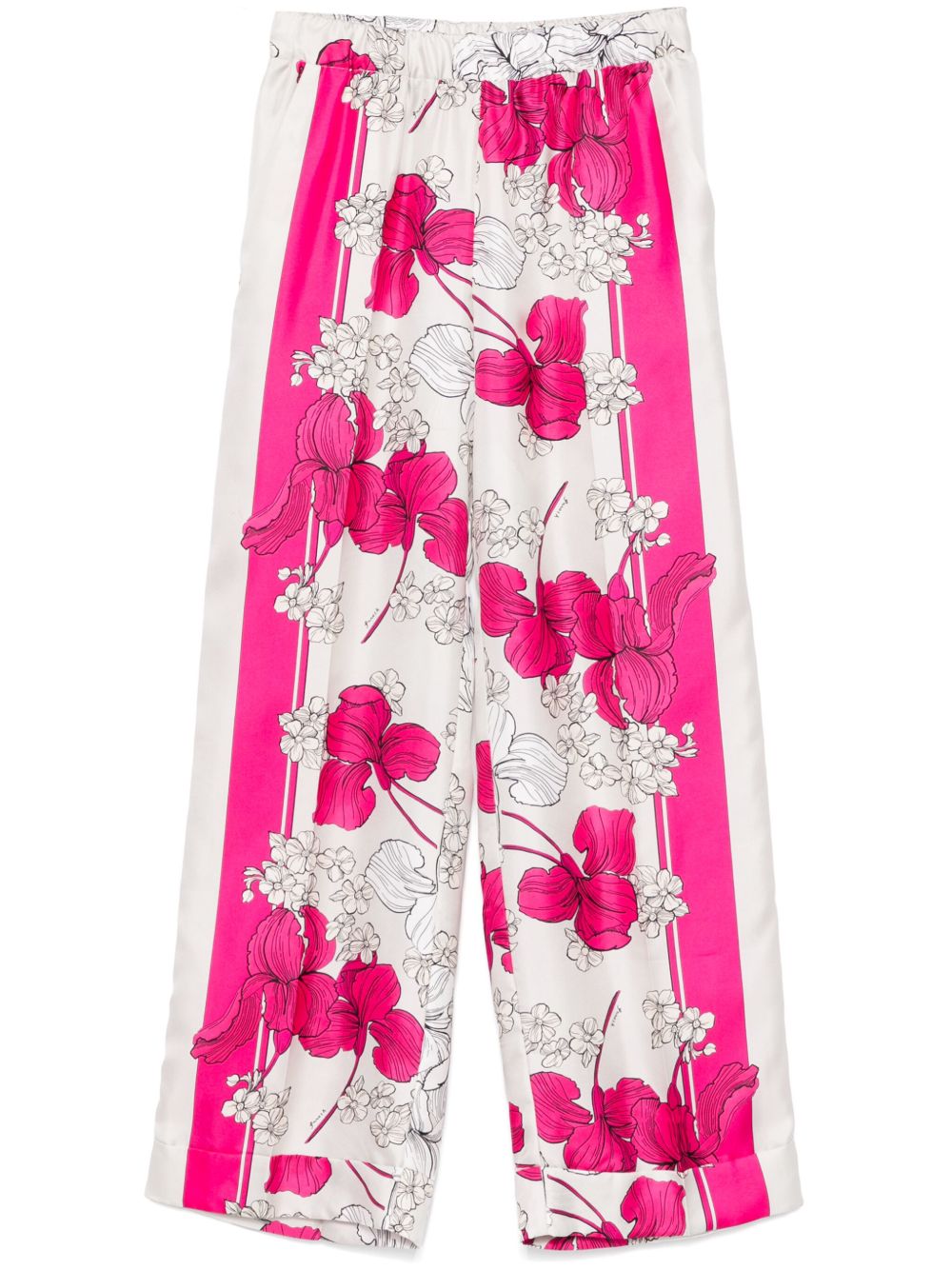 Serenella trousers by P.A.R.O.S.H. in white and fuchsia with floral print, slanted side pockets and elasticated waist.