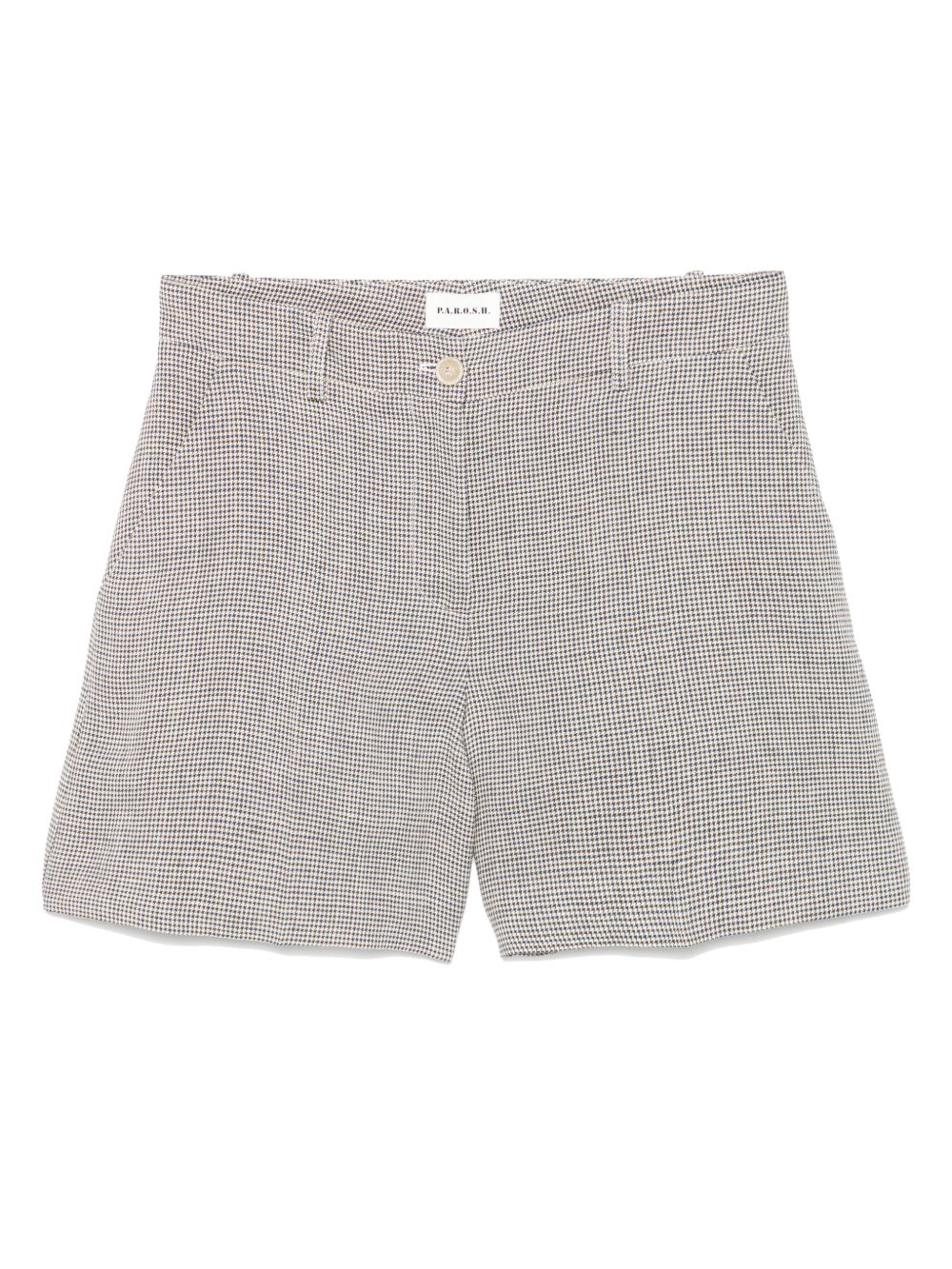 Bambu Shorts by P.A.R.O.S.H. in white and grey linen featuring a checked print, belt loops and zip and button fastening.