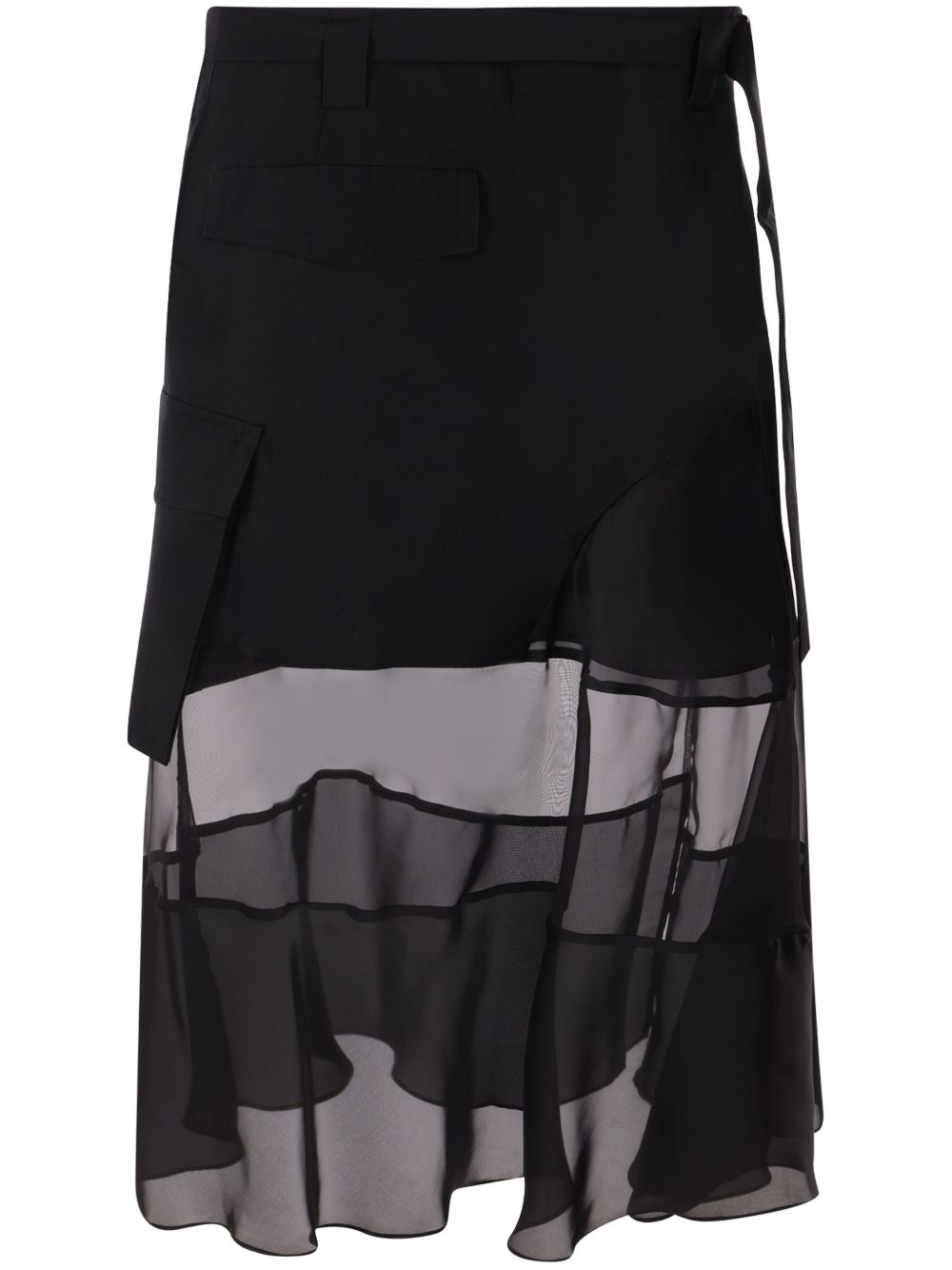SACAI black asymmetric midi skirt with belt loops, flared hem, side flap pockets and adjustable, removable waist belt.
