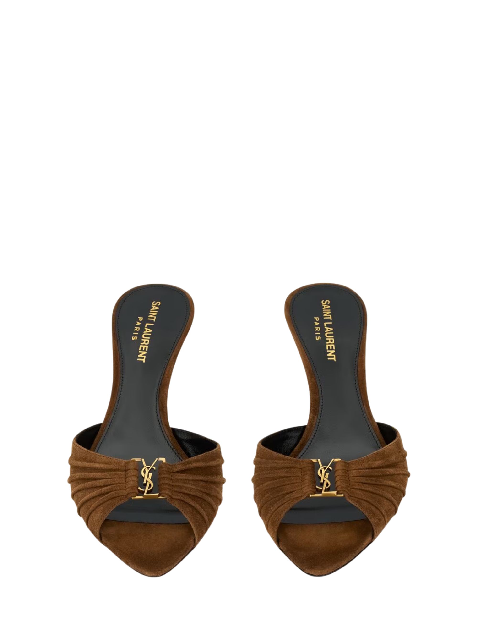 Brown suede mules by SAINT LAURENT featuring a narrow heel, a deep-toe, and a gathered upper decorated with the Cassandre logo.