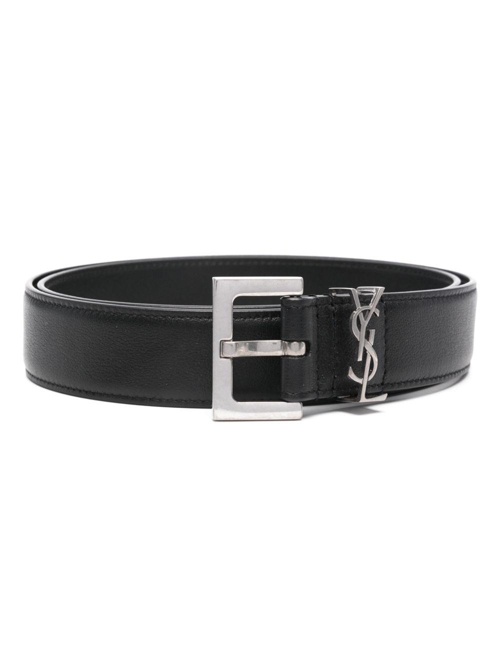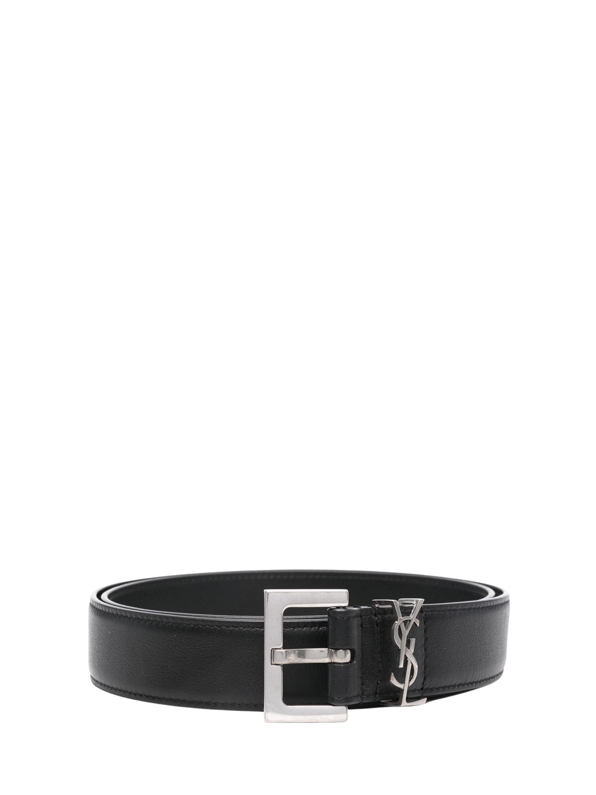 Cassandre belt by SAINT LAURENT in black leather, featuring silver hardware and an adjustable square buckle.