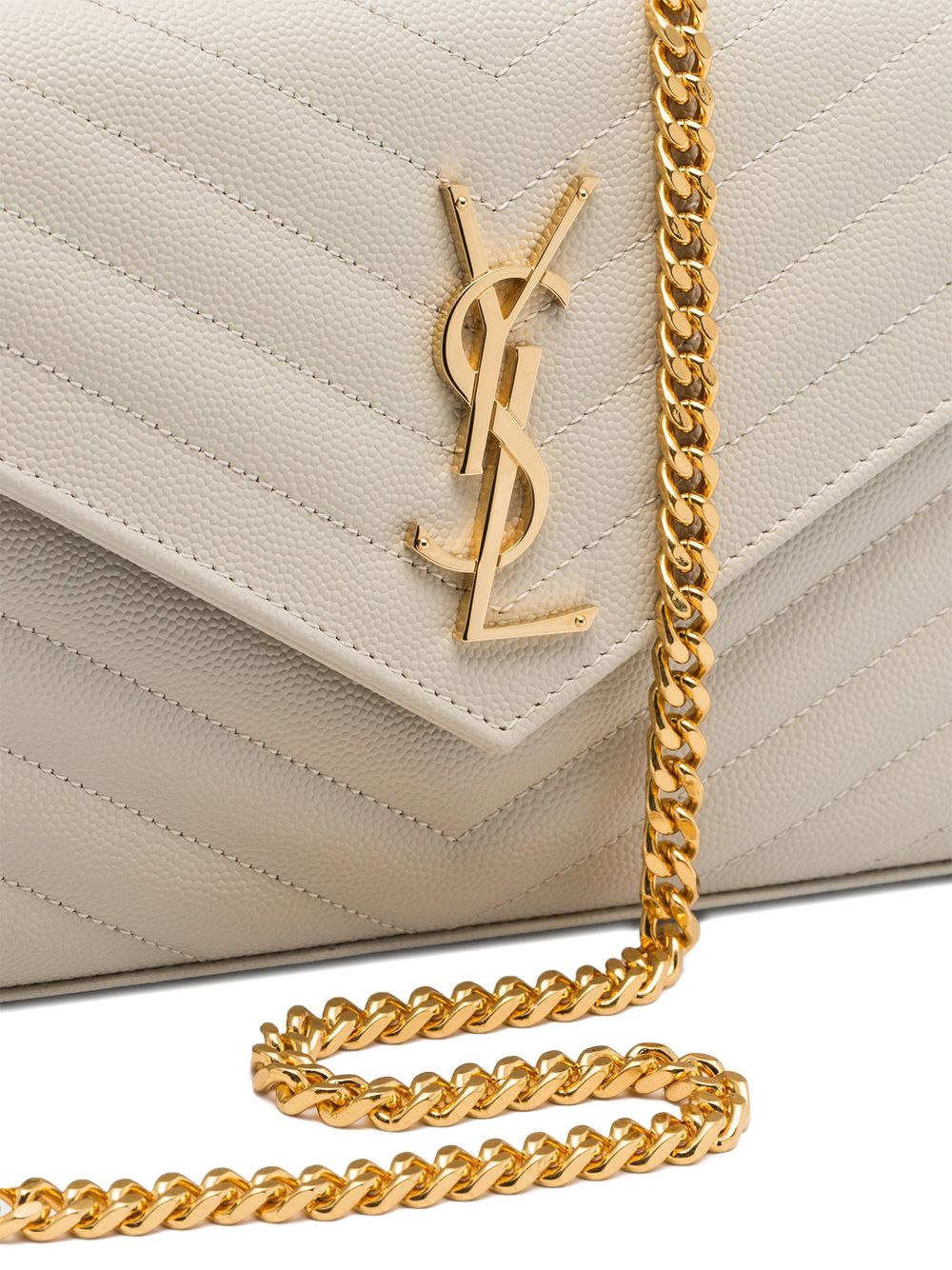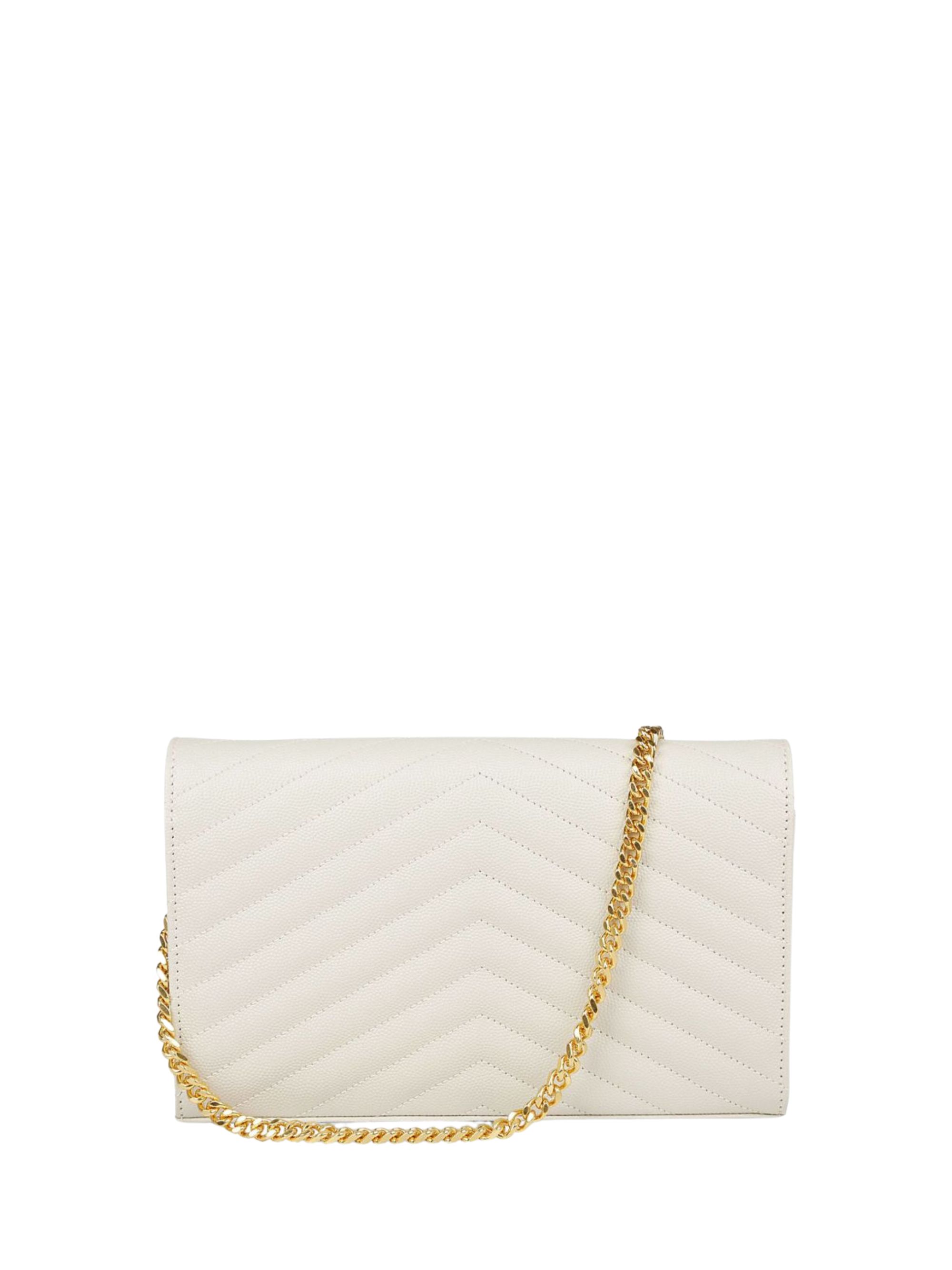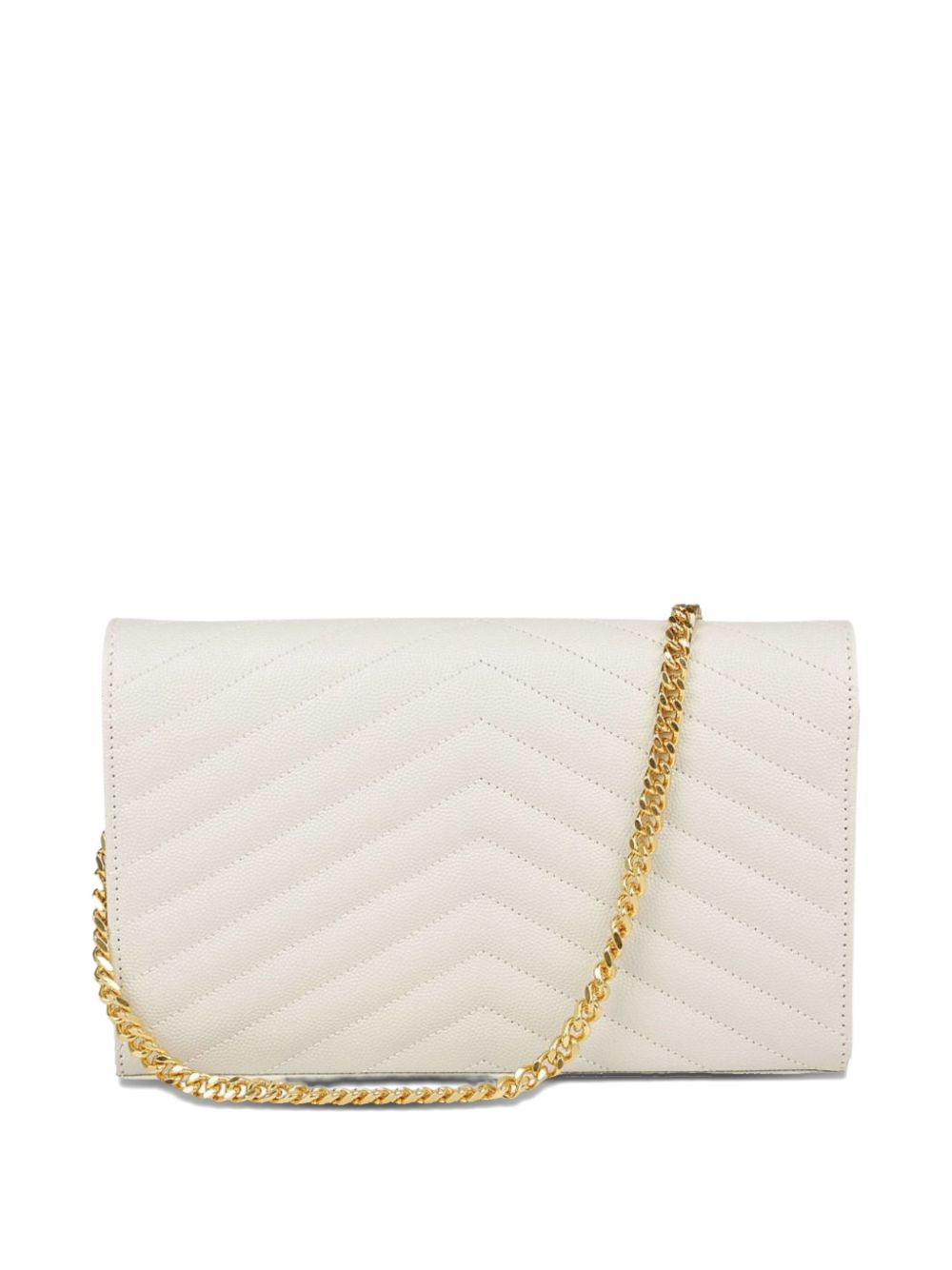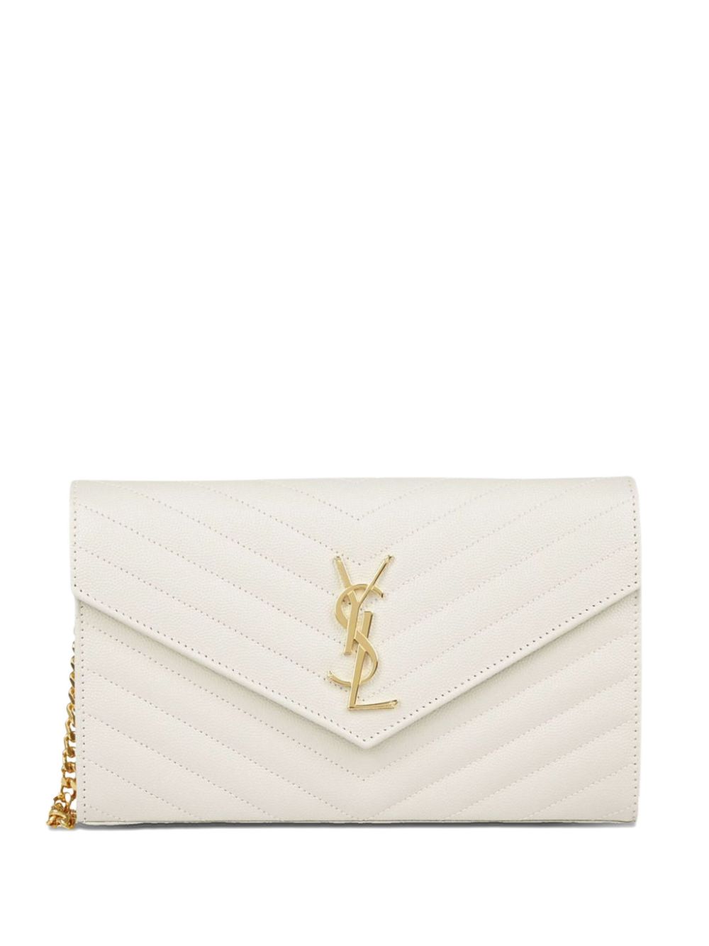 SAINT LAURENT Cassandre chain clutch in white leather, featuring gold-tone hardware, a button closure, ten card slots, a removable chain shoulder strap, a YSL signature, and a zip pocket. Dimensions: 22 x 14 x 4 cm.
