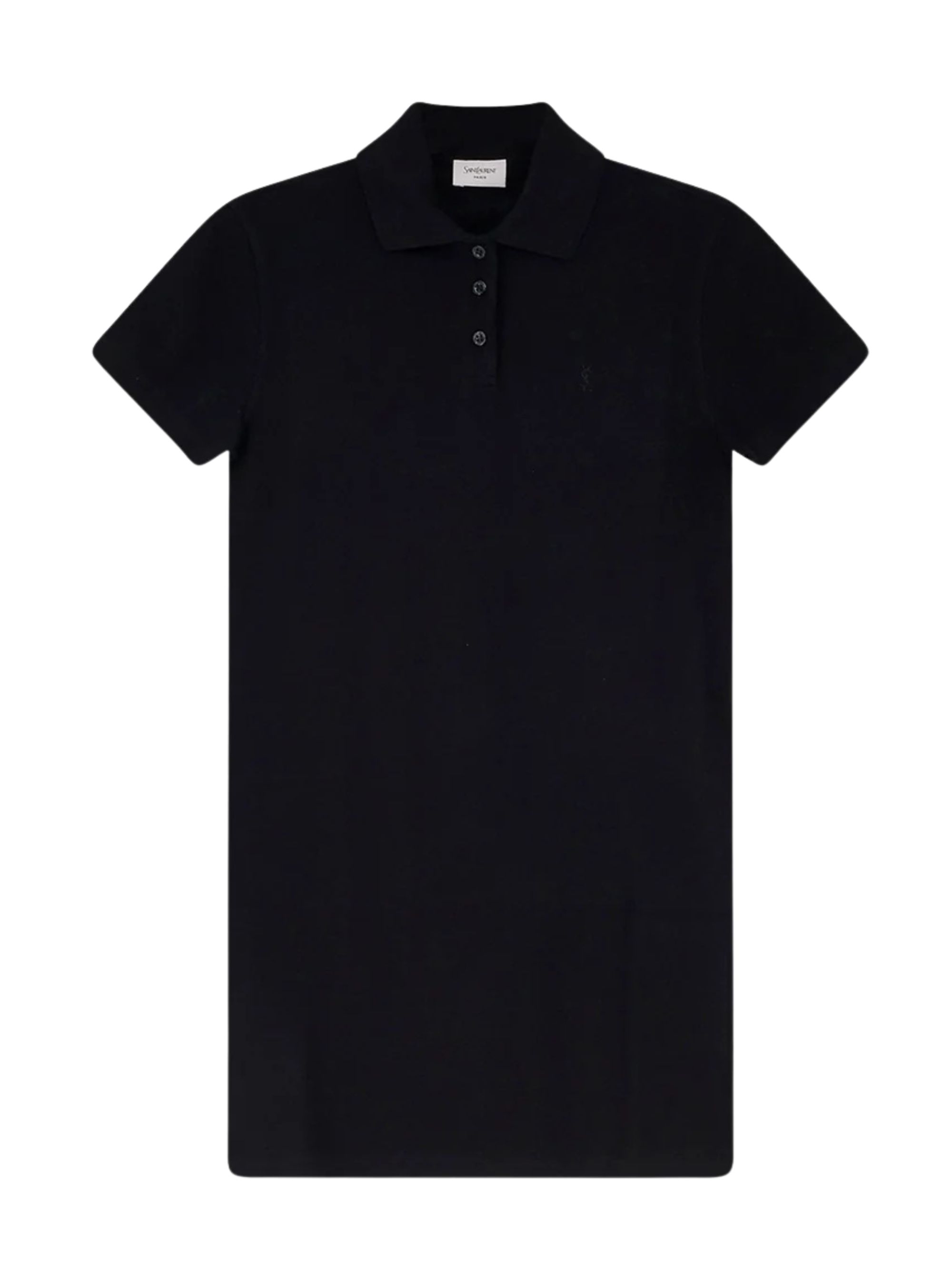 Cassandre dress by SAINT LAURENT in black cotton, featuring a pointed collar, three-button polo fastening, short sleeves, Cassandre embroidery on the chest and a regular fit.