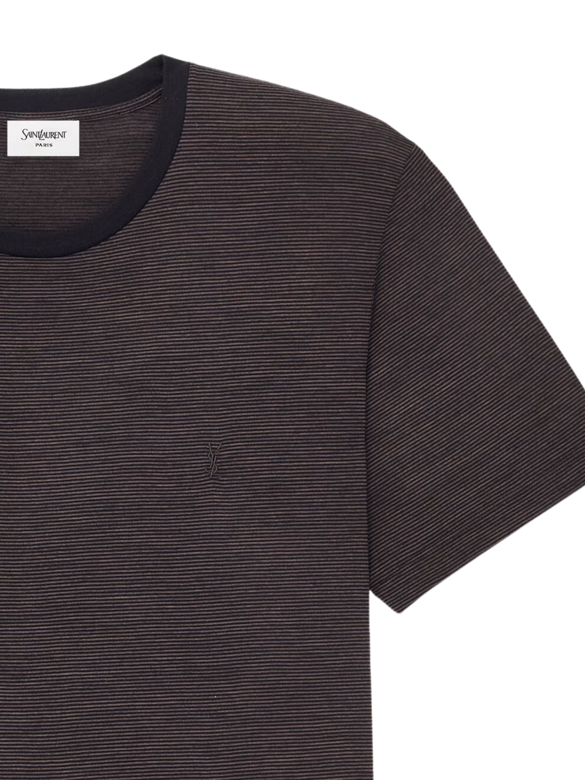 Cassandre T-shirt by SAINT LAURENT in black striped wool, featuring Cassandre embroidery on the chest, crew neck and short sleeves.