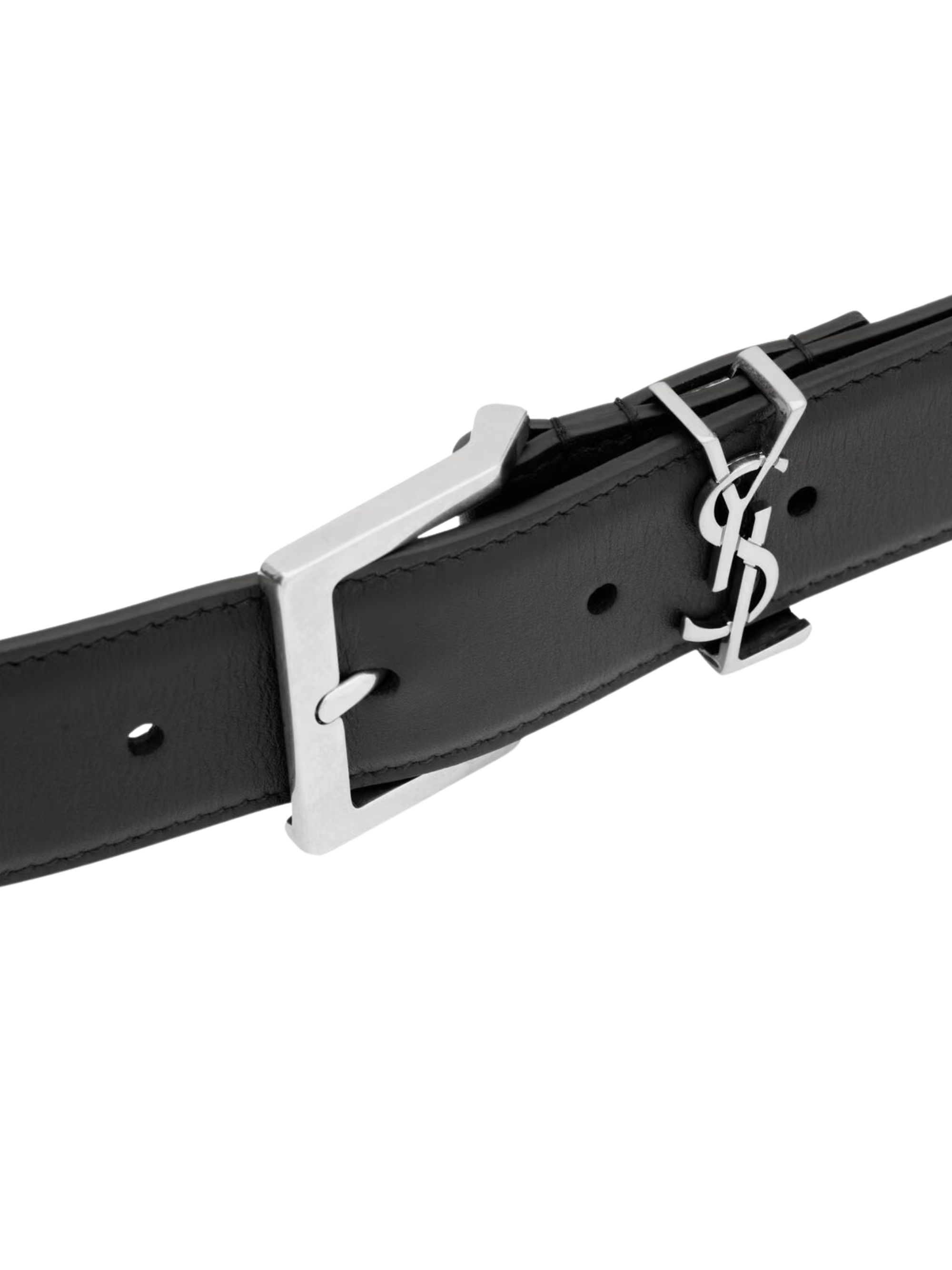 Cassandre Vadim belt by SAINT LAURENT in black leather, featuring a square buckle, a Cassandre loop in silver-tone metal and a loop with YSL lettering.