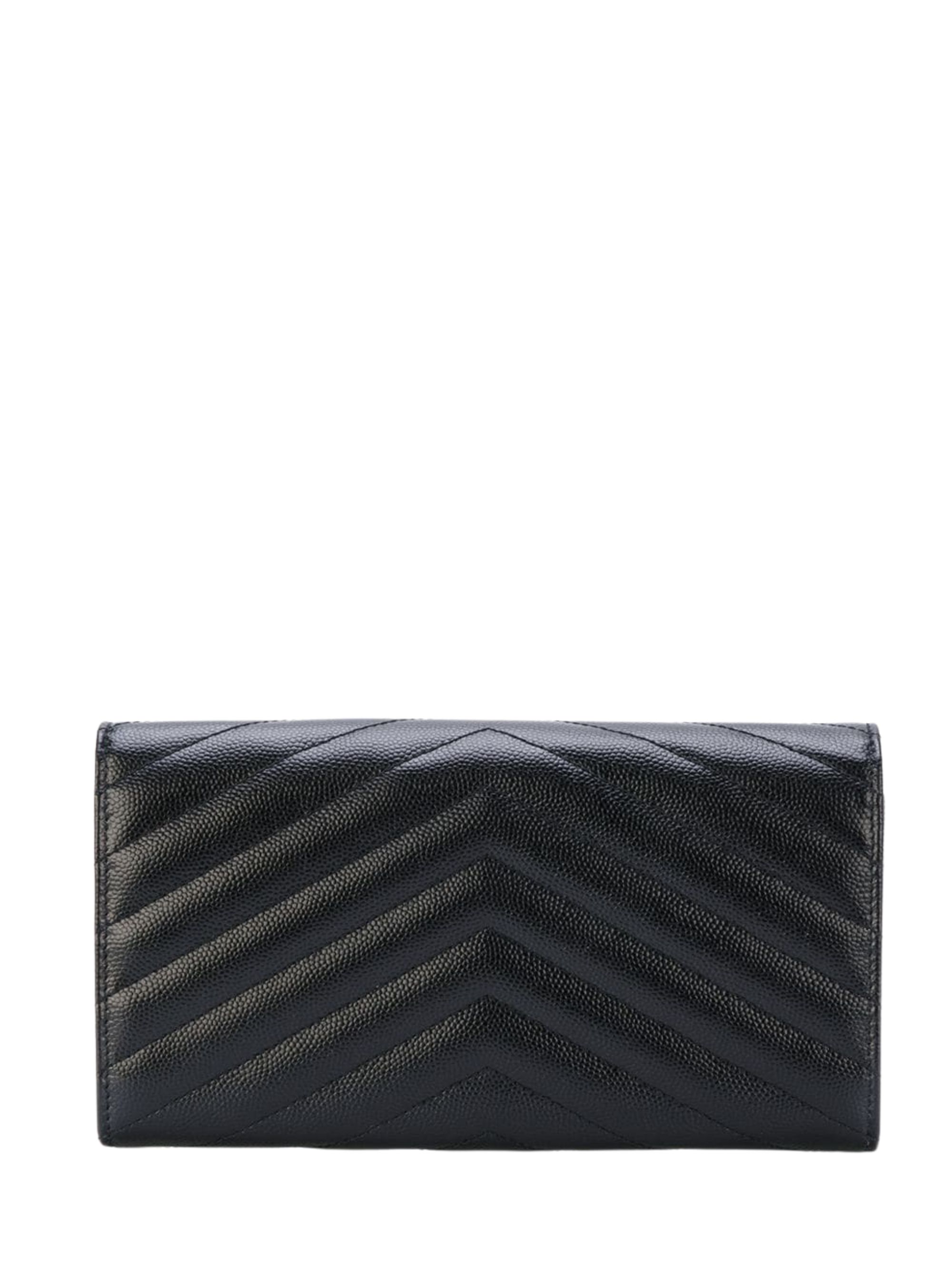 SAINT LAURENT large Cassandre wallet in black quilted leather, featuring a snap closure, twelve card slots, four billfold slots, a zip coin pocket, and a YSL logo.